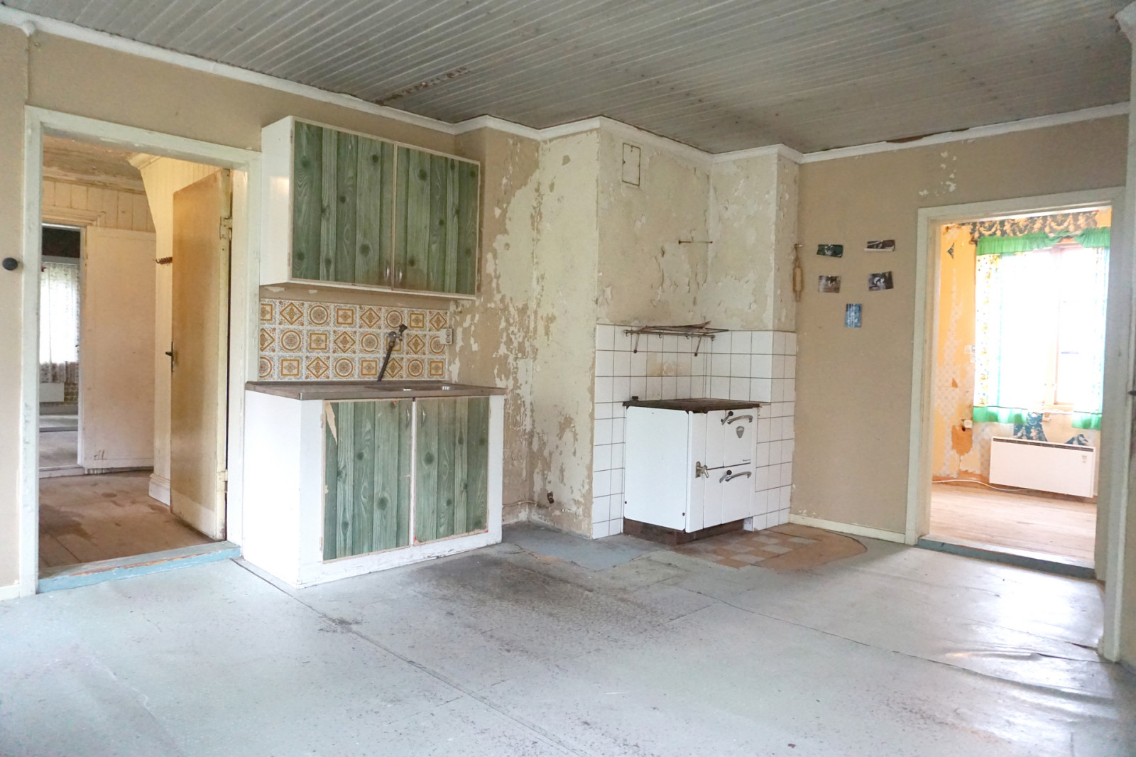 Äldre fd. kök: Ett rymligt rum där den gamla vedspisen finns kvar. Fina trägolv och tapetserade väggar. Intill köket finns ett skafferi med hyllplan.