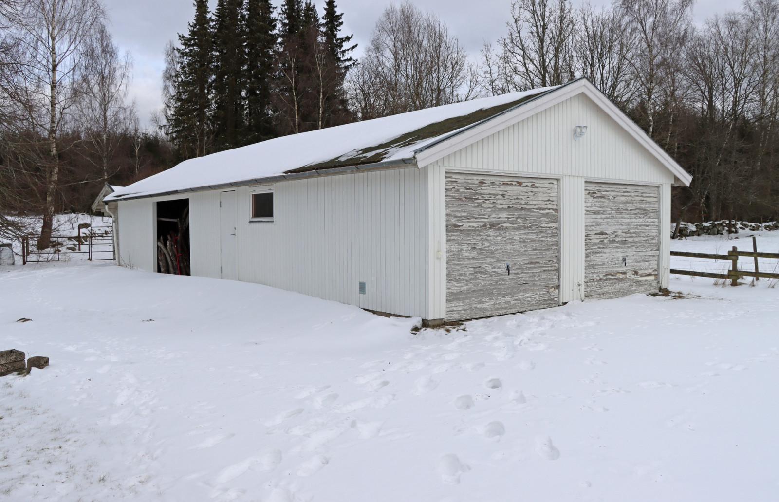 I anslutning till bostadshuset ligger dubbelgaraget, med plats för två personbilar samt förvaringsutrymme. Uppskattad byggyta 80 m².