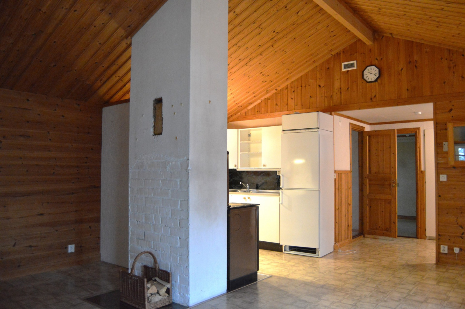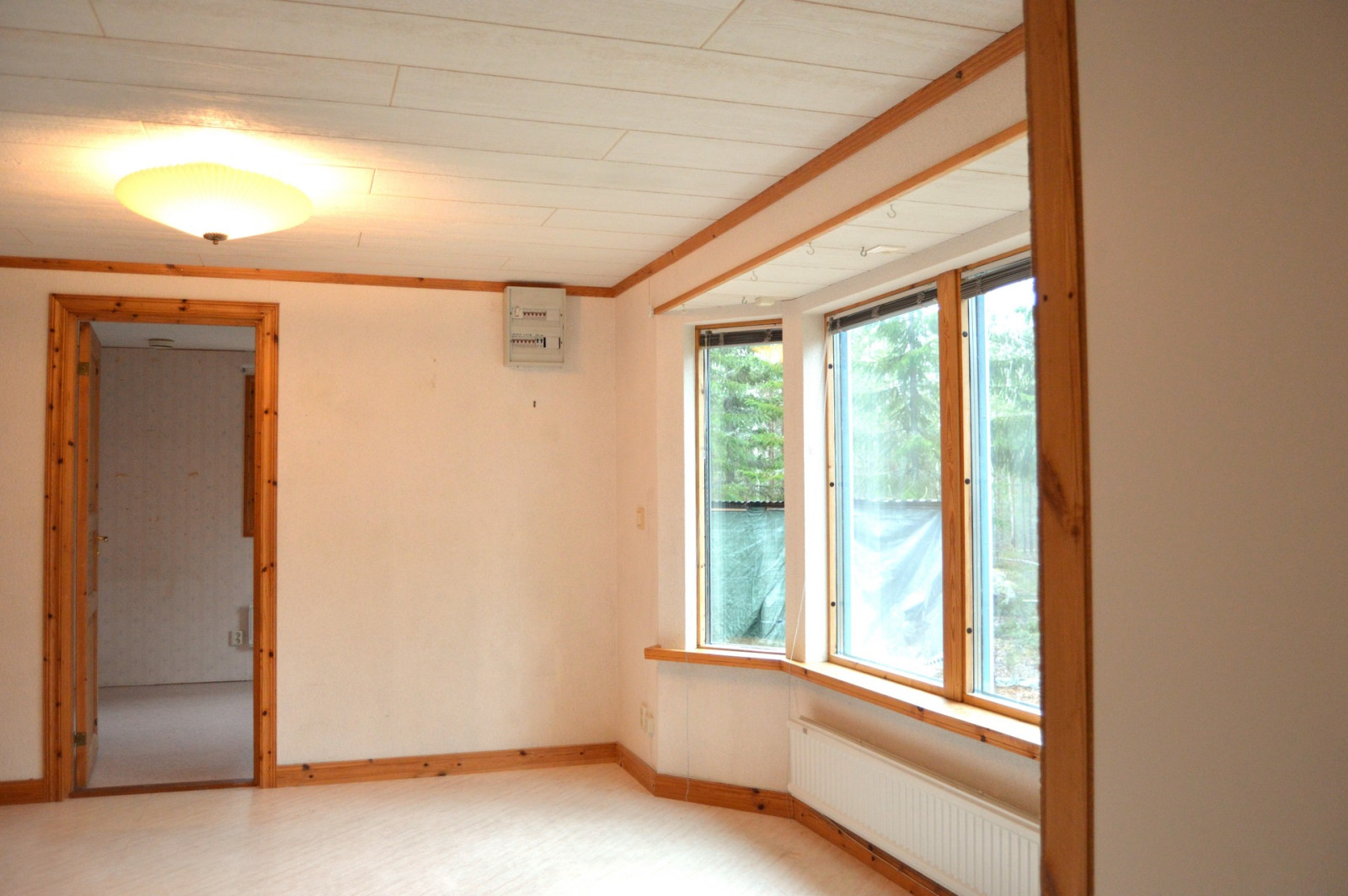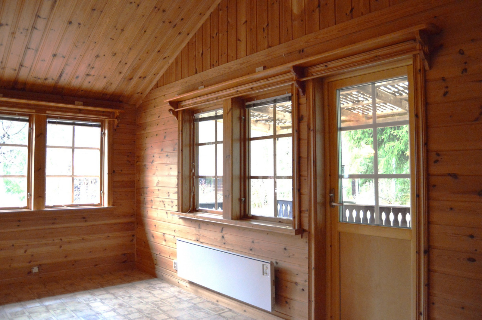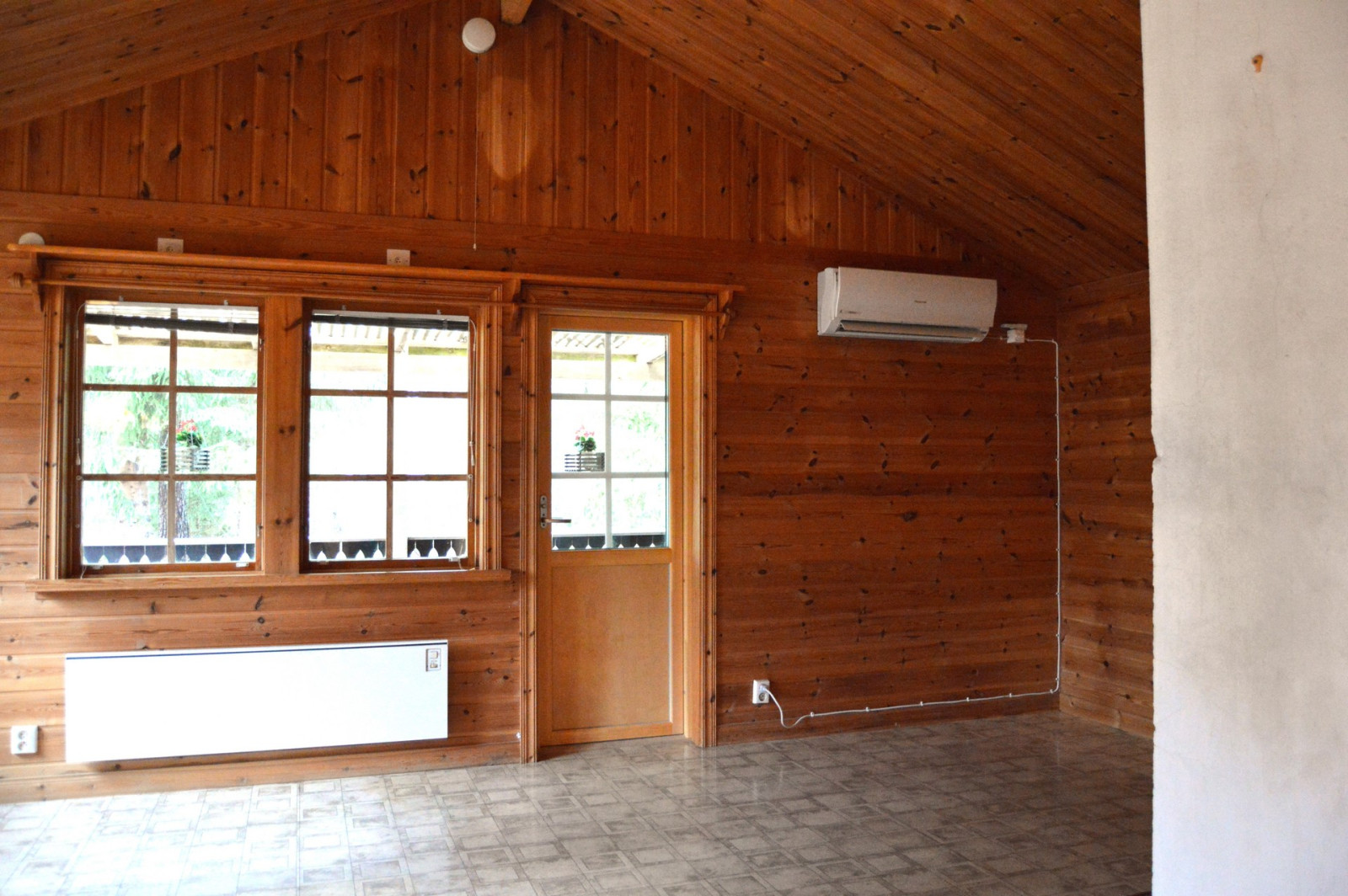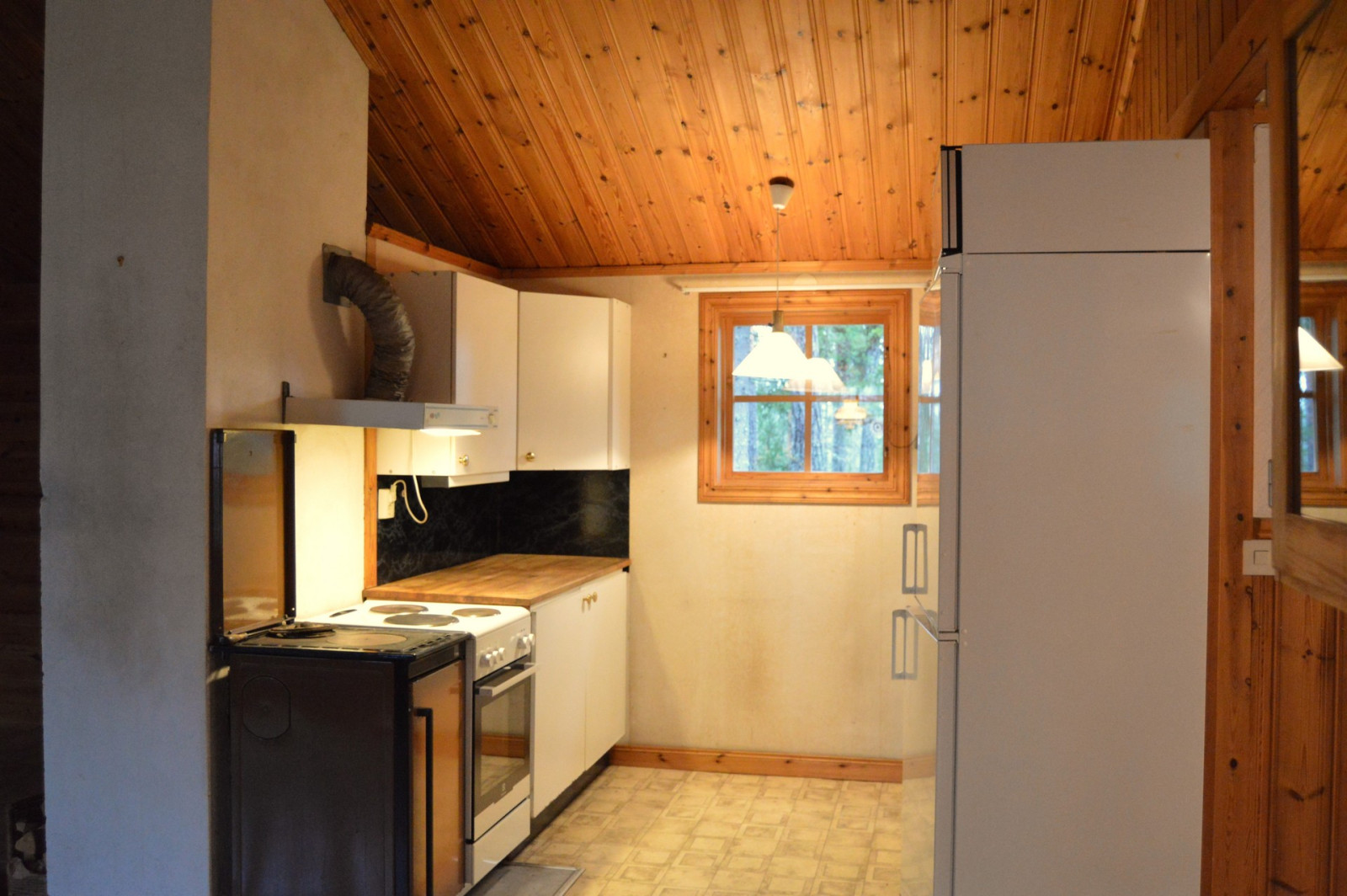 Entré via hall som leder till badrum, sovrum samt kök och allrum beläget till vänster. Köket har äldre vita skåpluckor, arbetsbänk i trä, 50 cm spis samt kombinerad kyl/frys. Bredvid spisen finns en vedeldad spis som skapar både värme och trivsel. Köket ligger i en öppen planlösning som en del av allrummet. I allrummet finns utöver matplats även en avskild del bakom murstocken där det är förberett för ytterligare en eldstad. Furupanel på väggar och tak ger rummet en ombonad, varm karaktär. Från allrummet nås även en altan på ca 10 kvadratmeter.