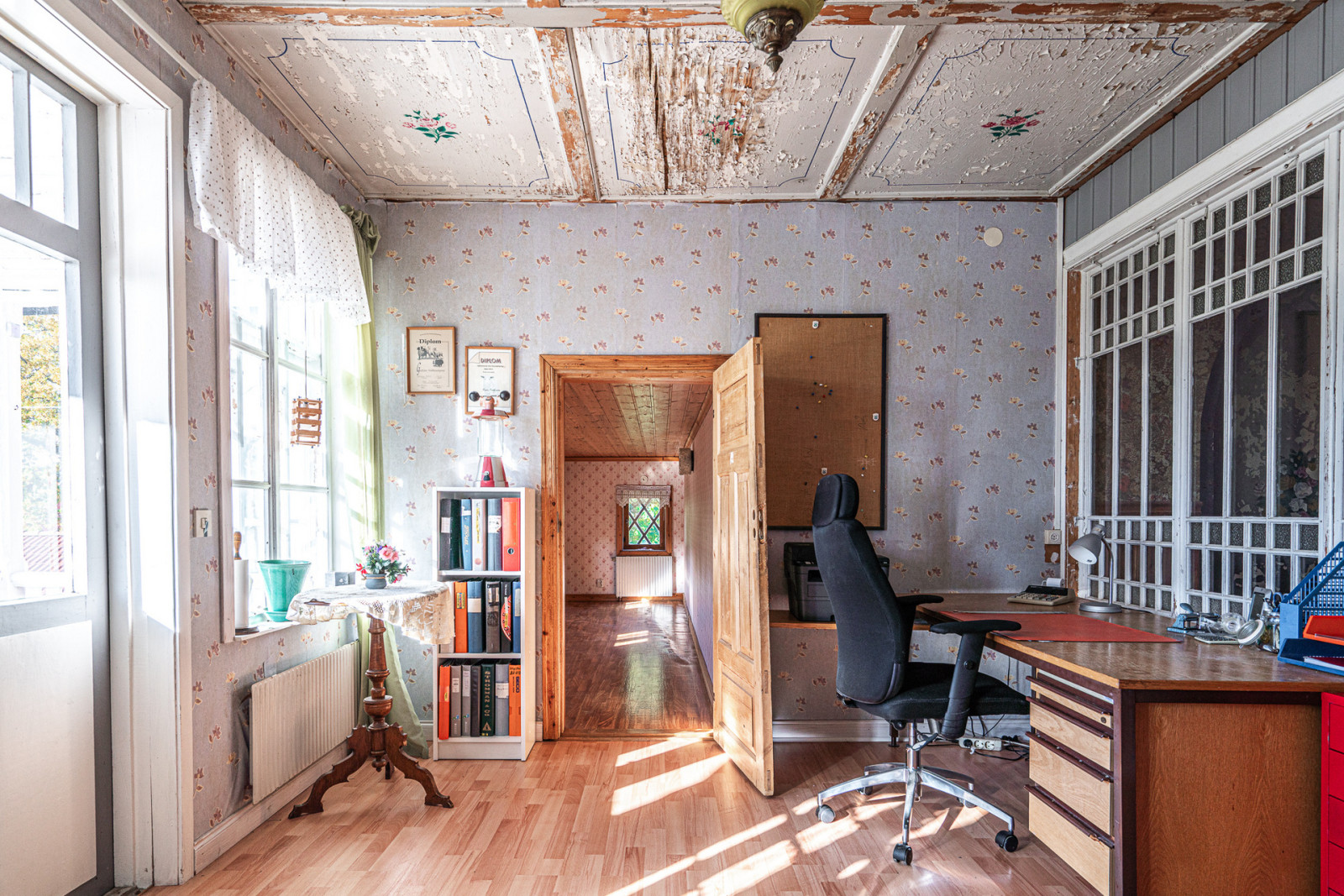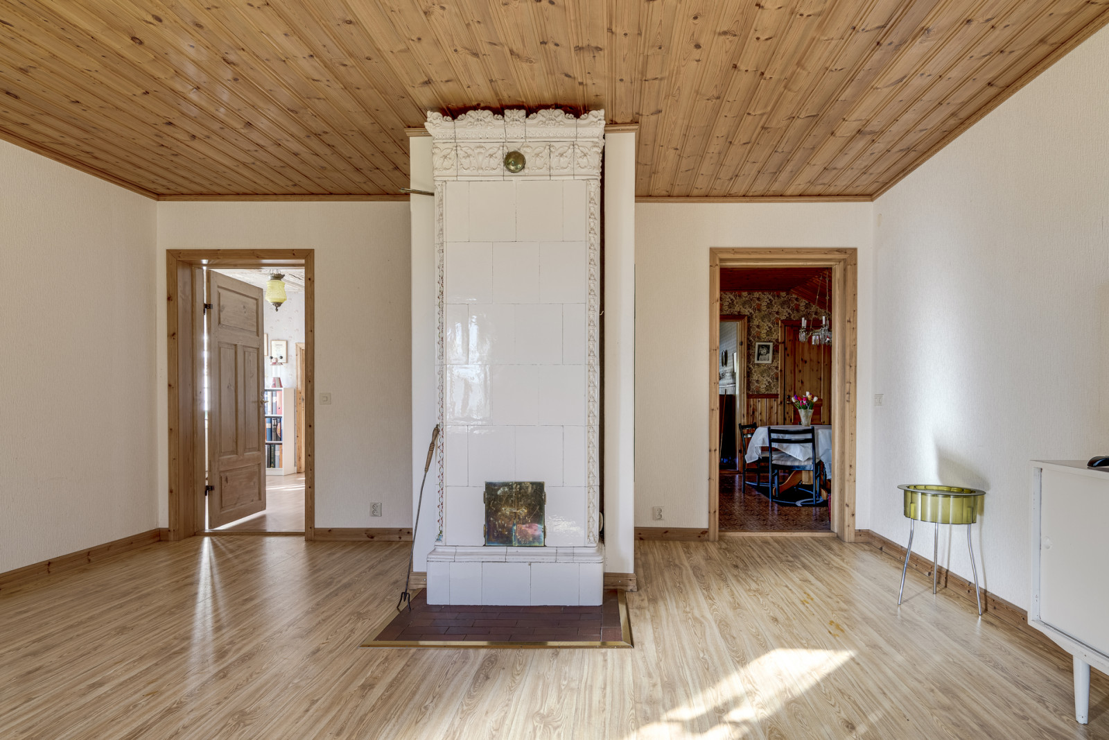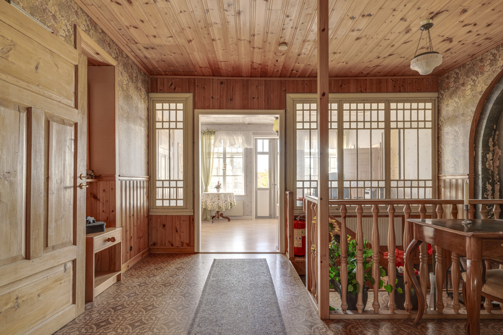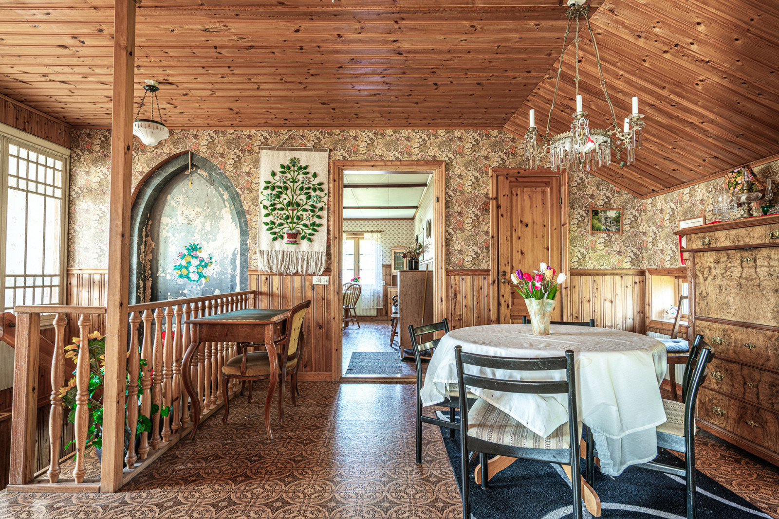 Ovanvåning rymmer kontor, sovrum, möblerbar hall, balkong, äldre kök och badrum som behöver moderniseras. Boytan uppgår enligt taxeringsuppgifter till 161 m². Till vänster om entrén når du en mindre matkällare.