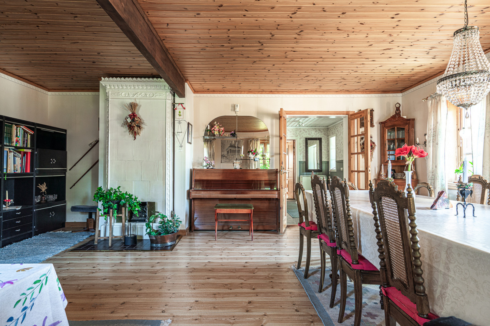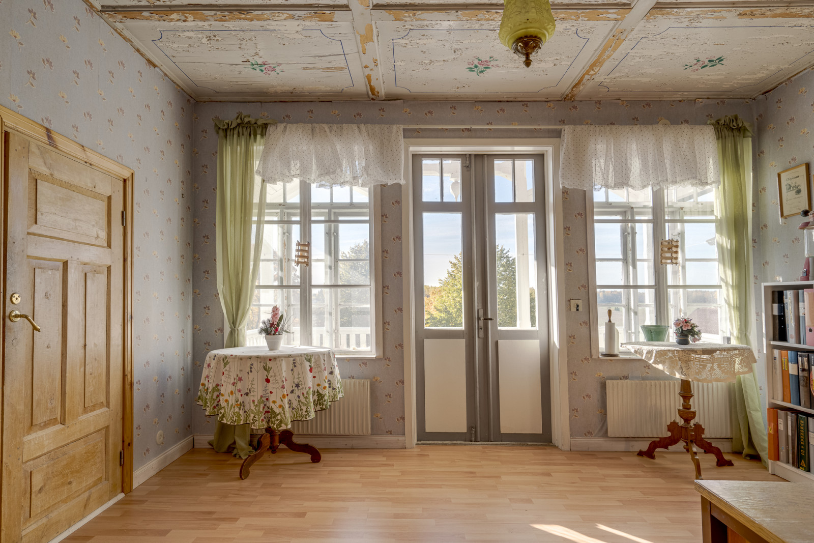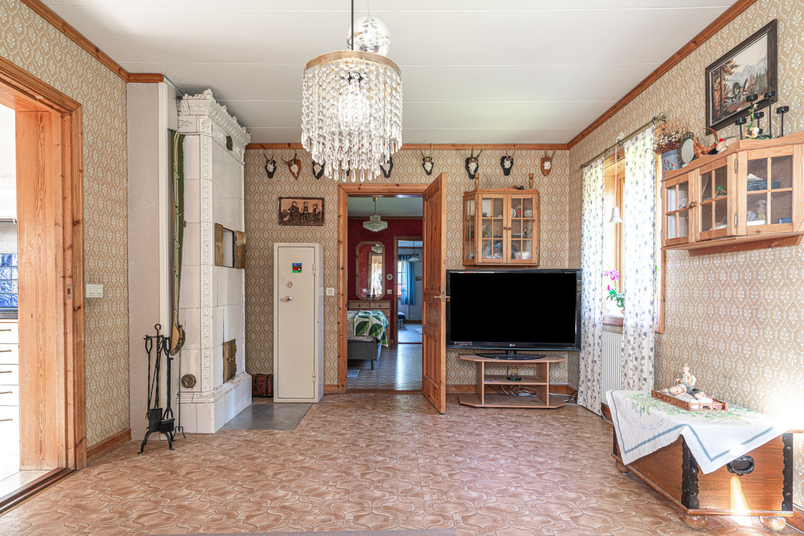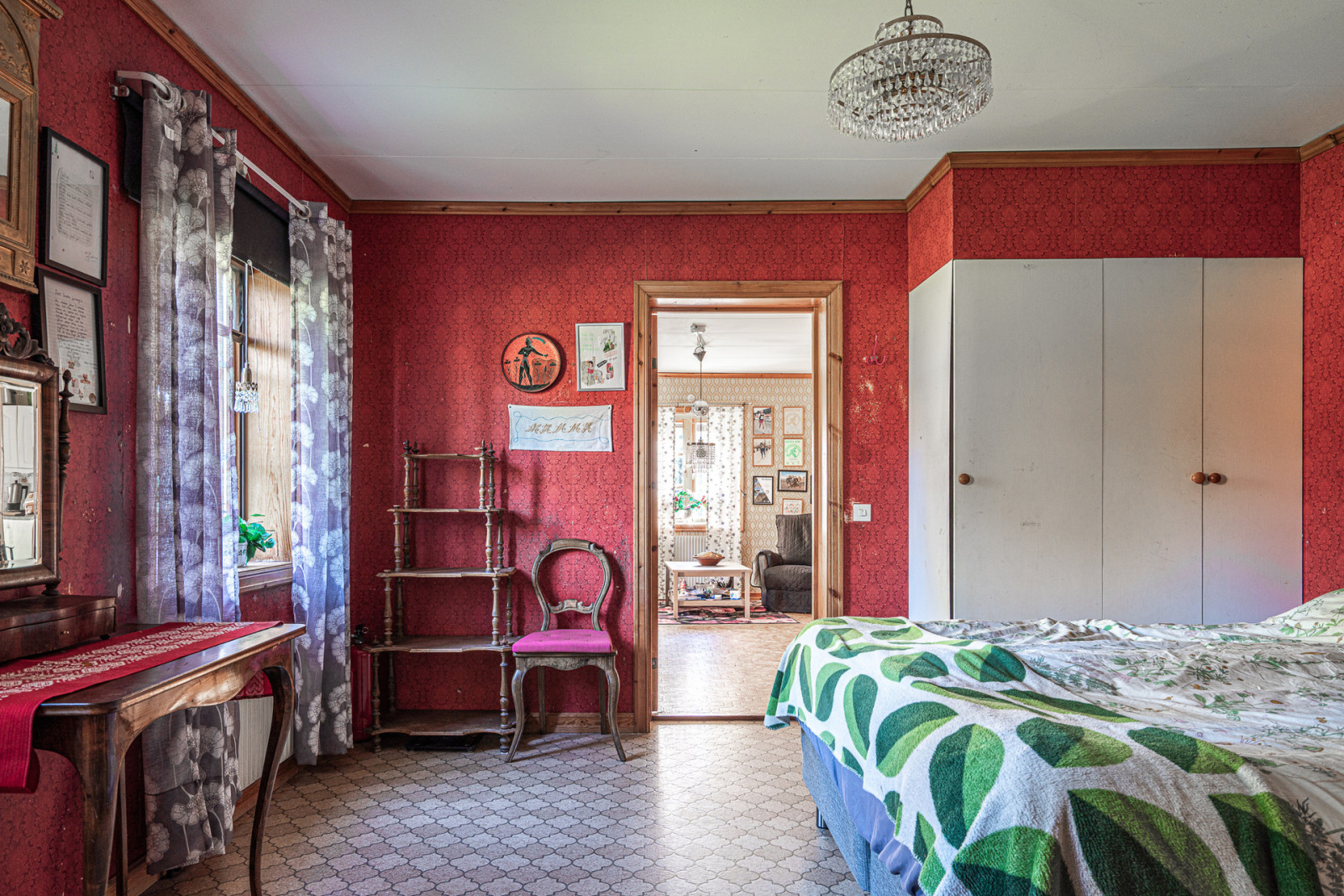 Ovanvåning rymmer kontor, sovrum, möblerbar hall, balkong, äldre kök och badrum som behöver moderniseras. Boytan uppgår enligt taxeringsuppgifter till 161 m². Till vänster om entrén når du en mindre matkällare.