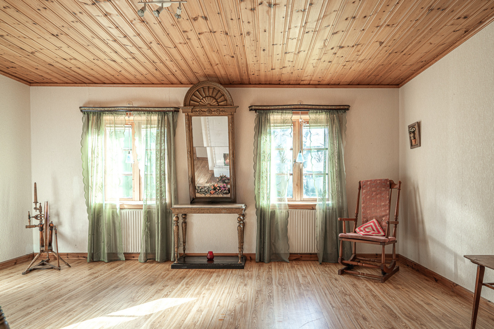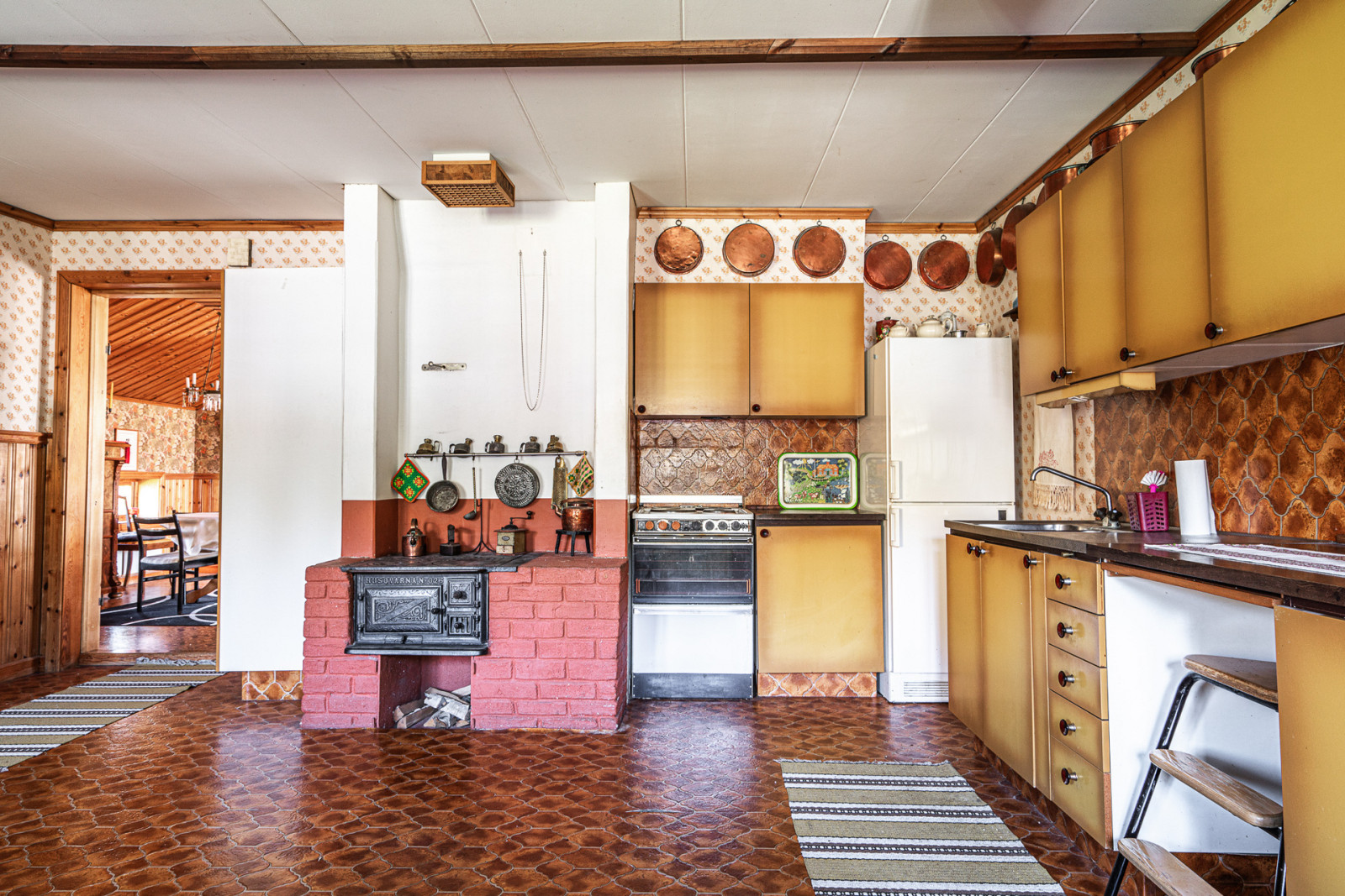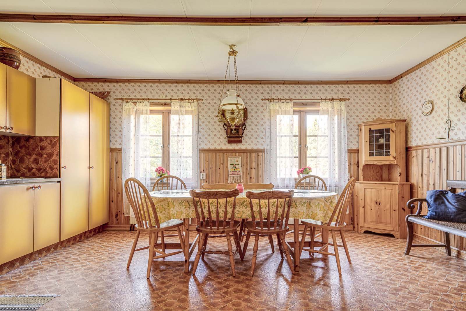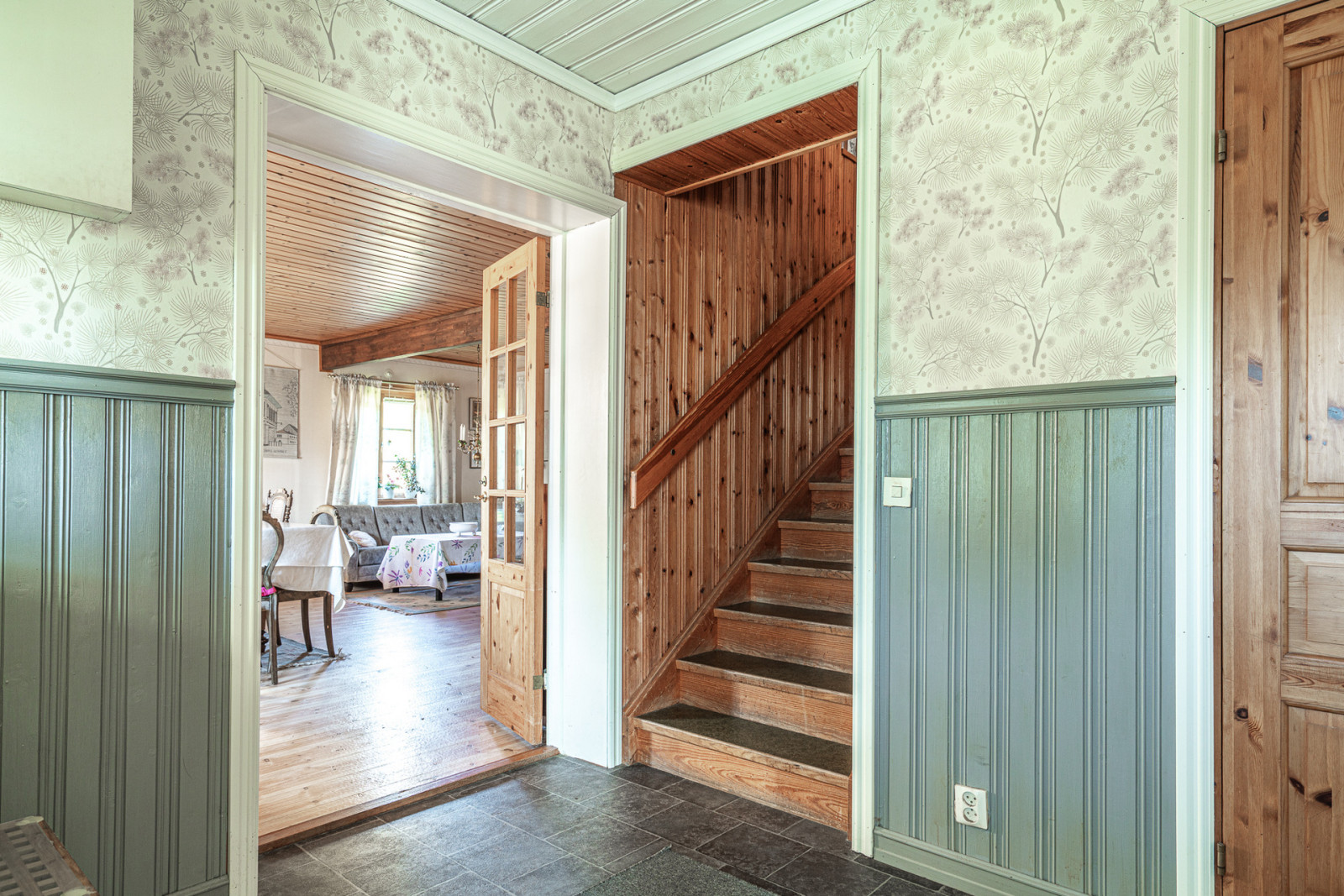Ovanvåning rymmer kontor, sovrum, möblerbar hall, balkong, äldre kök och badrum som behöver moderniseras. Boytan uppgår enligt taxeringsuppgifter till 161 m². Till vänster om entrén når du en mindre matkällare.