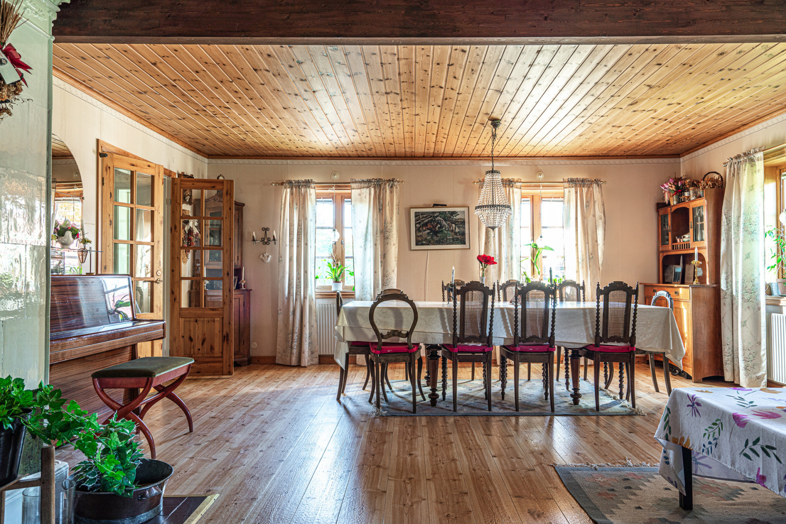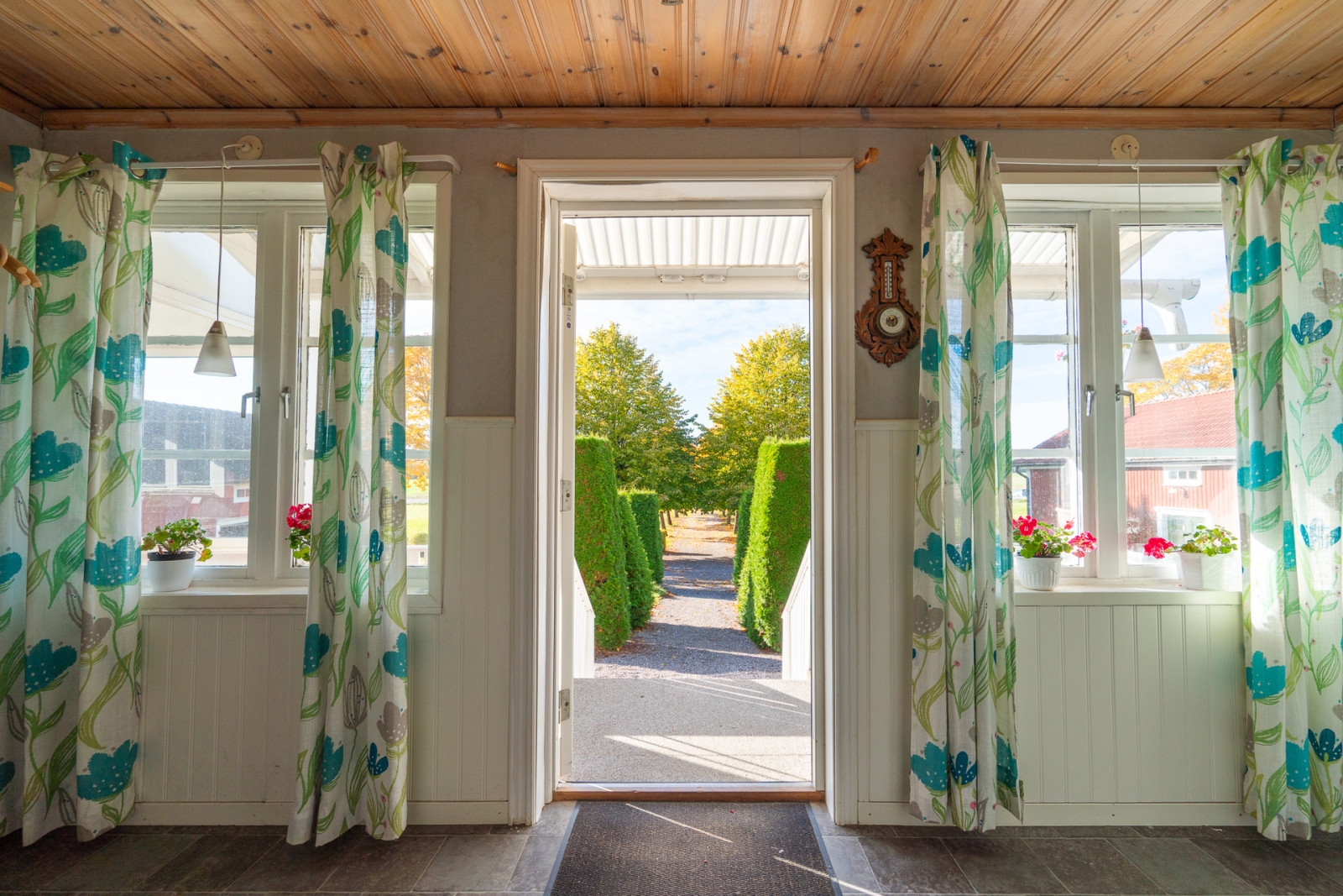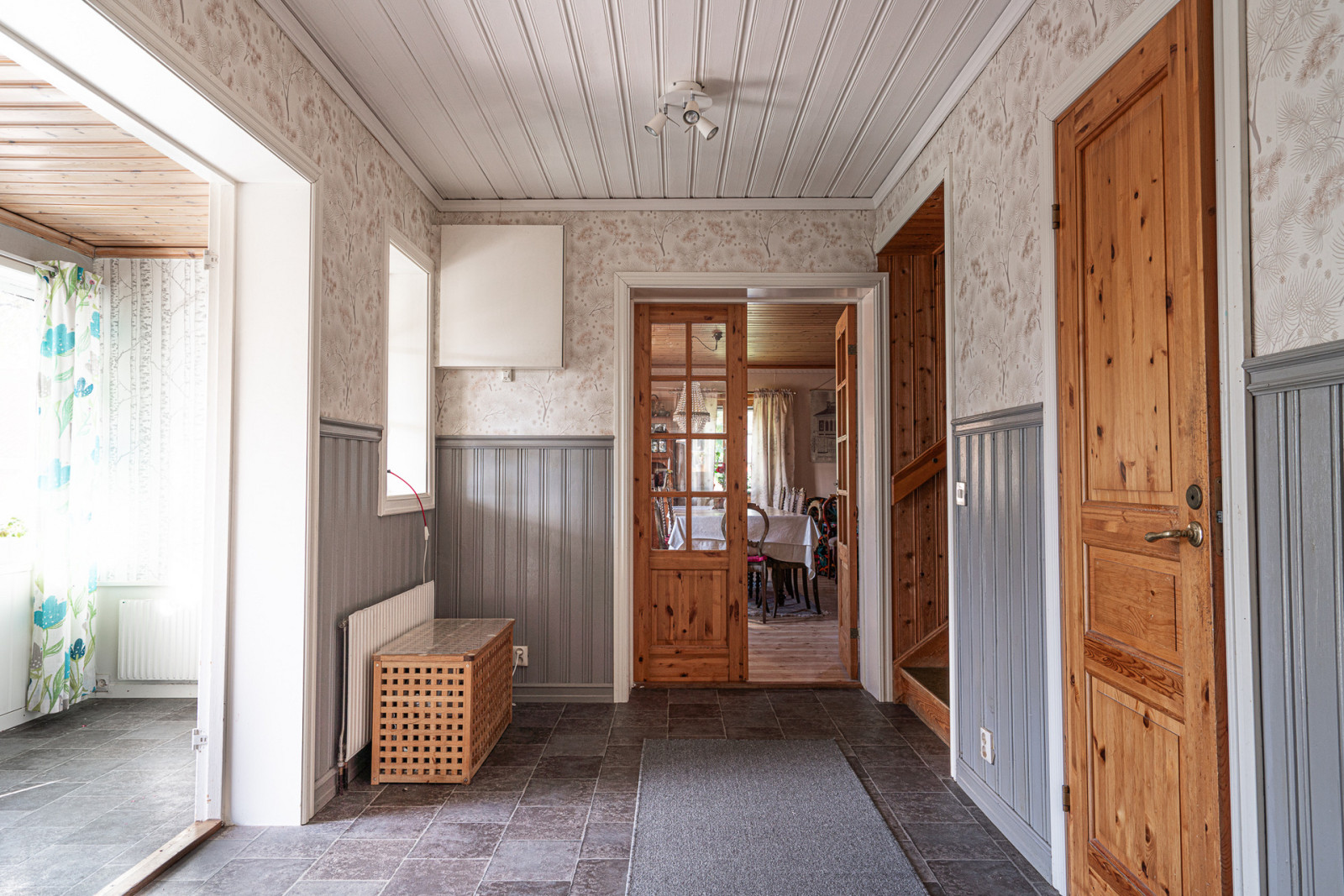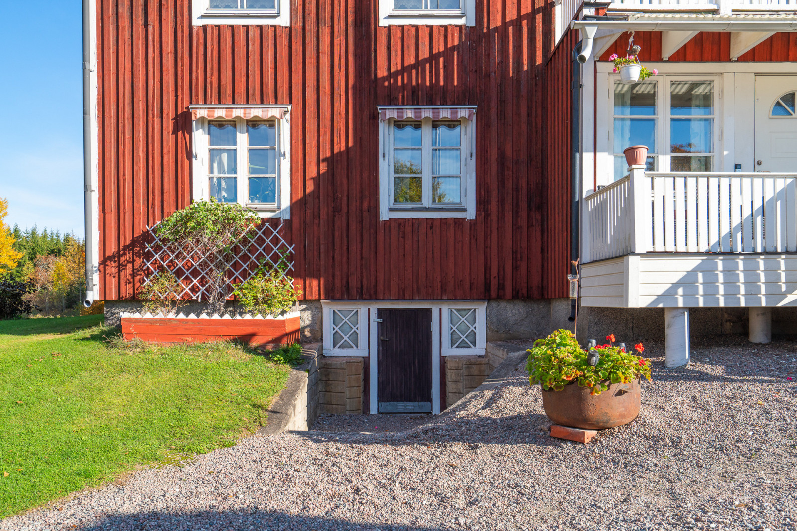 Vid entrén har du till höger en inglasad uteplats. Genom entrén når du hallen, rakt fram finns både förråd och badrum. Till höger når du köket som har en stor bakugn. Genom köket når du sedan ett av tre rum i fil i norra bottenplanet. Till vänster från entrén har du matsalen.