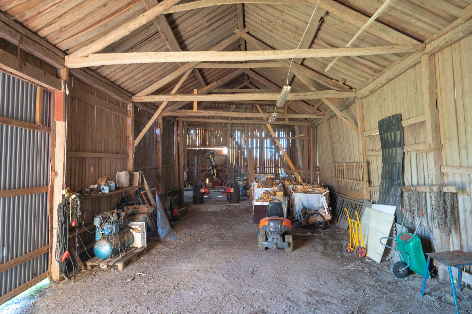 I västra delen av gårdscentrum finns ladugårds och logbyggnaden som är tillbyggd med magasin och maskinuppställning. Byggnaden är uppförd på plintgrund med stomme av trä. Utvändigt klädd i stående träpanel och taket är klädd i plåt. Logbyggnaden är öppen till nock och här finns gott om förvaring. Det gamla stallet används som verkstad och har gjutet golv. Övriga ytor används till uppställning och förvaring. Logen har ett byggnadsmått på mark om ca 12 x 24 m. Övriga länga byggnadsmått på mark om ca 8 x 53 m.
