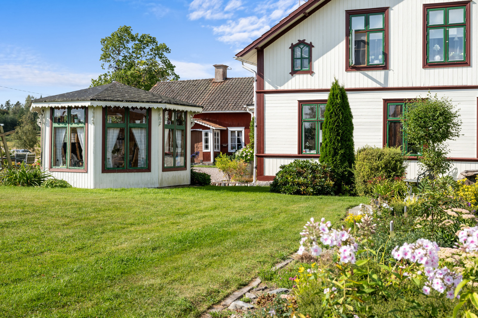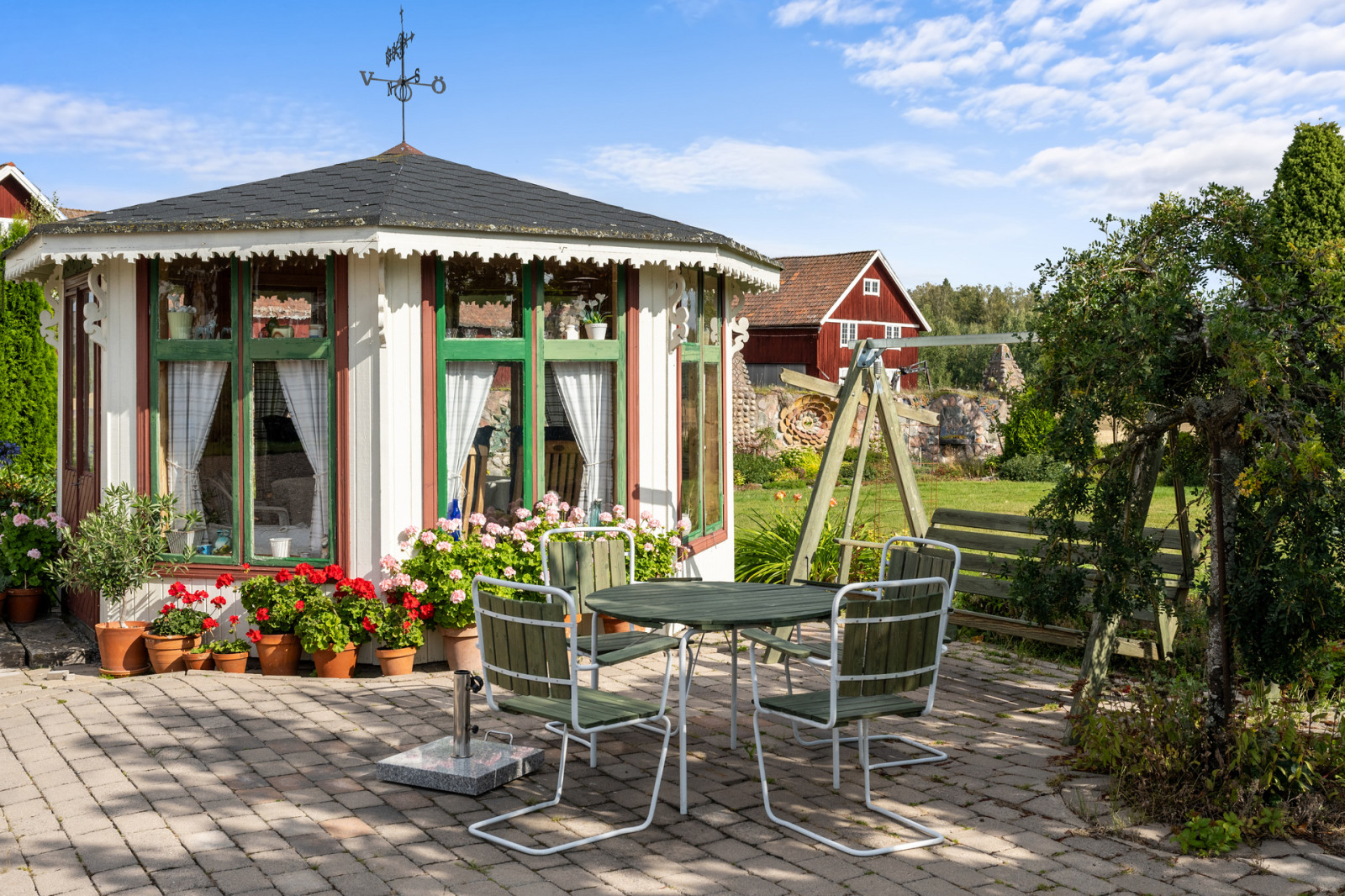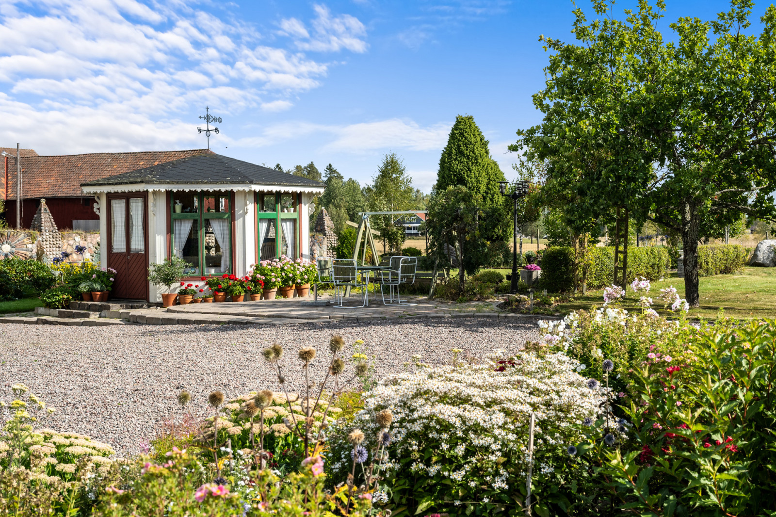 På den östra sidan av bostadshuset hittar man ett underbart åttkantigt lusthus omgivet av den fantastiska trädgården. Det är som gjort för att sitta och kura i om sommarvädret blir nyckfullt, för kräft- eller surströmmingspremiär eller varför inte servera välkomstdrinken här vid fest. Trädgården med sin stensatta uteplats bjuder verkligen in till både umgänge och harmoniskt trädgårdsliv.