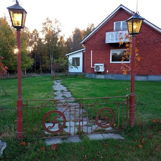 -Trädgård med gräsmatta, lövträd, prydnadsbuskar, stolpbelysning (även förberett med nedgrävd elkabel ut till byvägen för ytterligare belysning enligt säljaren), torkställning m.m. Stor gårdsplan.