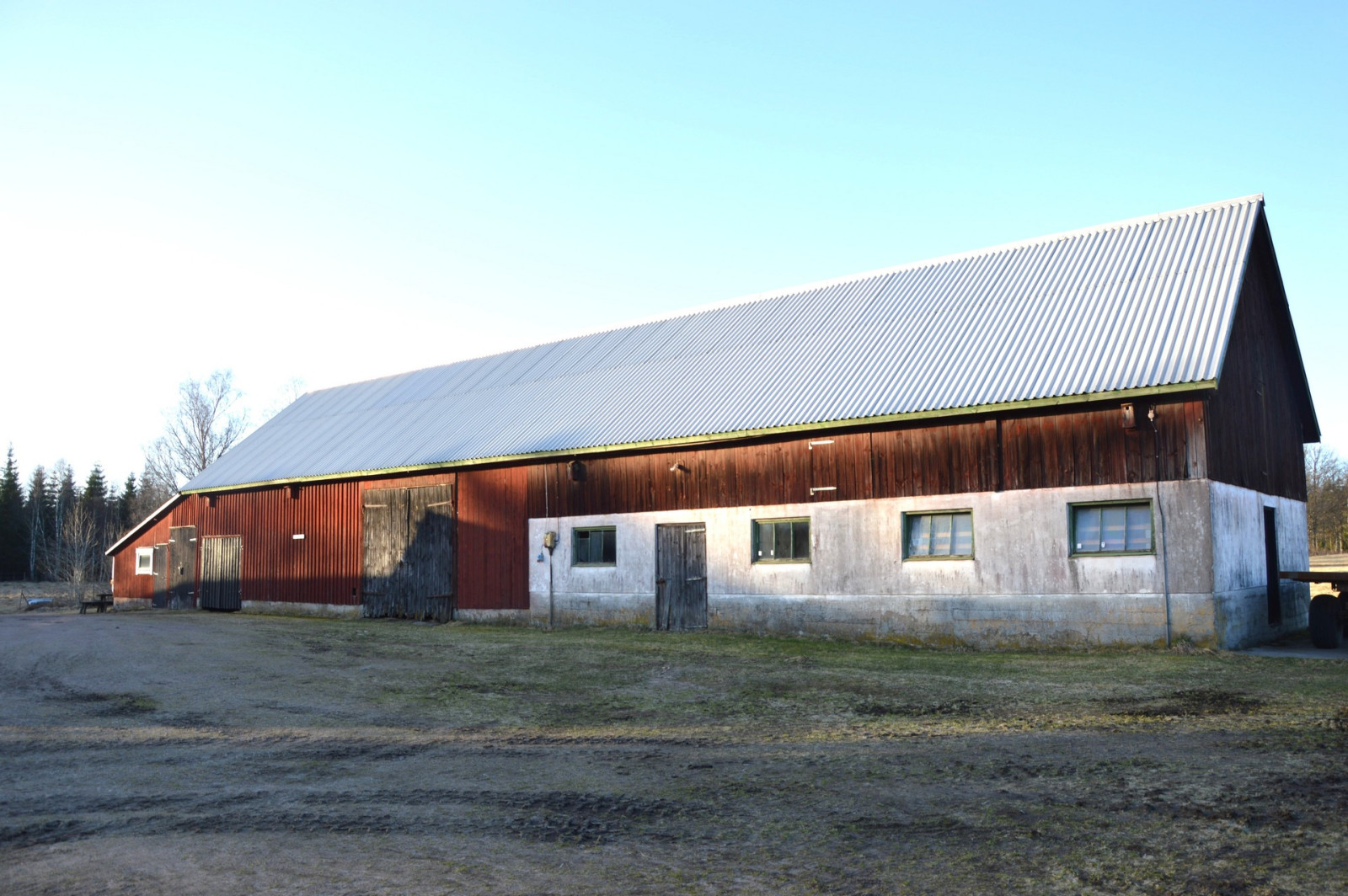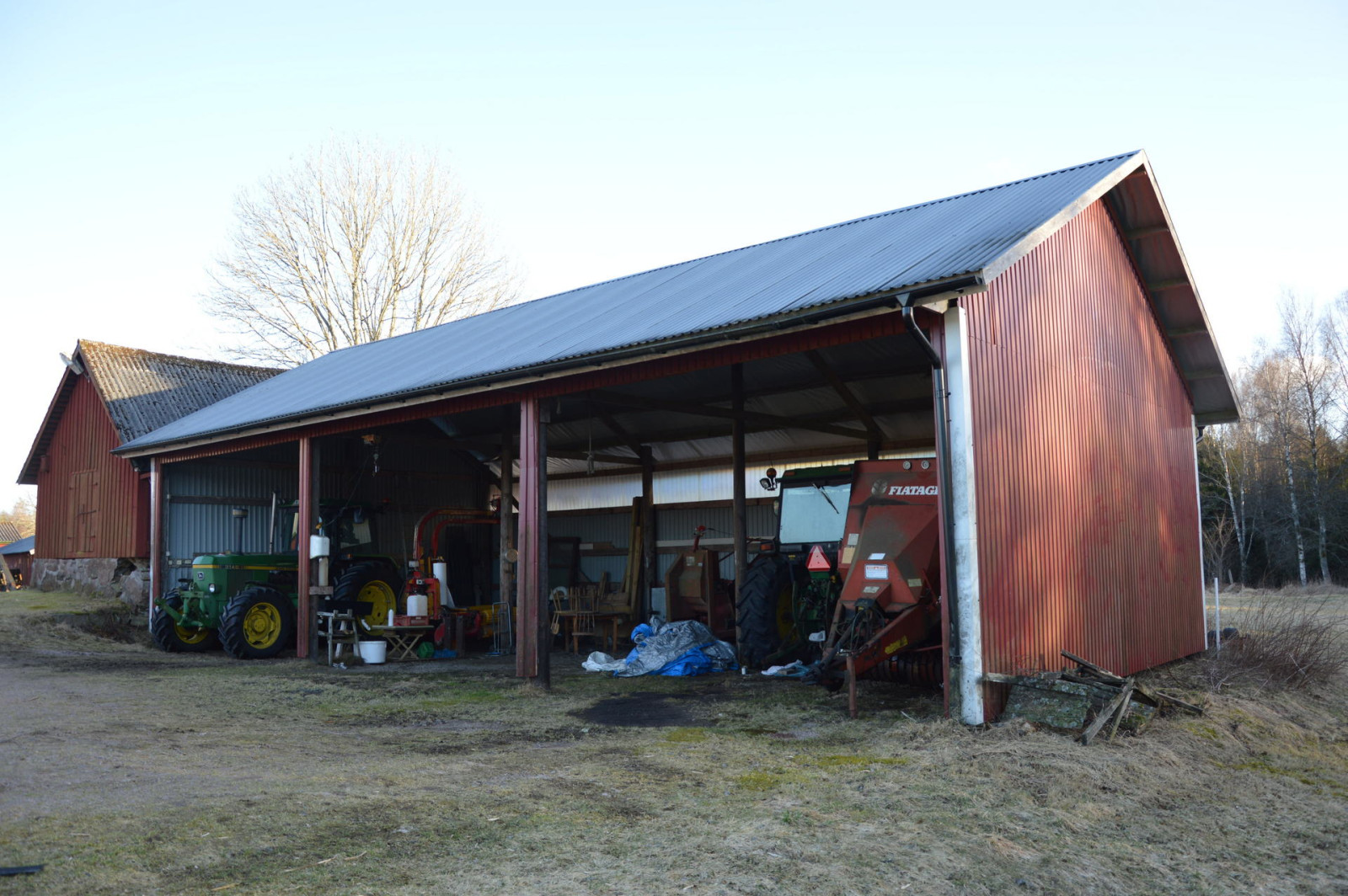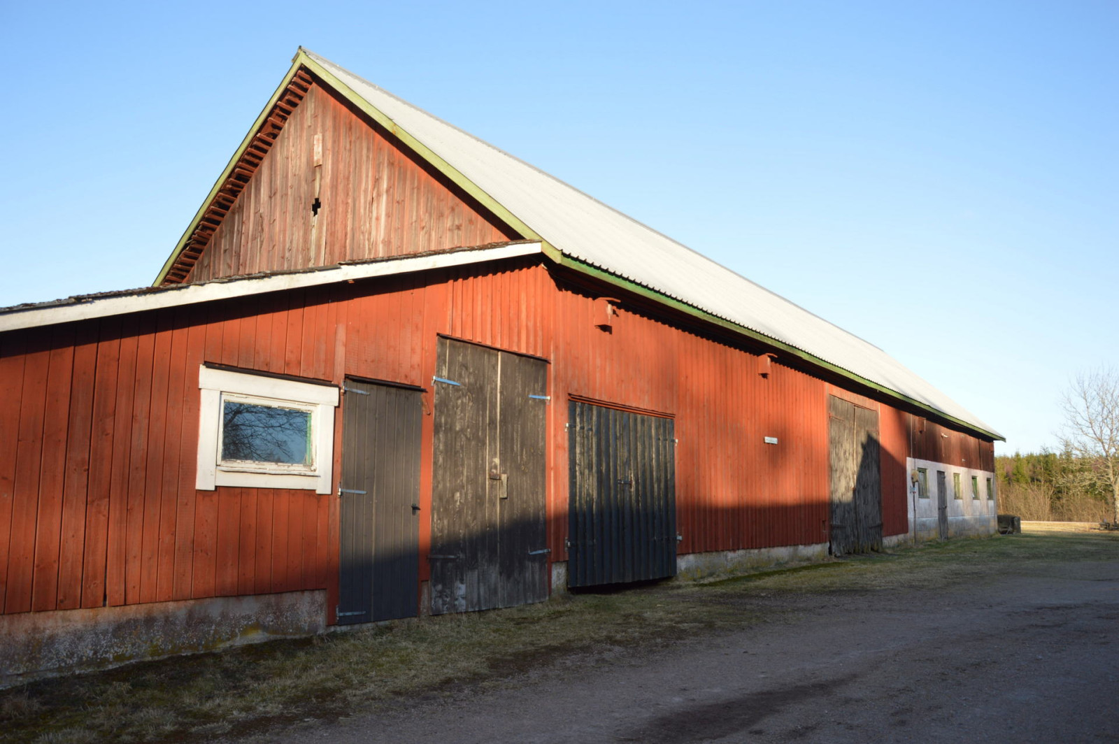 Uppskattad byggnadsstorlek ca 140 kvm. Nybyggnadsår ca 2000 enligt säljaren. Uppförd i trä, stolpgrund och väggar/tak av plåt. Tre fack med grusgolv. El finns.