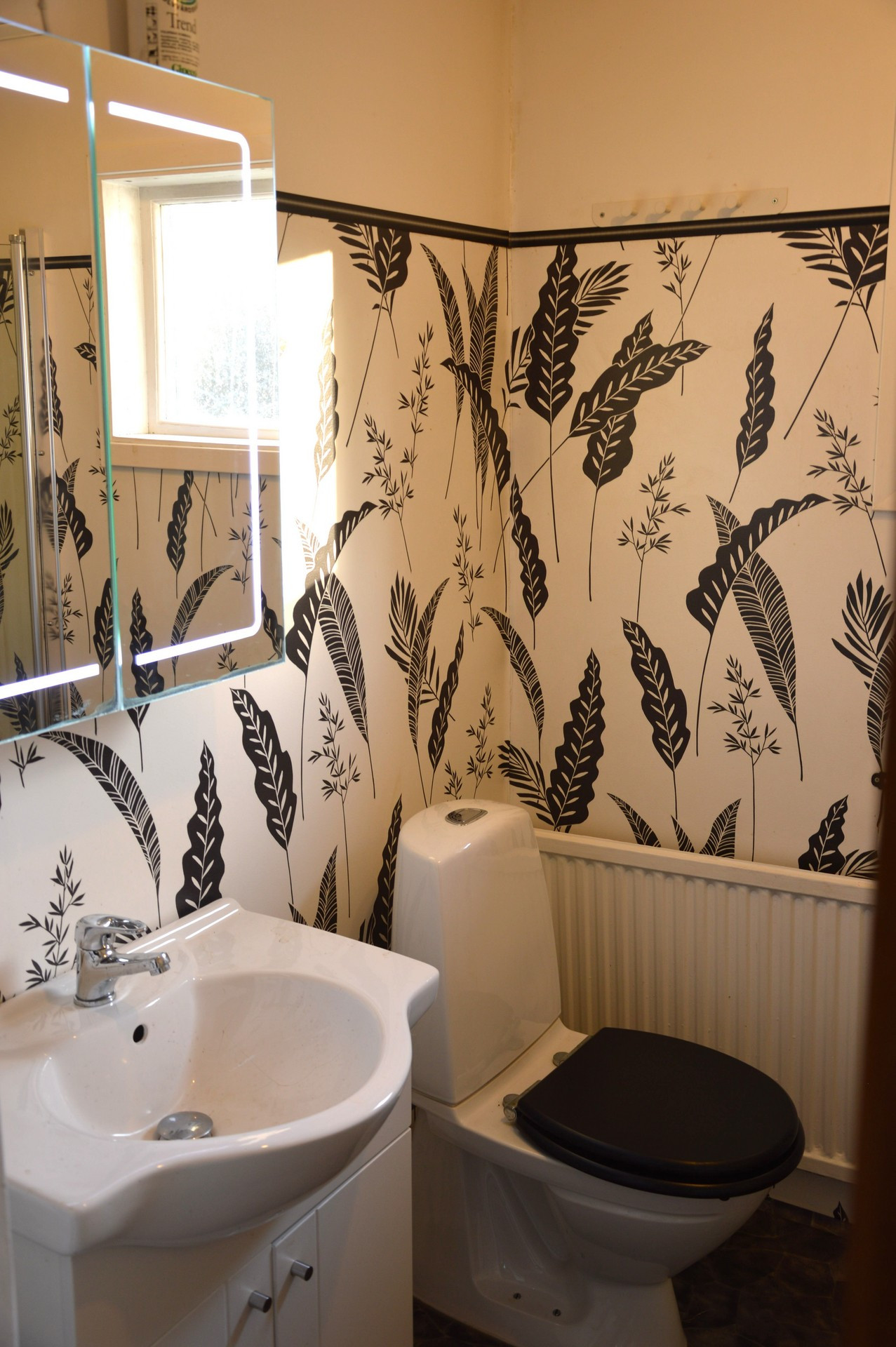 -Badrum (ca 2009) med plastmatta, WC, handfat, spegelskåp, dusch och badrumsfläkt.