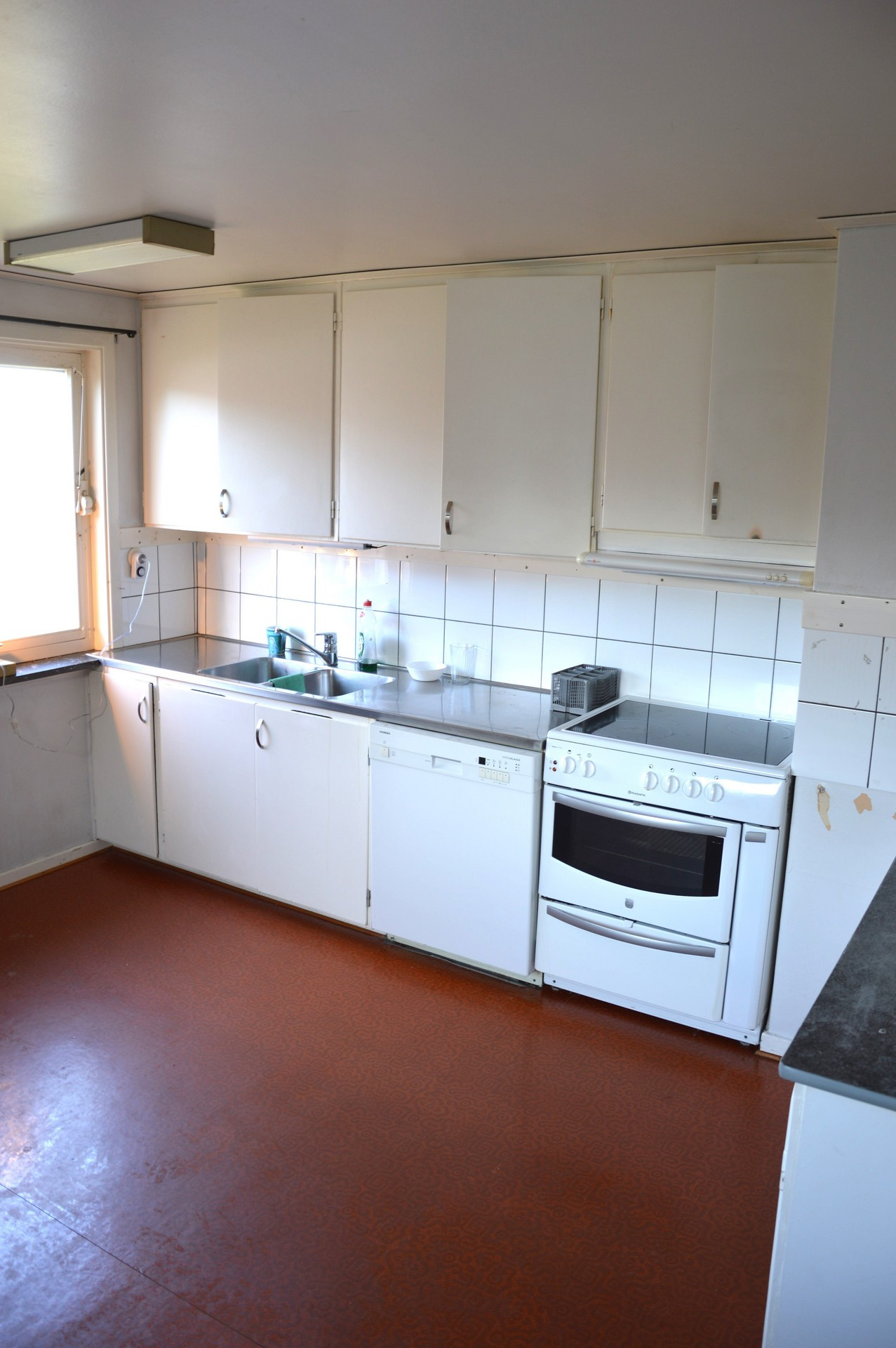 -Kök med äldre vitmålad köksinredning, kökskakel, arbetsbänk, diskbänk, diskmaskin, spis, fläkt, kyl, frys och städskåp.