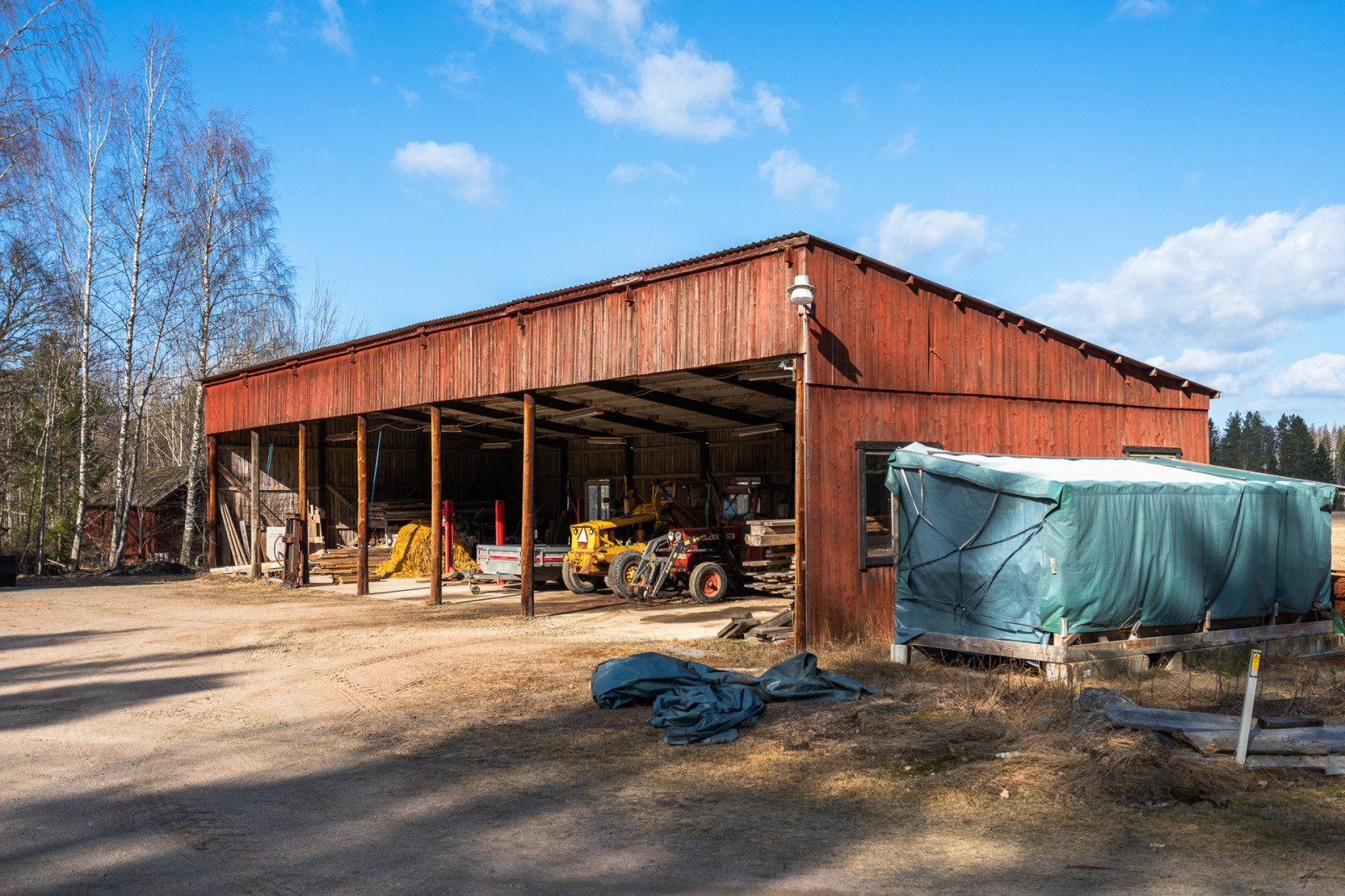 Ca 50 m väster om bostadshuset finns en maskinhall uppförd. Ena långsidan är öppen och byggnaden är rest på en gjuten platta med stomme av stolp i trä och stålbalk. Tak är klädd i plåt. Byggnadsmått på mark ca 10 x 25 m.