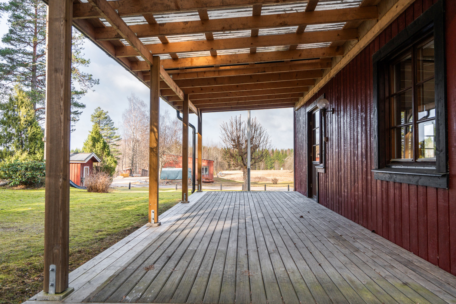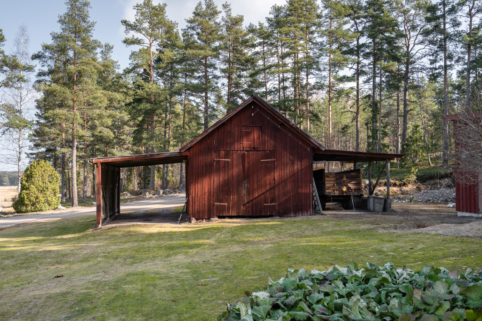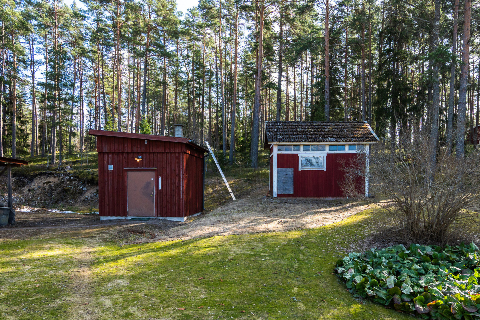 Norr om pannrummet finns en förrådsbyggnad uppförd på plintgrund med stomme i trä. Utvändigt klädd i träpanel och tak klädd i plåt. På vardera sida om byggnaden finns en överbyggnad för förvaring av maskin under tak. Östra överbyggnaden är gjuten, i övrigt är det grusat underlag.