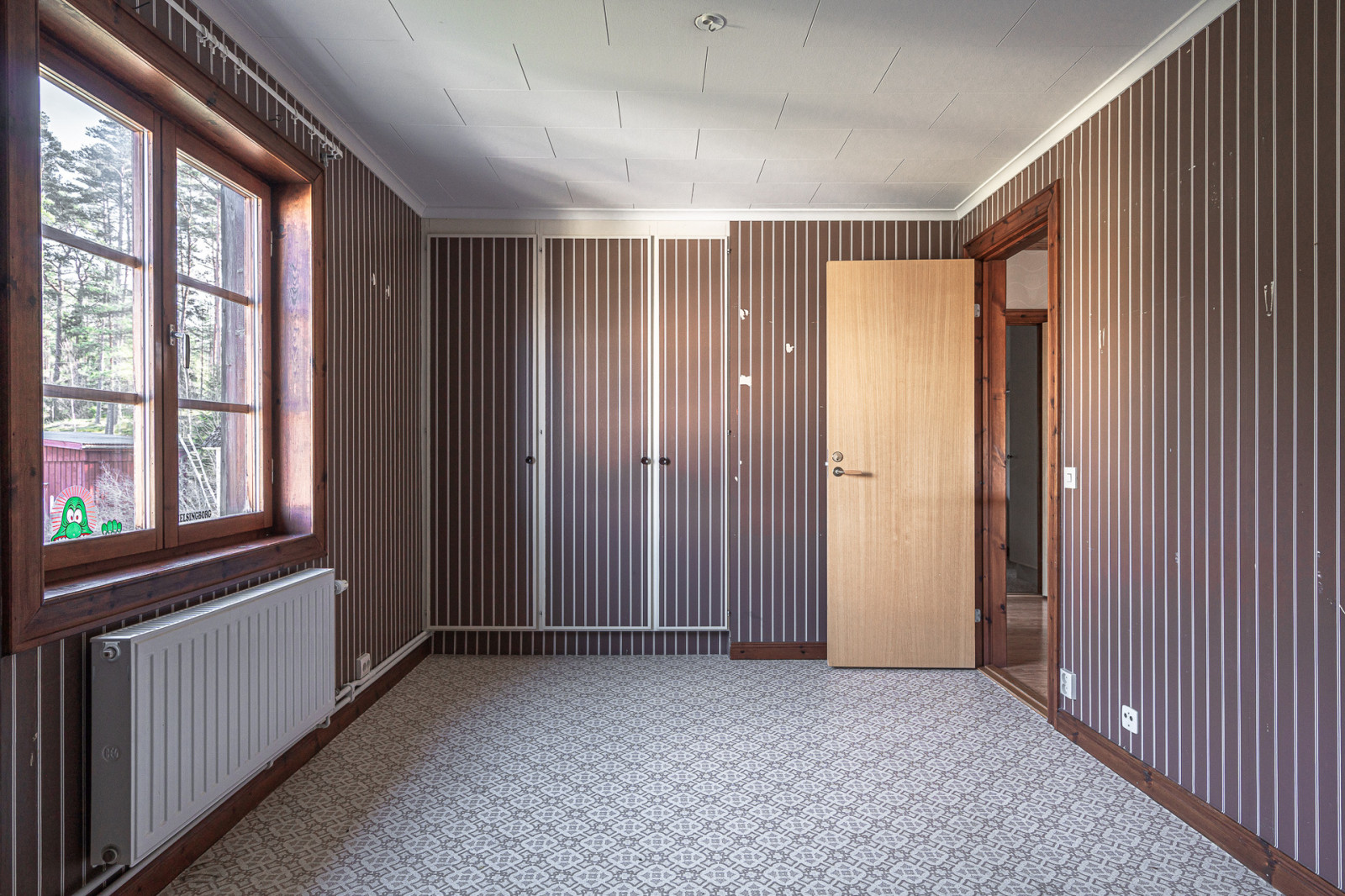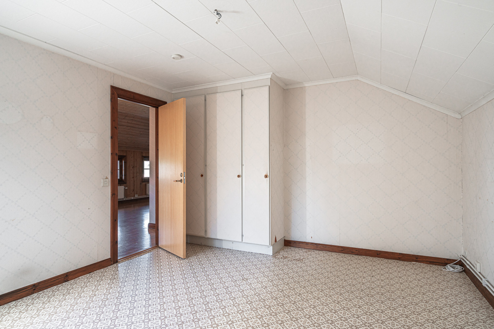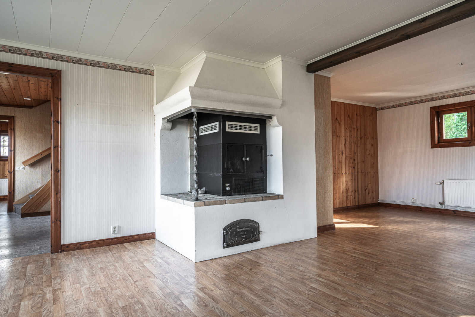 Övre plan utgör möblerbar hall med en öppen spis (eldningsförbud), badrum med våtrumsmatta, dusch, WC och handfat. Här finns även fyra sovrum med platsbyggda garderober. Från hallen nås även en balkong.