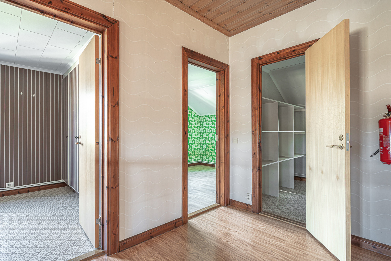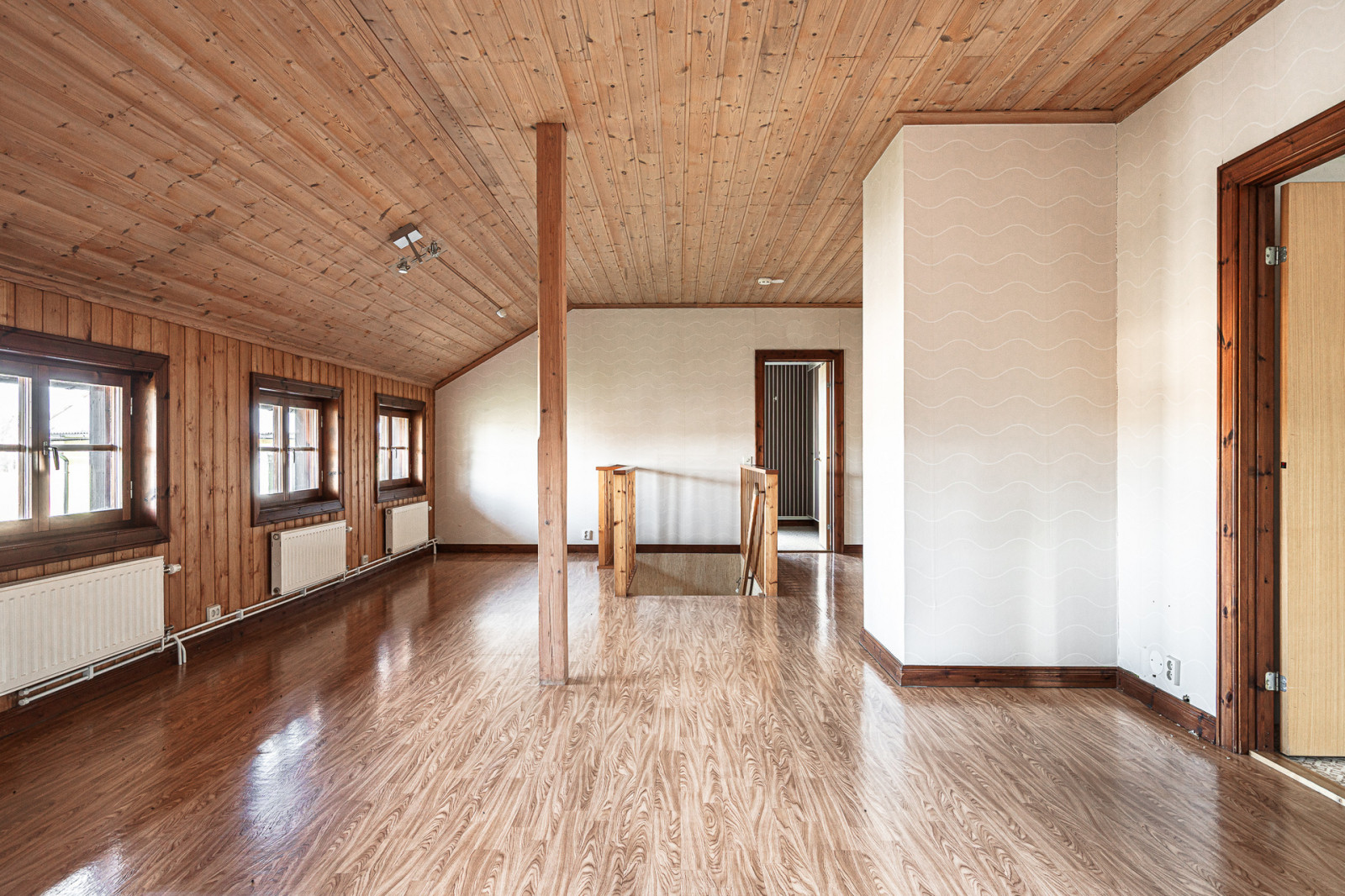 Övre plan utgörs av en stor möblerbar hall med utgång till balkong, vidare finns badrum med dusch, handfat och WC. Tre sovrum med garderober och ett mindre rum som utgör förråd.