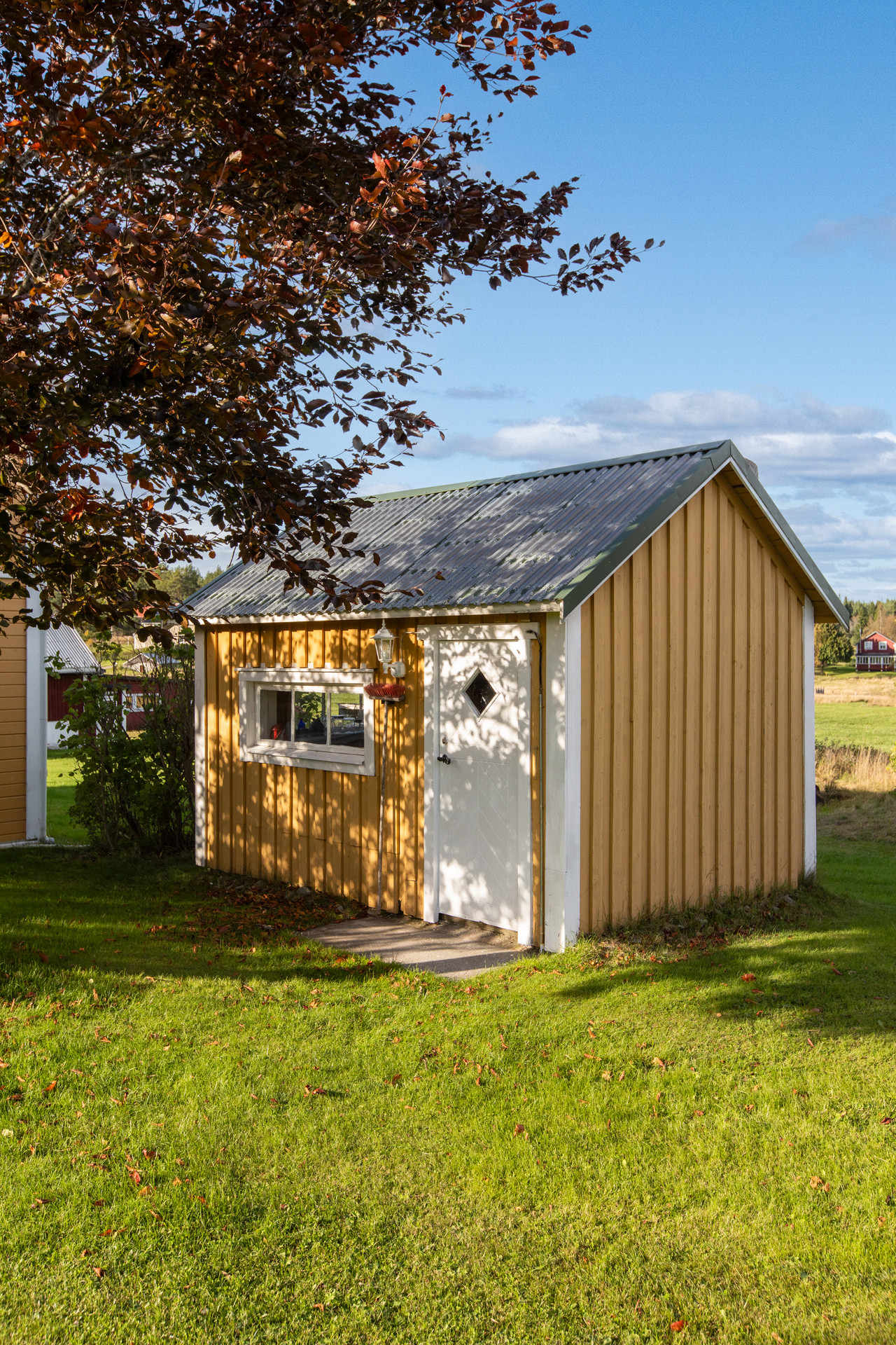 Mindre förråd uppförd i stomme av trä, med plåttak. Byggnadsarea ca 12 kvm.