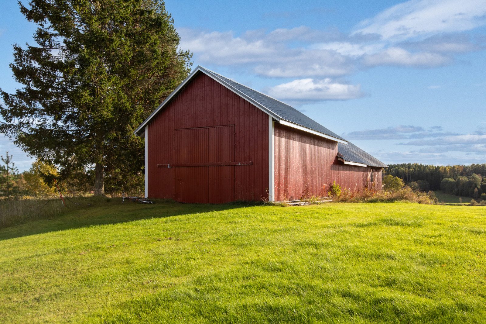 Det finns två lador på åkern i varierande skick.