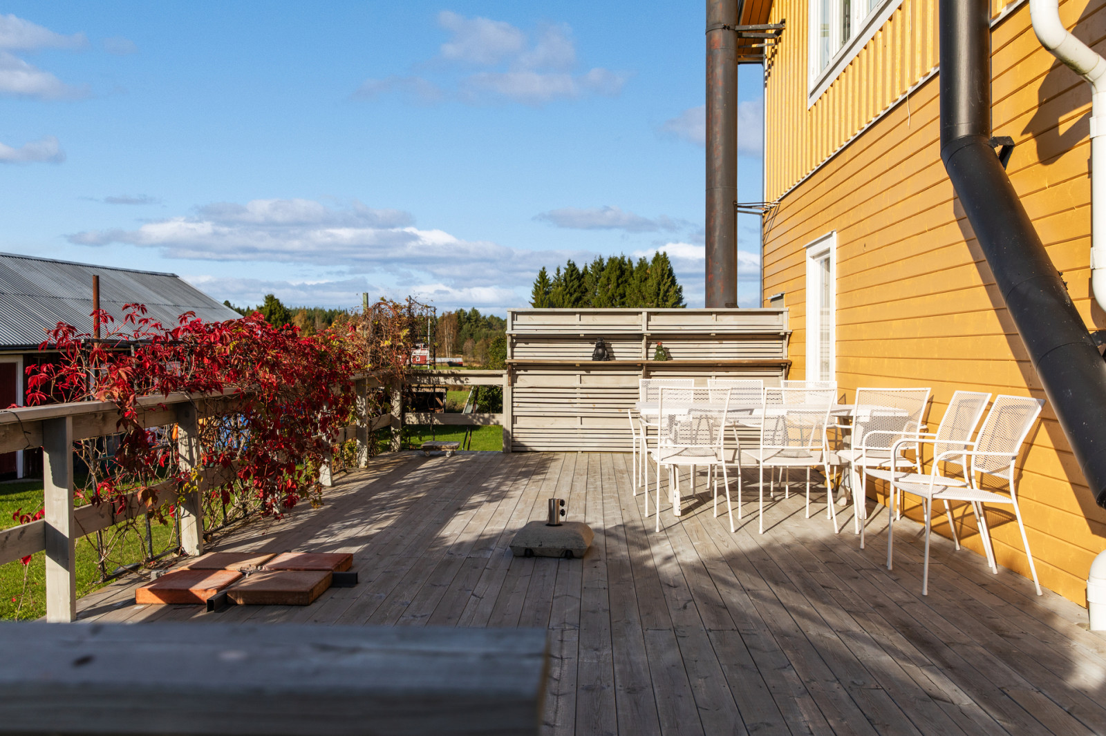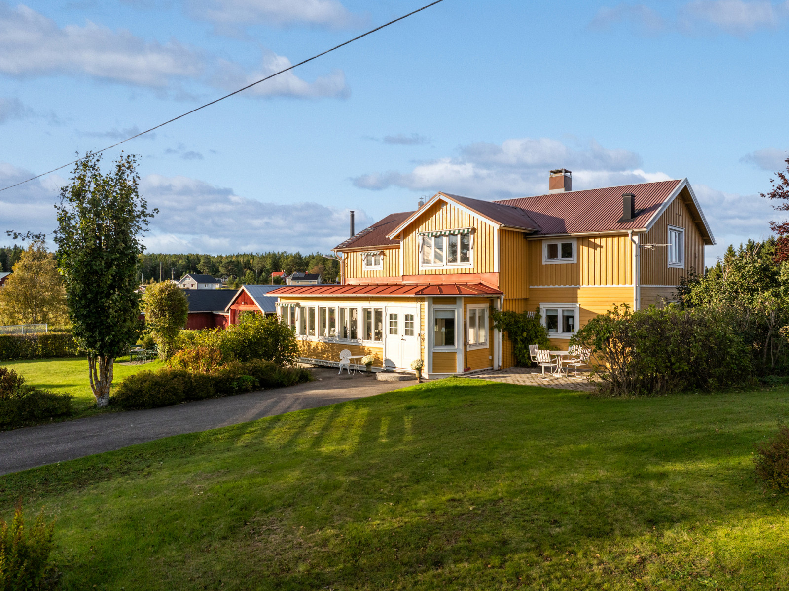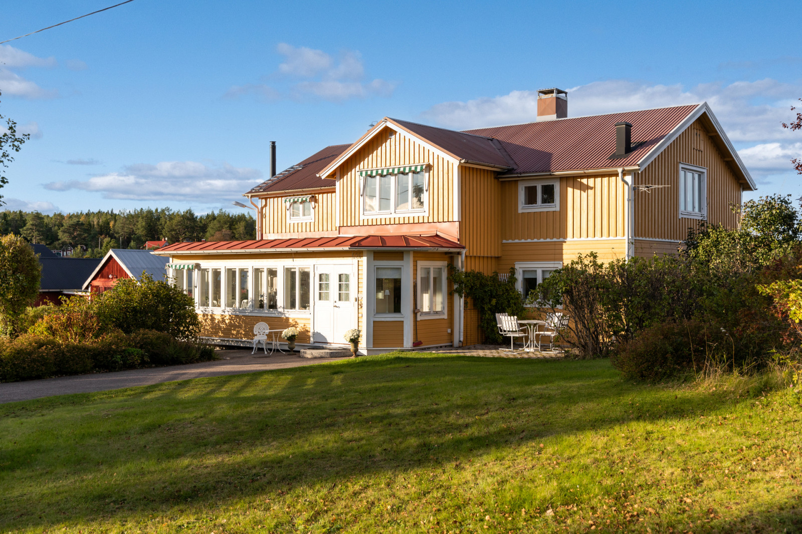 Huset omges av en lummig trädgård med stora gräsmattor och gott om buskar. Tomten ger en lantlig och lugn känsla med flera uteplatser finns gott om plats för att sitta ute och njuta av omgivningen.