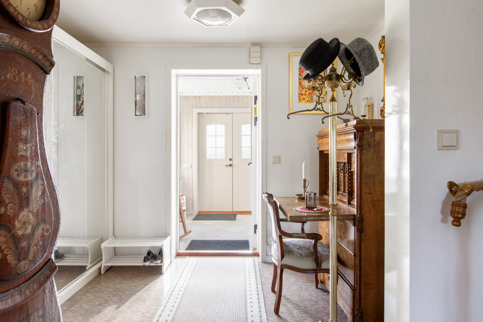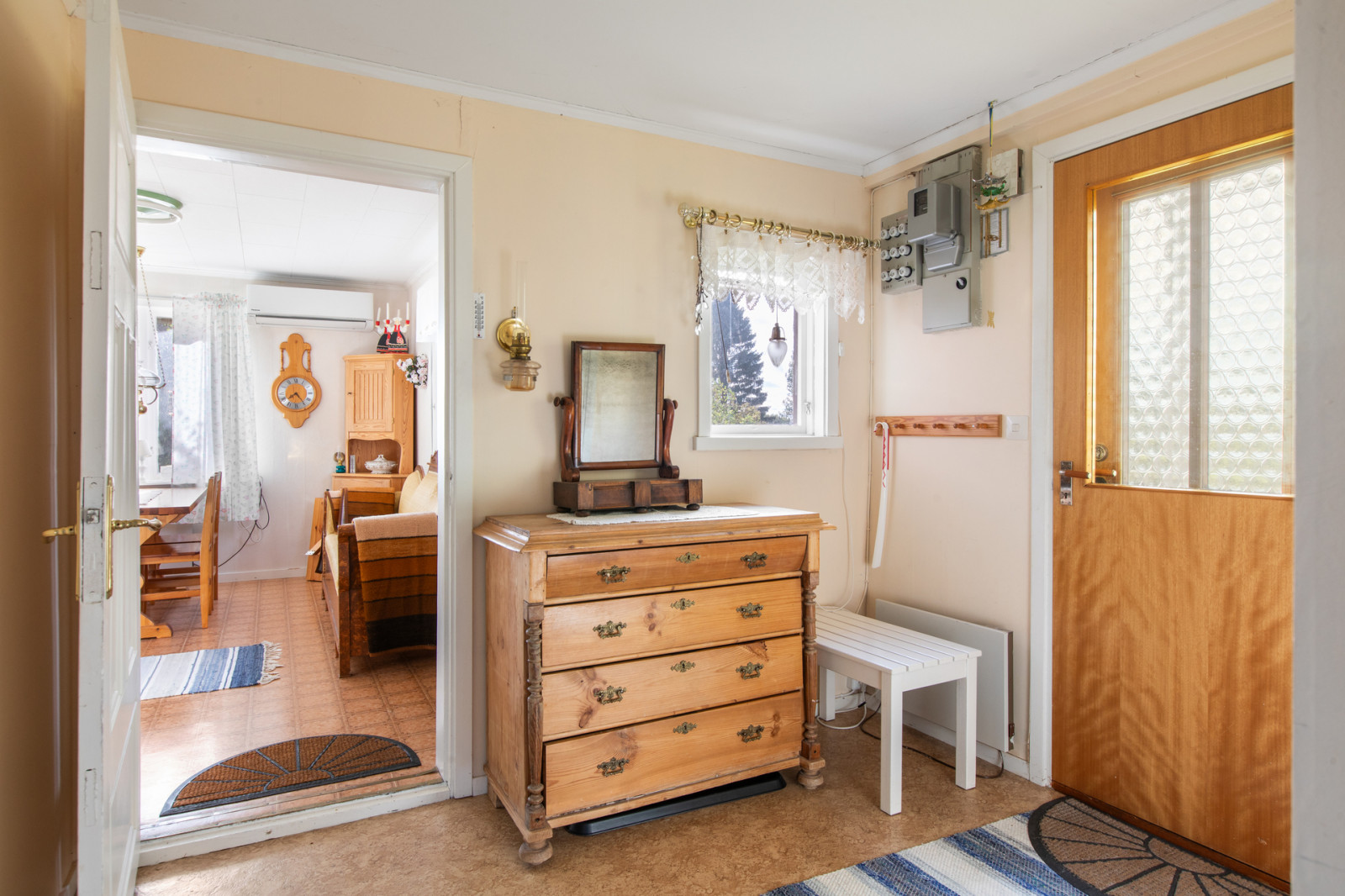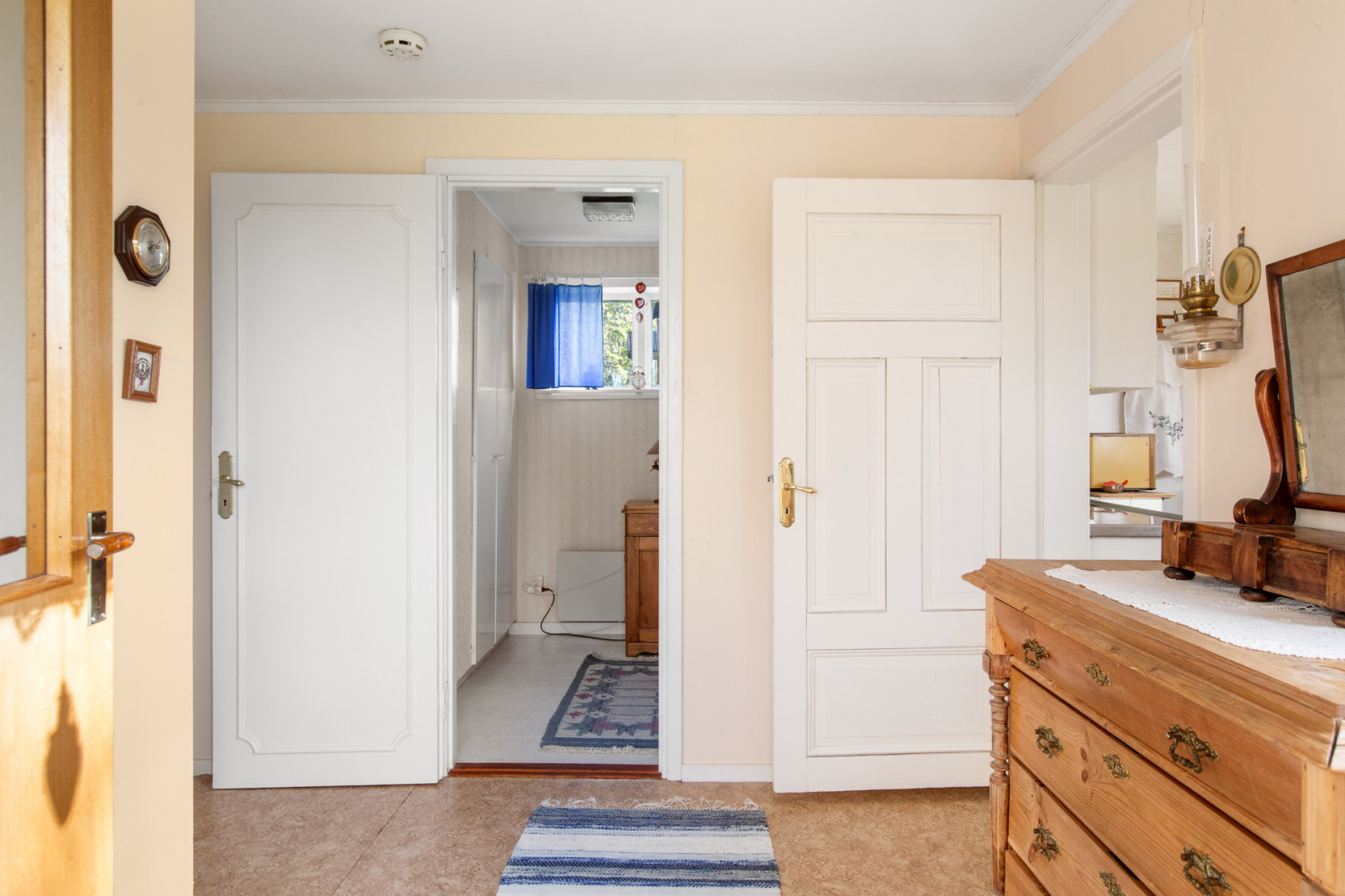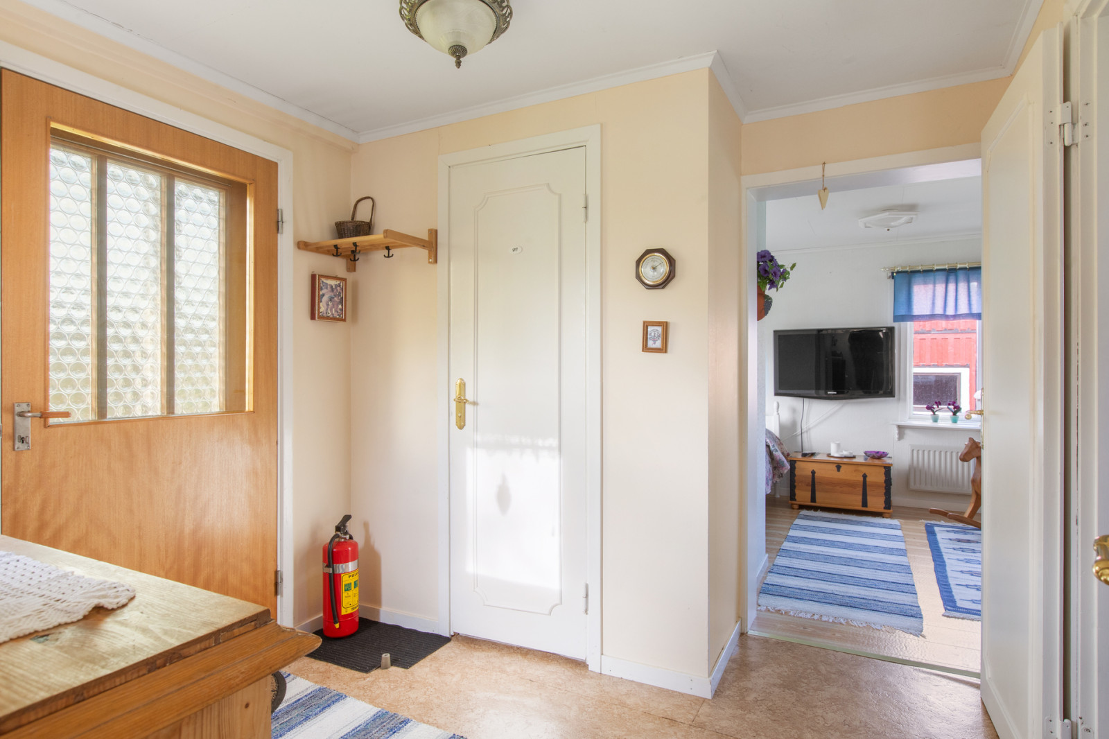Hall, toalett med duschkabin. Till höger i hallen finns köket med vedspis, vitmålade snickerier, kyl och frysskåp. Rakt fram i hallen ett litet sovrum och till vänster från hallen finns vardagsrummet.