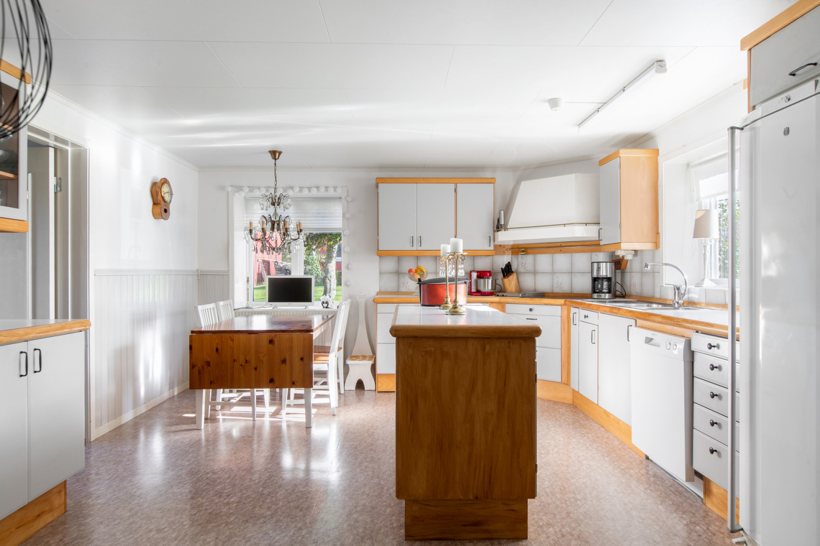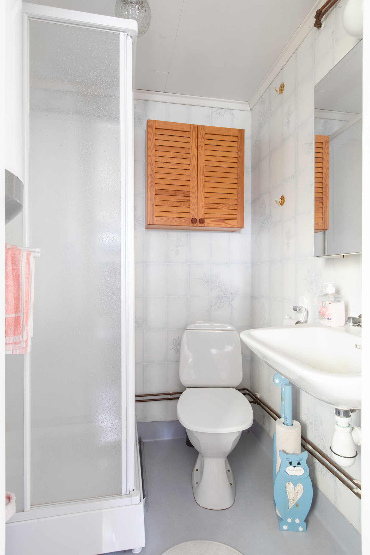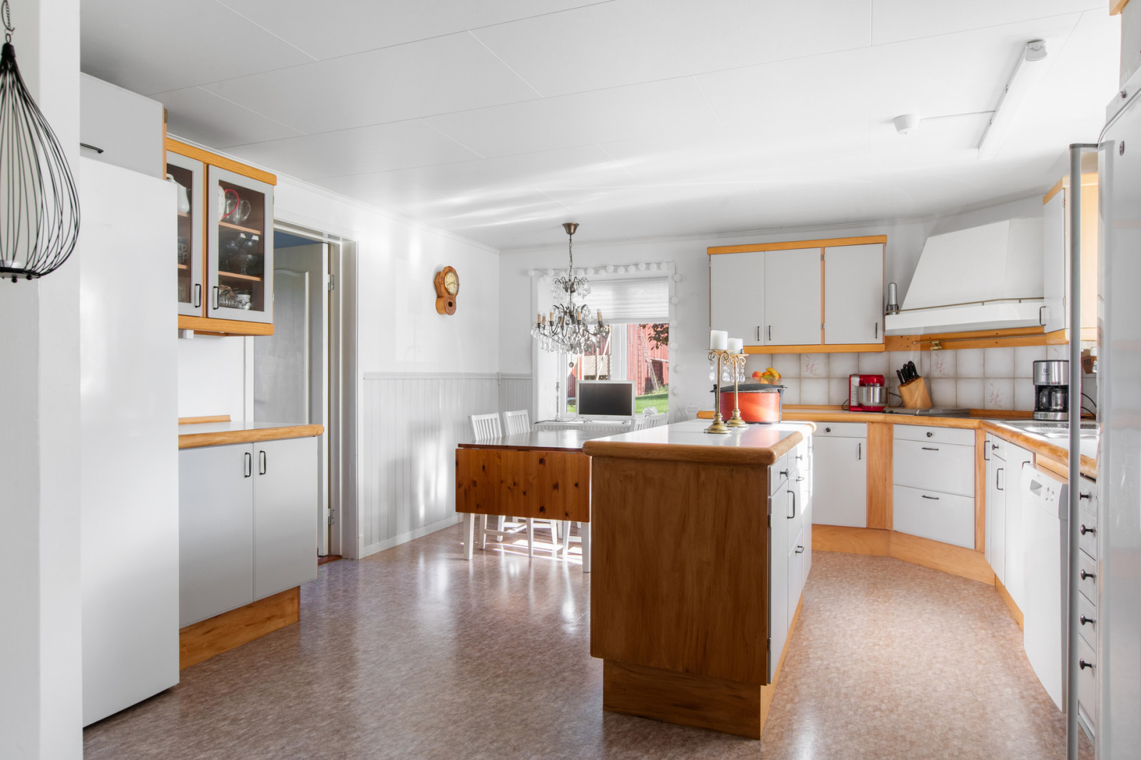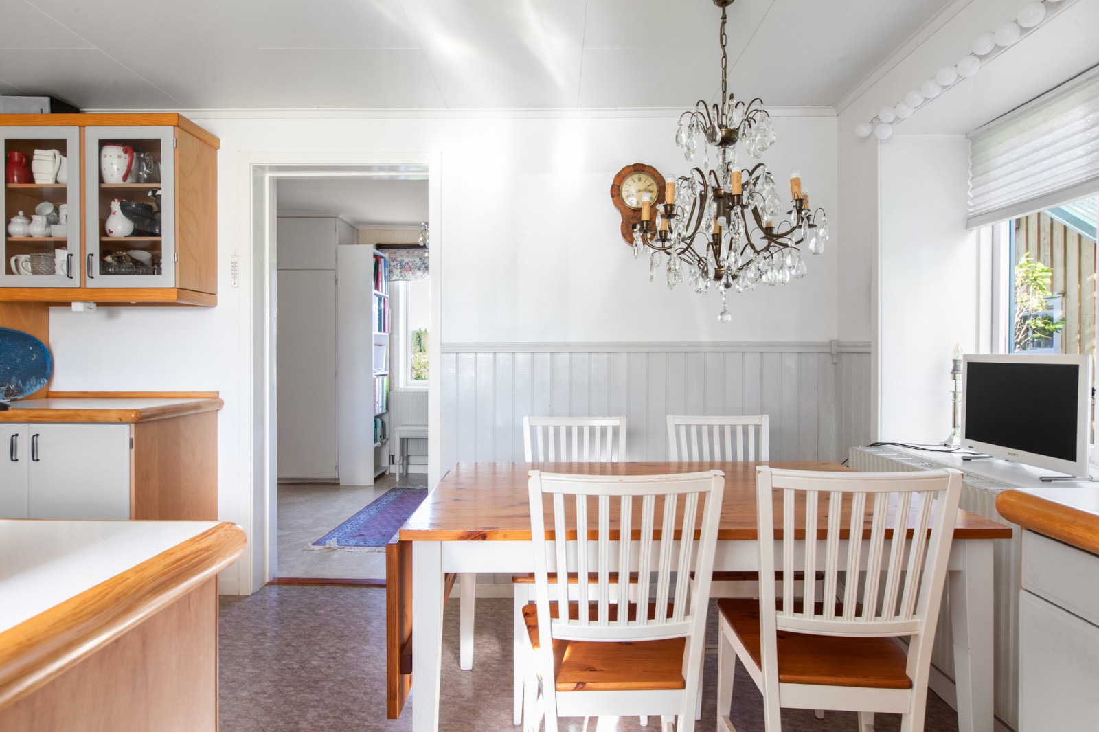 Hall, toalett med duschkabin. Till höger i hallen finns köket med vedspis, vitmålade snickerier, kyl och frysskåp. Rakt fram i hallen ett litet sovrum och till vänster från hallen finns vardagsrummet.