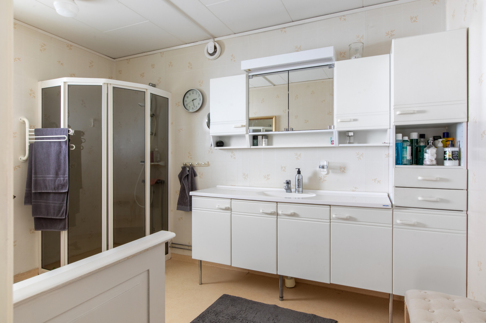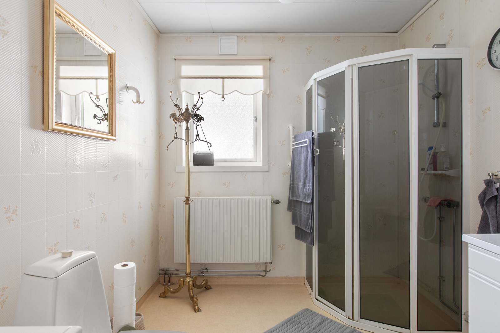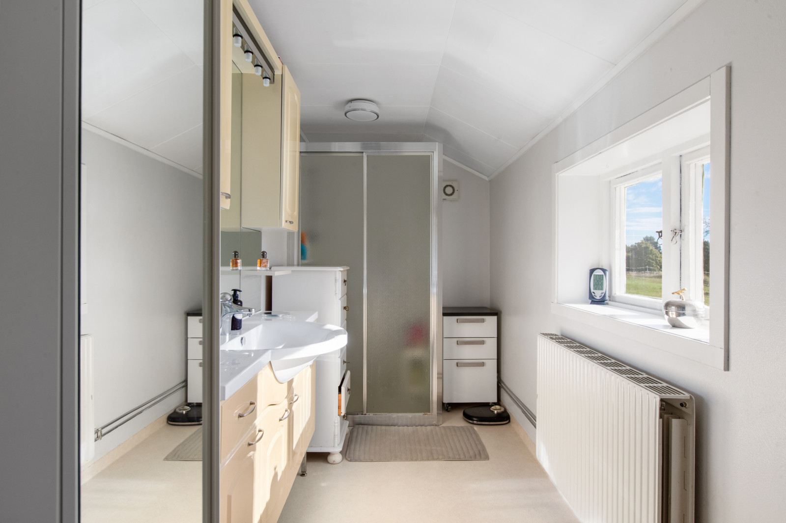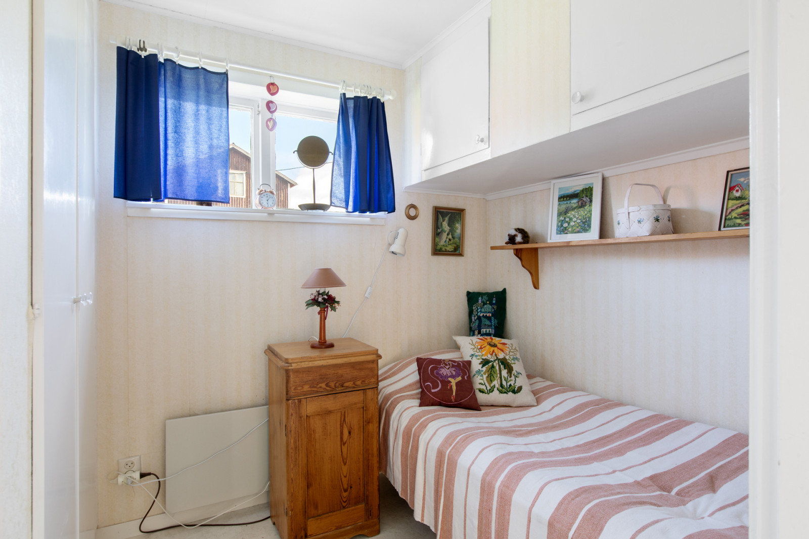 Hall, toalett med duschkabin. Till höger i hallen finns köket med vedspis, vitmålade snickerier, kyl och frysskåp. Rakt fram i hallen ett litet sovrum och till vänster från hallen finns vardagsrummet.