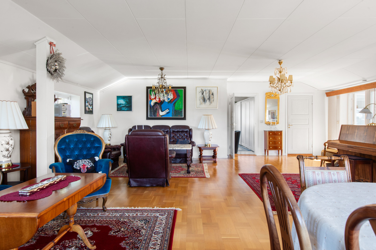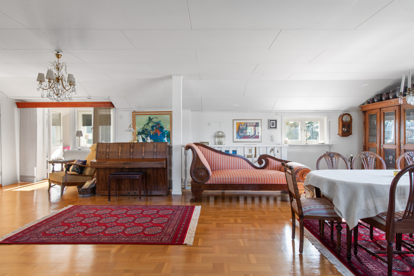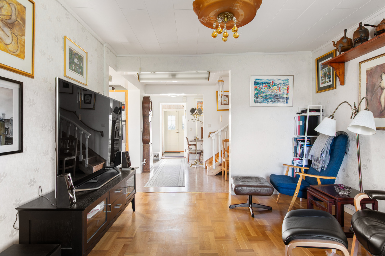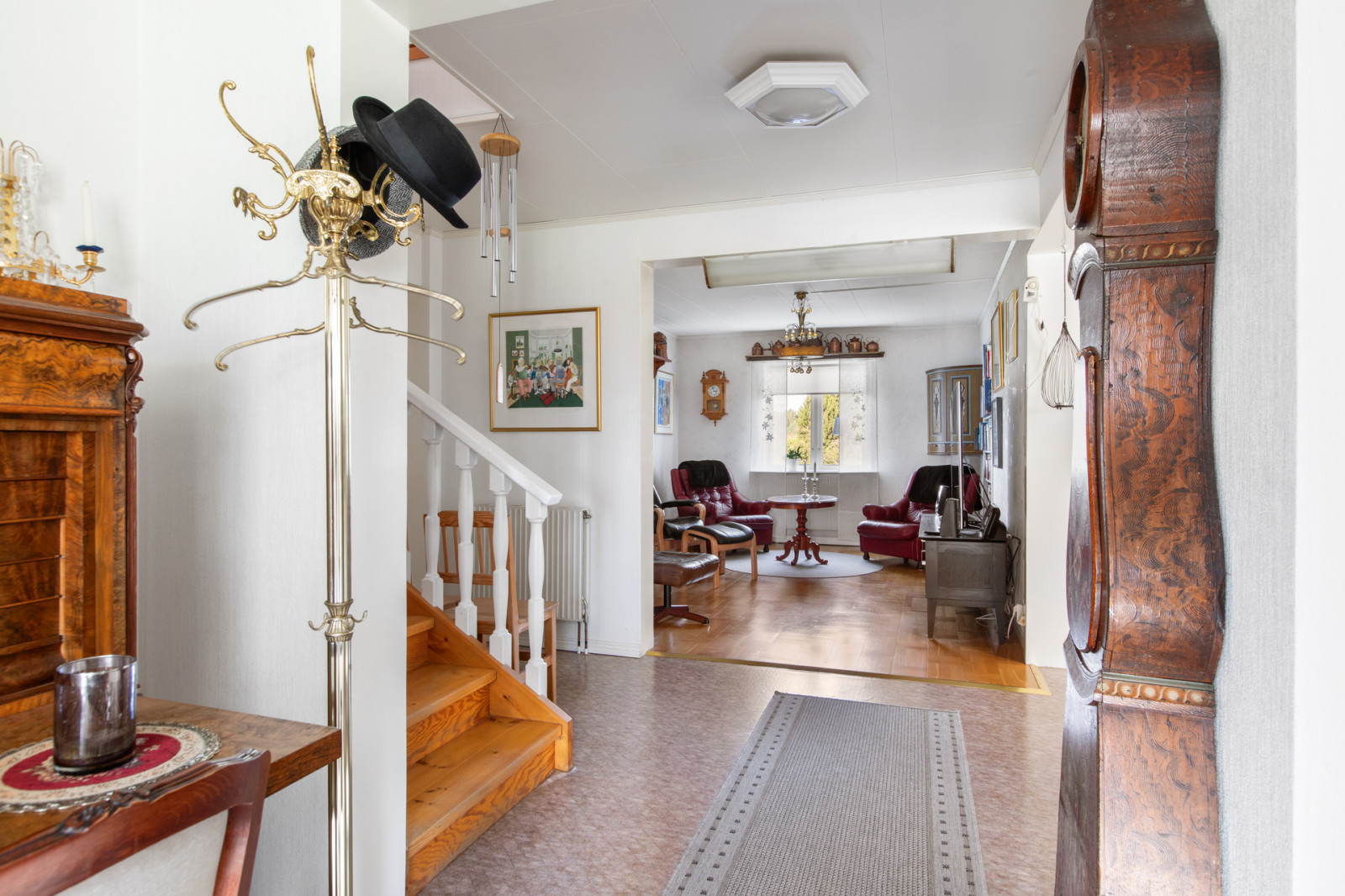 Från hallen leder en trappa upp till övervåningen till ett stort och luftigt vardagsrum med varmtonat parkettgolv, ljusa väggar och tak. På övervåningen finns också toalett med dusch två sovrum varav ett rum är mindre och ett rum är ett större sovrum med garderobsvägg och klädkammare.