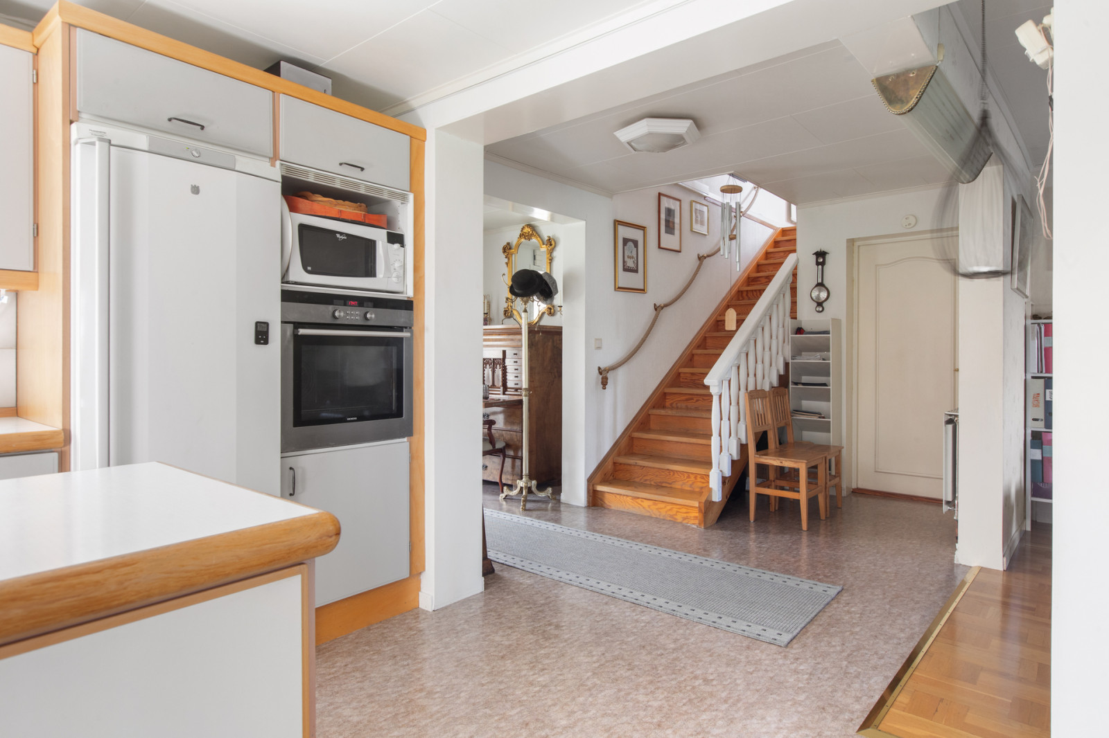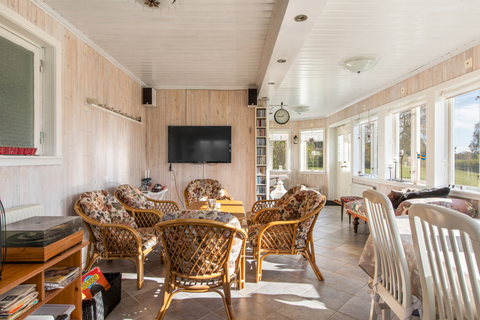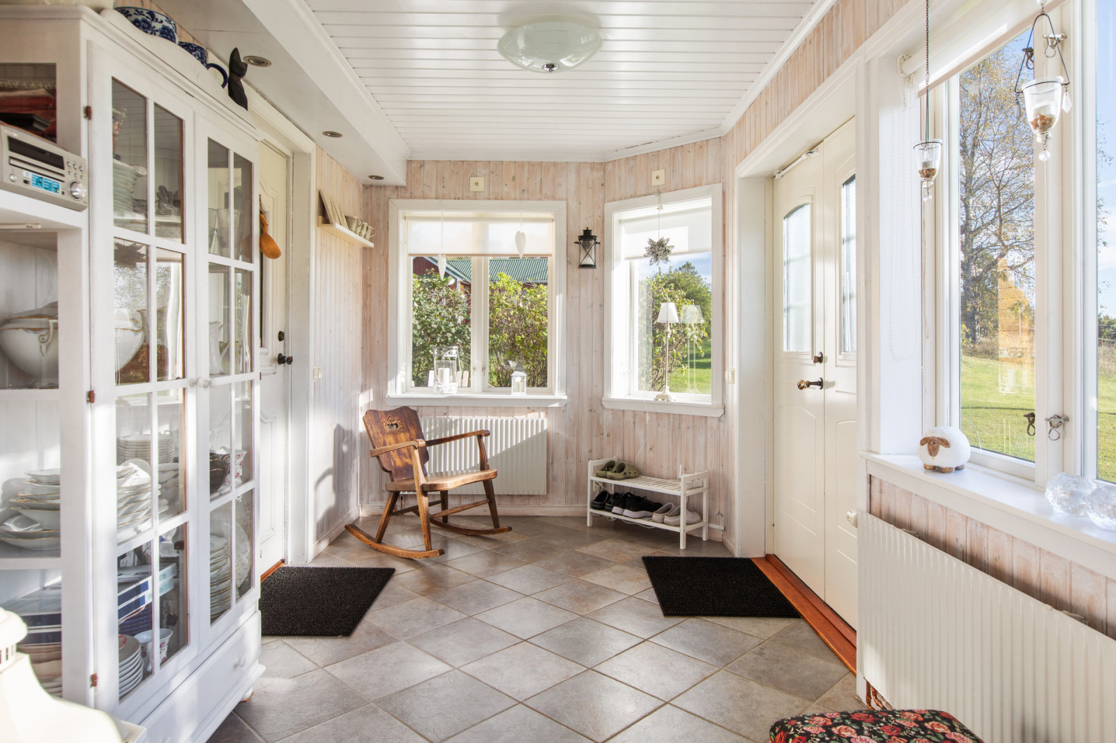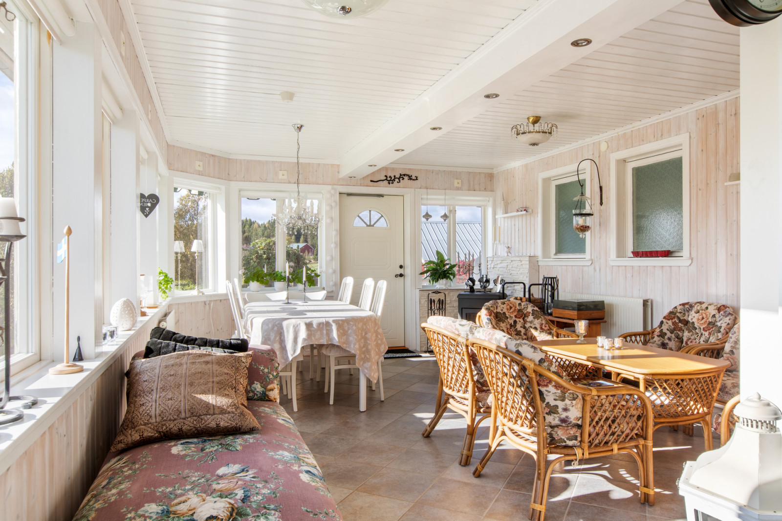 Från tomten genom dubbeldörrarna kommer man in i en stor isolerad inglasad veranda som ger ett rymligt och ljust sällskapsrum med vedkamin. Vidare kommer man in i hallen som är i ursprungliga huset. Till höger i hallen kommer man till köket som har en öppen planlösning mot hallen. Ett ljust och rymligt kök med köksinredning i vitt och ljust trä med gott om bänkytor genom köksön mitt i köket. Vitvaror som spishäll, inbyggnadsugn, diskmaskin, kyl och frysskåp i full höjd. Innanför köket finns ett mindre sovrum eller kontor. Rakt fram i hallen finns ett tv-rum som också har en öppen planlösning mot hallen. Tar man till vänster i hallen så finns, tvättstugan samt ett rymligt badrum med dusch. Från tvättstugan kommer man till pannrummet. Här finns bergvärmepumpen samt den gamla vedpannan finns kvar. I pannrummet finns även en bastu samt nedgång till en matkällare under en mindre del av huset. Pannrummet näs även från en egen ingång från trädgården.