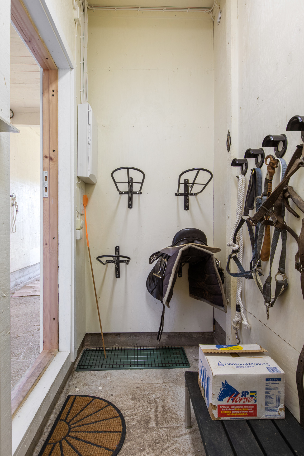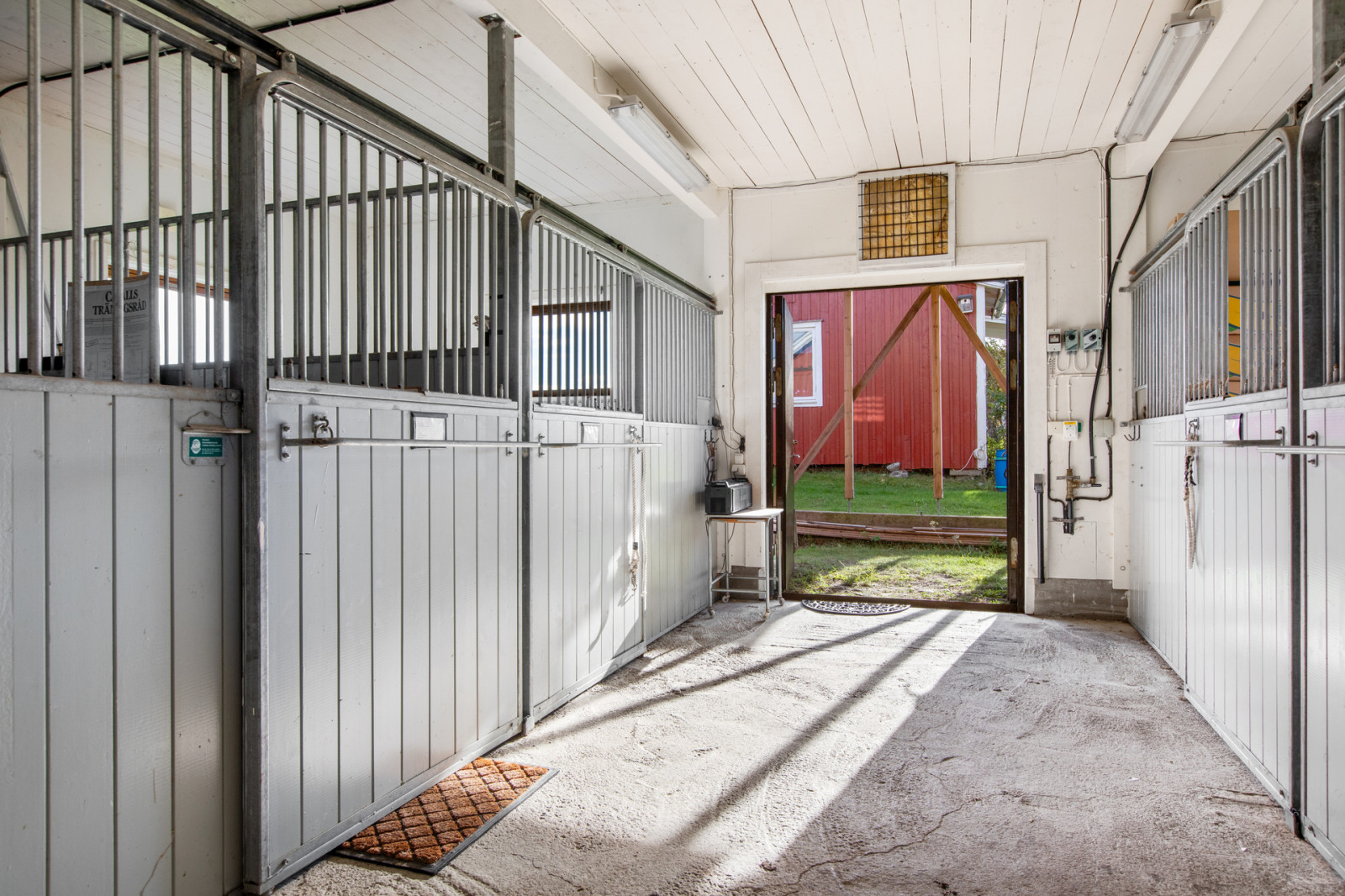 Välplanerat och välskött stallbyggnad uppförd i början av 2 000 talet i stomme av trä på cementplatta. Stående brädfodring i klassisk faluröd och sadeltak med svart plåtbeklädnad. I stallet finns det totalt fyra boxar om 9 kvm med modern stallinredning, två boxar på var sin sida om mittgången, eget utrymme med spolplats, bänk med vatten, elektrisk varmvattenberedare och tvättmaskin för täcken samt isolerad sadelkammare. På övervåningen finns ett loft som ägaren har påbörjat att inreda men är inte färdigställt. Rejäl trapp och stor balkong i härligt söderläge är påbyggt upp till loftet. Byggnadsarea ca 89 kvm med en invändig takhöjd om ca 3 m.