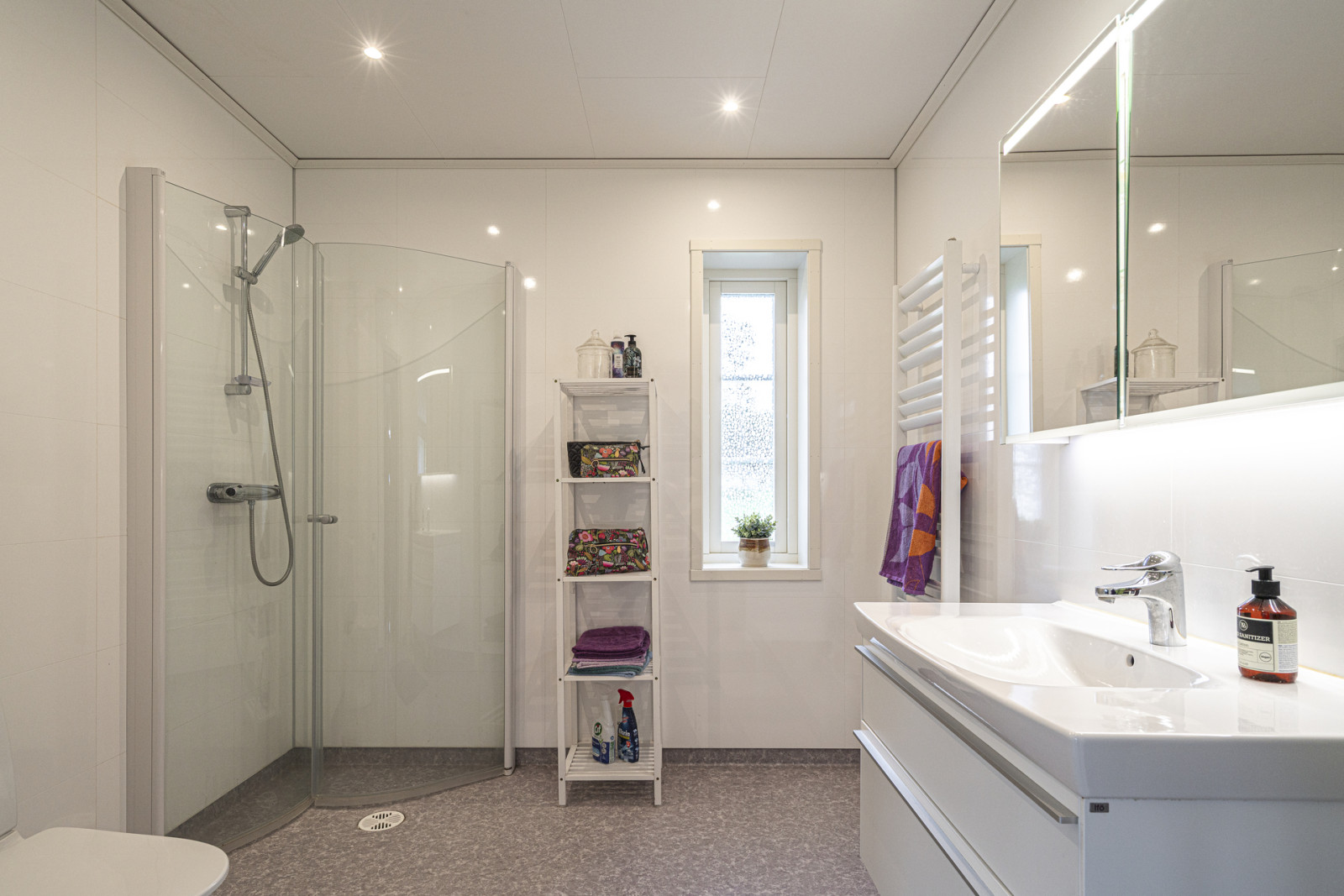 Nedervåningen består av en hall, toalett med dusch och tvättmöjligheter, kök med matplats, ett kontor/sovrum samt ett vardagsrum. På övre plan finns en hall med