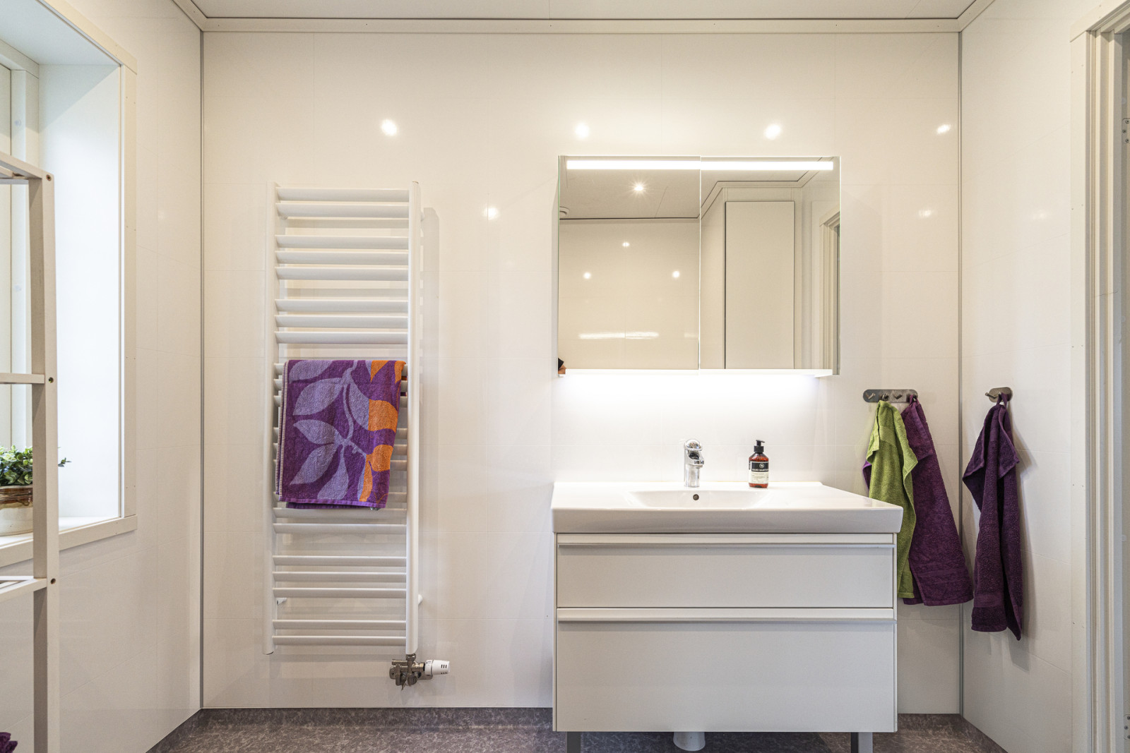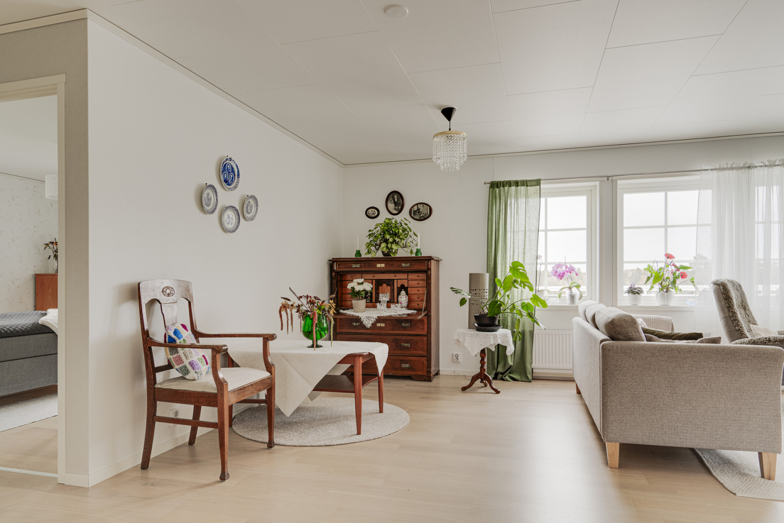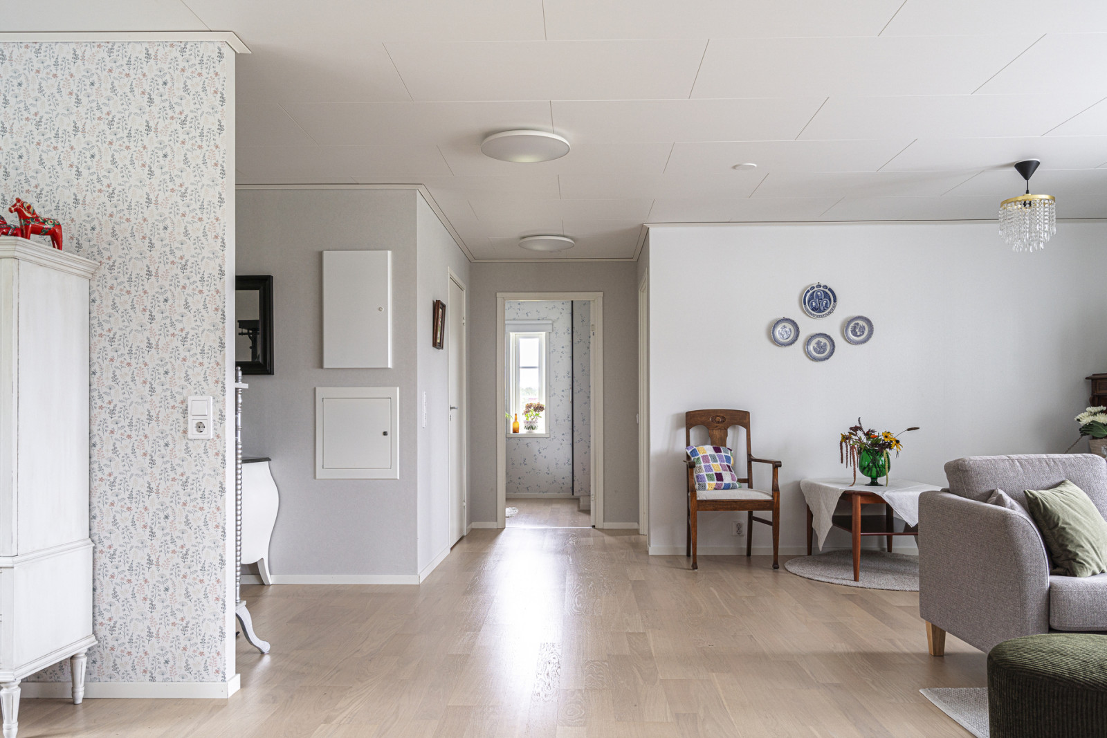 Planlösningen är trevlig och praktisk där en hall leder in till ett stort kombinerat kök och allrum som har anslutning till altan. Vidare finns två sovrum, ett badrum samt en kombinerad groventré och tvättstuga.