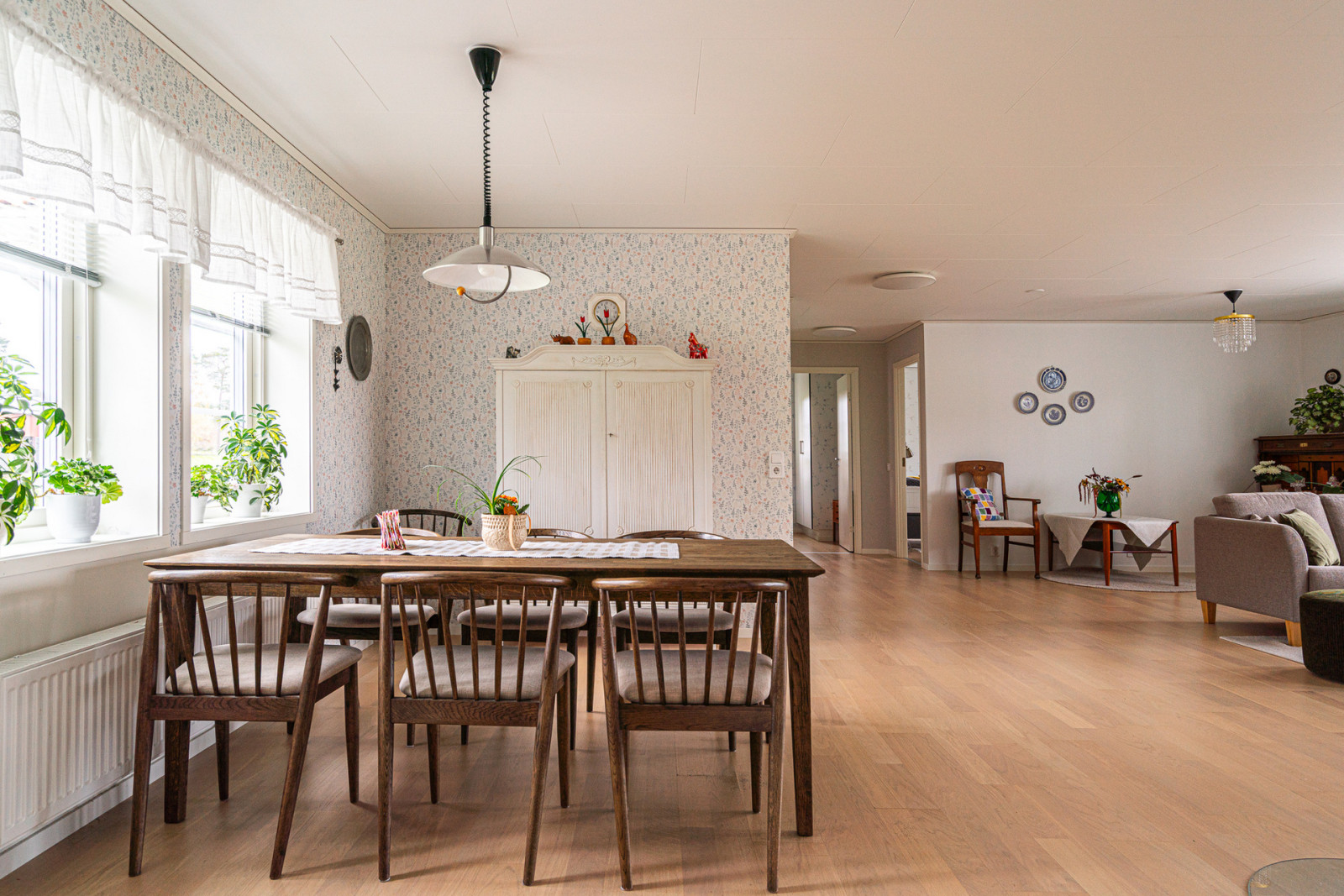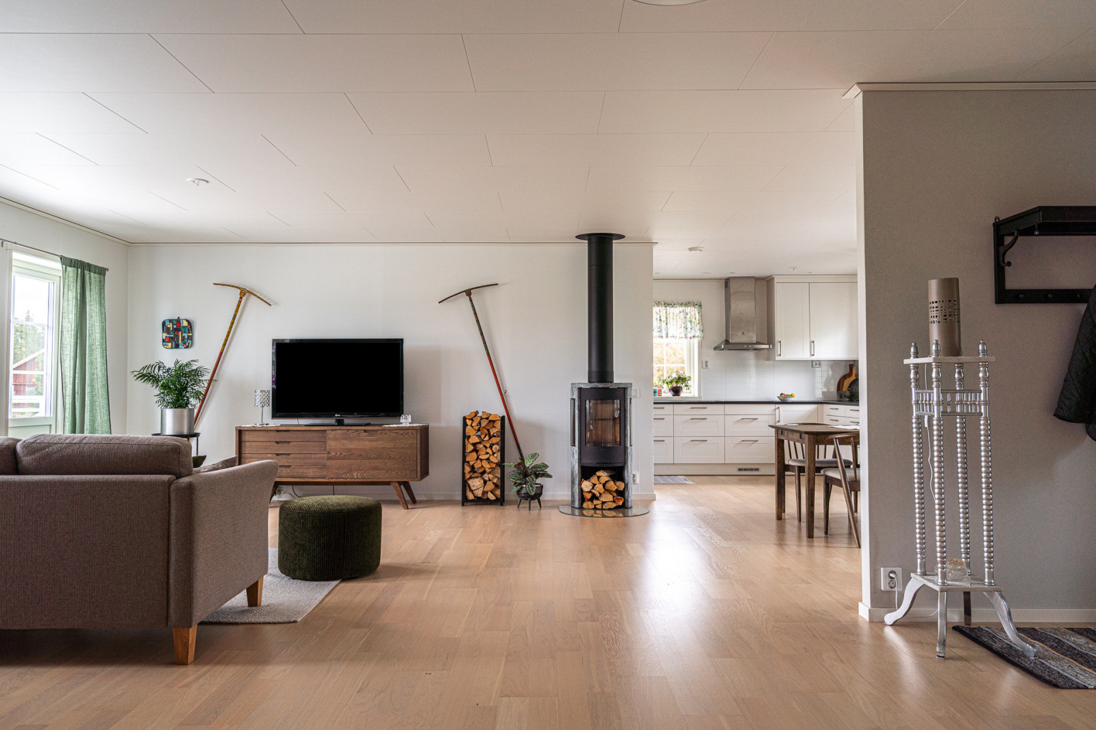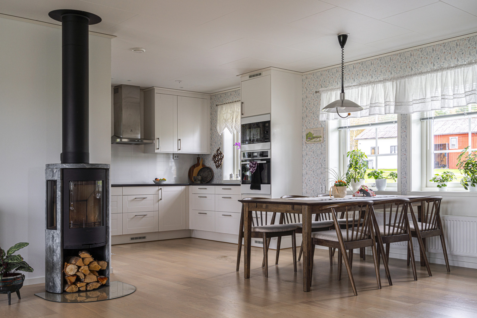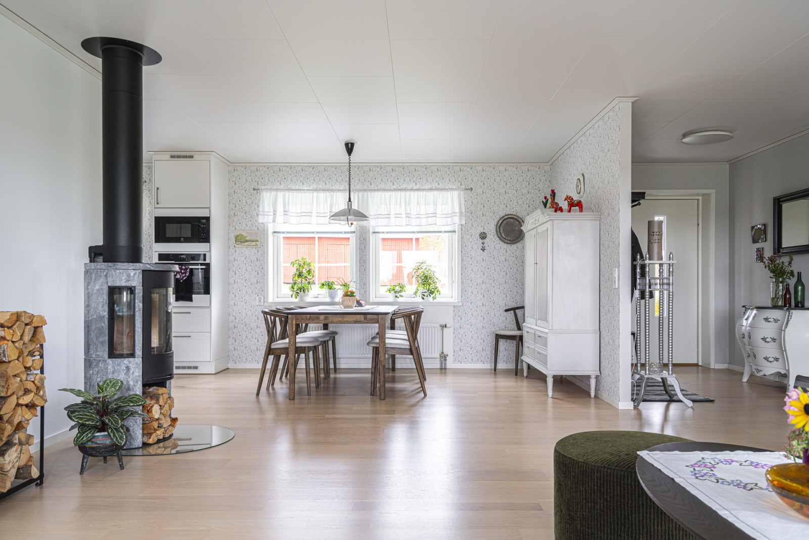 Uppvärmning sker genom frånluftsvärmepump, det finns även en Contura braskamin installerad för såväl värme som mysfaktor.