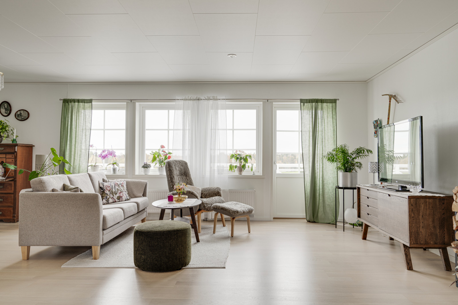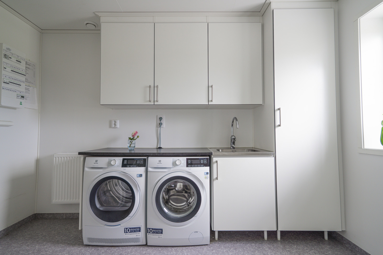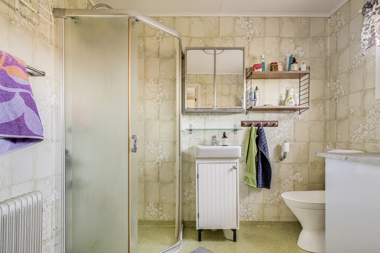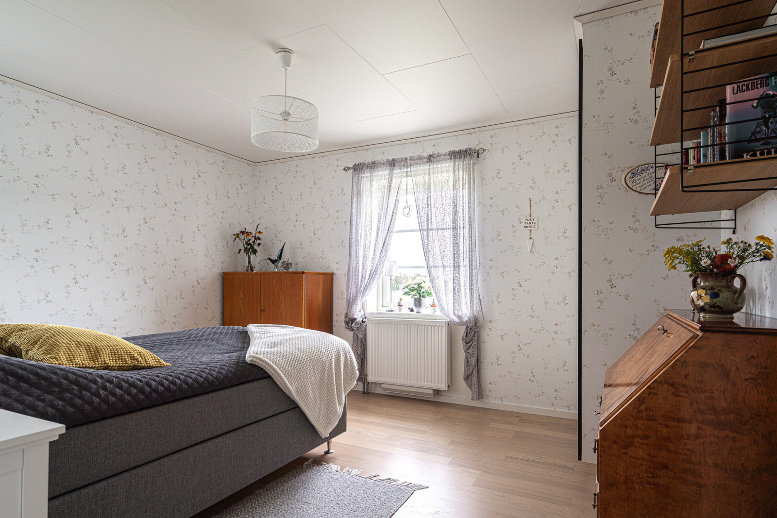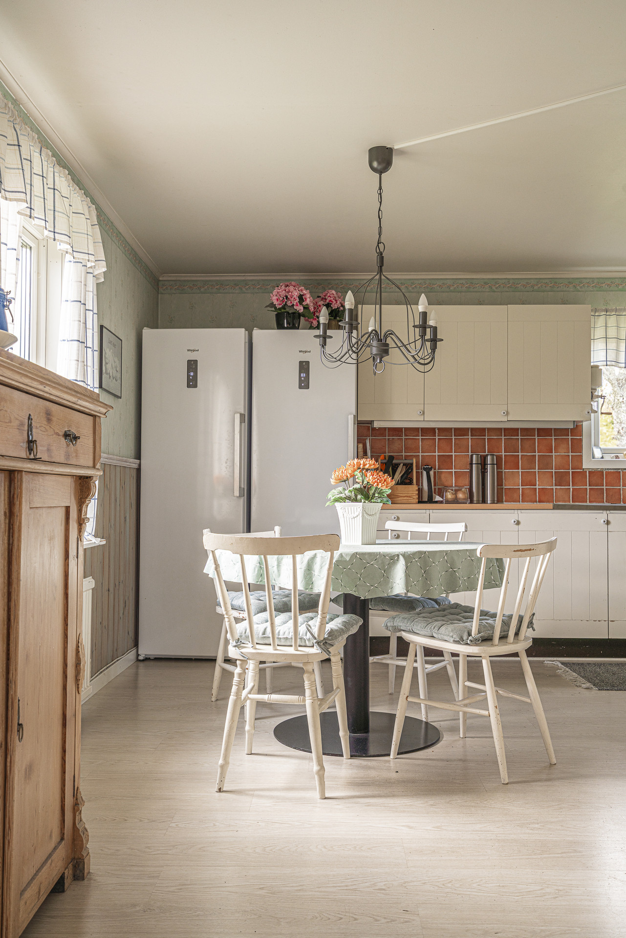 Uppvärmning sker genom frånluftsvärmepump, det finns även en Contura braskamin installerad för såväl värme som mysfaktor.