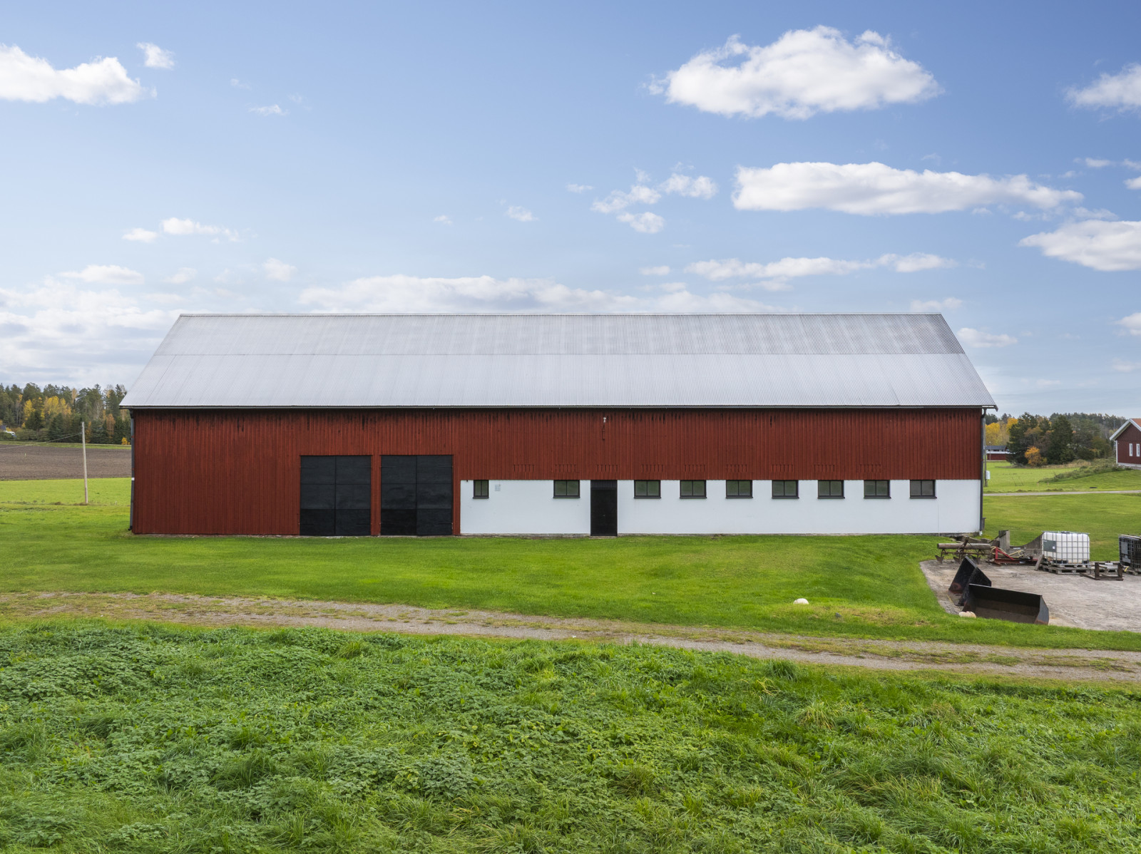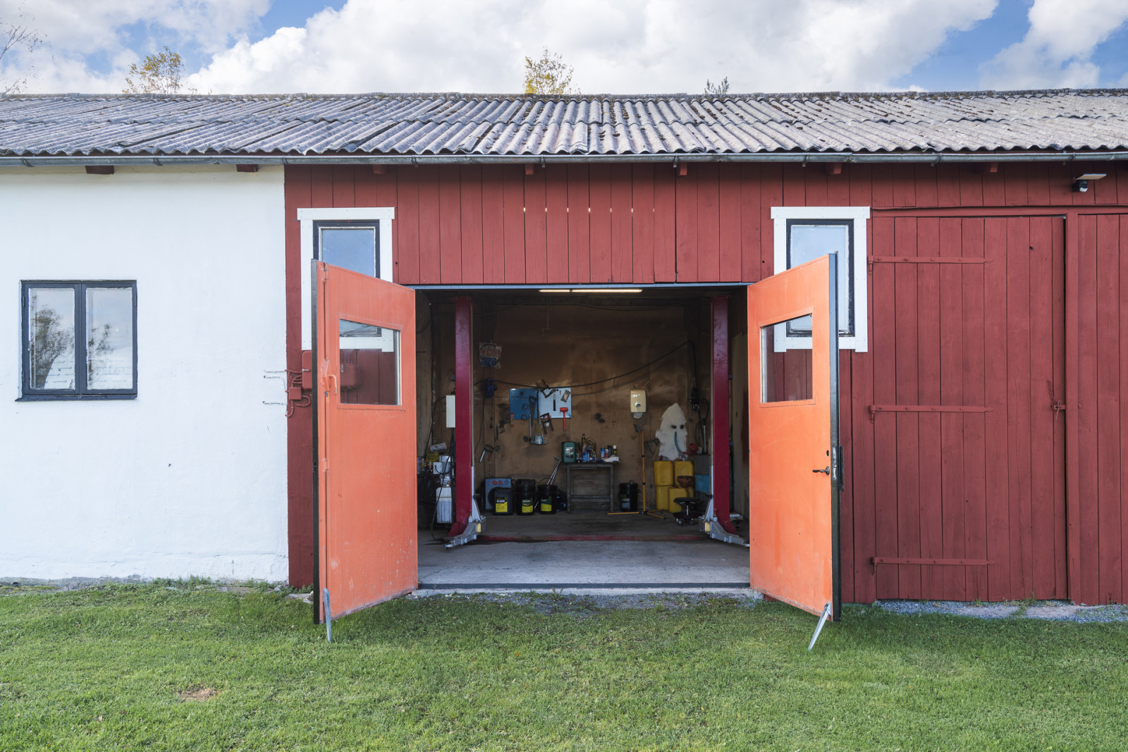 Vid infarten till gårdscentrum mitt emot bostadshuset finns en maskinhall och garagebyggnad. Byggnaden är uppförd på plintgrund/gjuten platta och har en murad stomme / stomme i trä. Fasad klädd i träpanel och taket är klädd i plåt och eternit. Södra delen rymmer en verkstad, följt av garage med pelarlyft. Vidare rymmer byggnaden även traktorgarage och förvaringsmöjligheter. Uppskattat byggnadsmått på mark 30 x 9 meter.