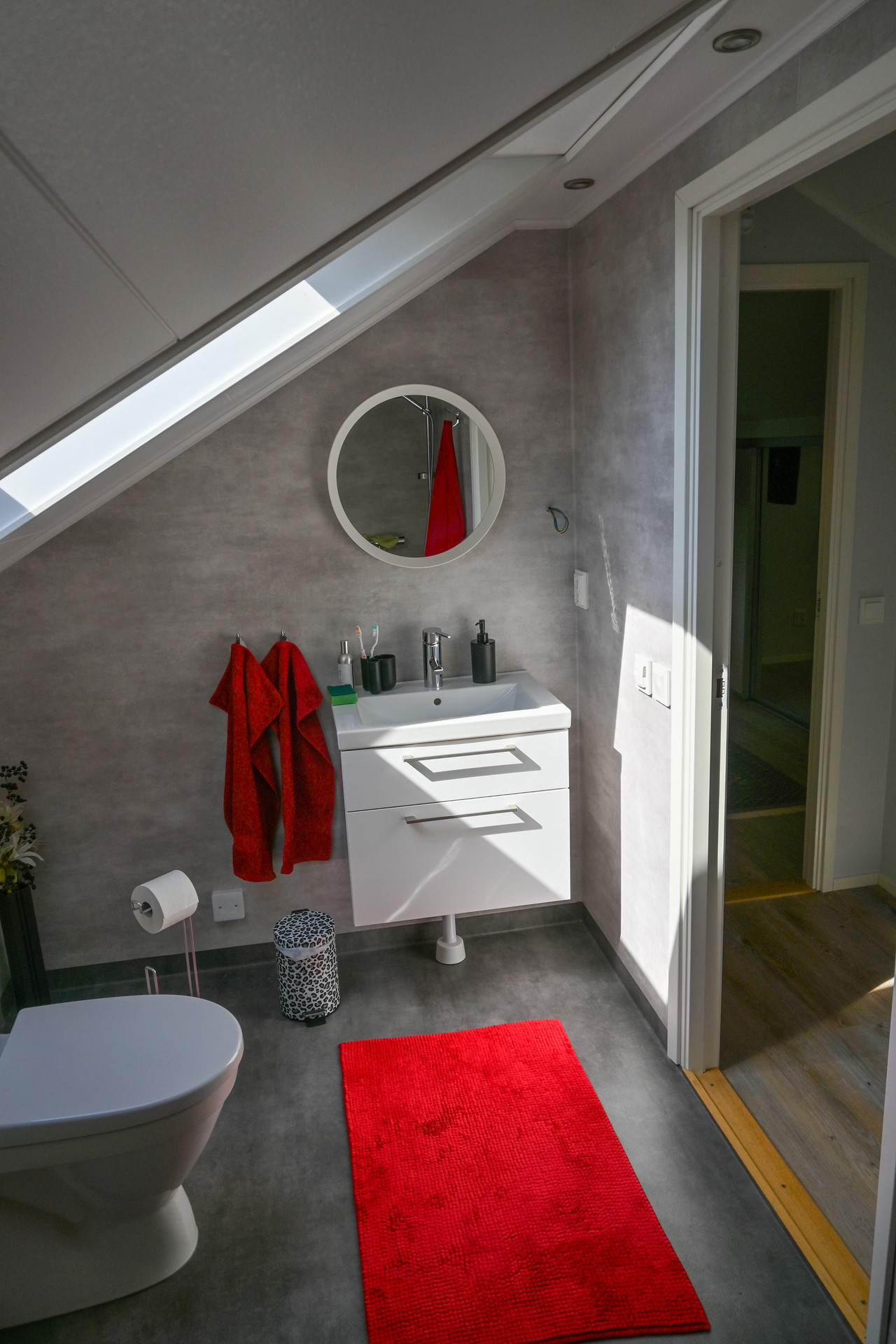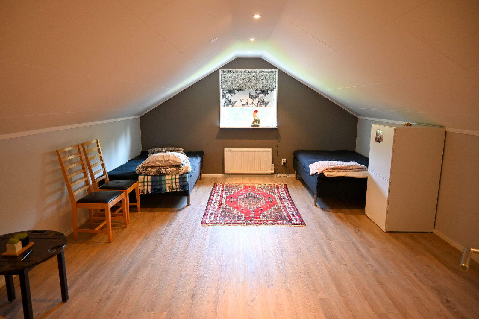 Övervåningen innefattar hall, rum/sovrum, sovrum med klädgarderob, förråd samt toalett/wc med dusch.