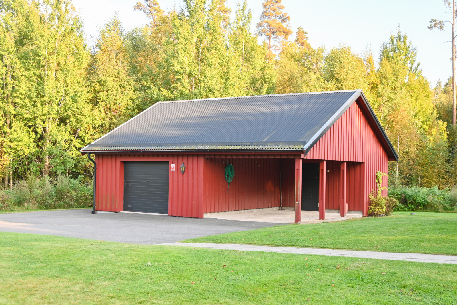 Uppfört i trä med plåttak och gjutet golv. Innefattar garage med plats för en bil, öppet till förrådsdel med hydrofor och vattenfilter. Uppvärmning via Daikin luftvärmepump. Carport med gjutet golv och plats för en bil.