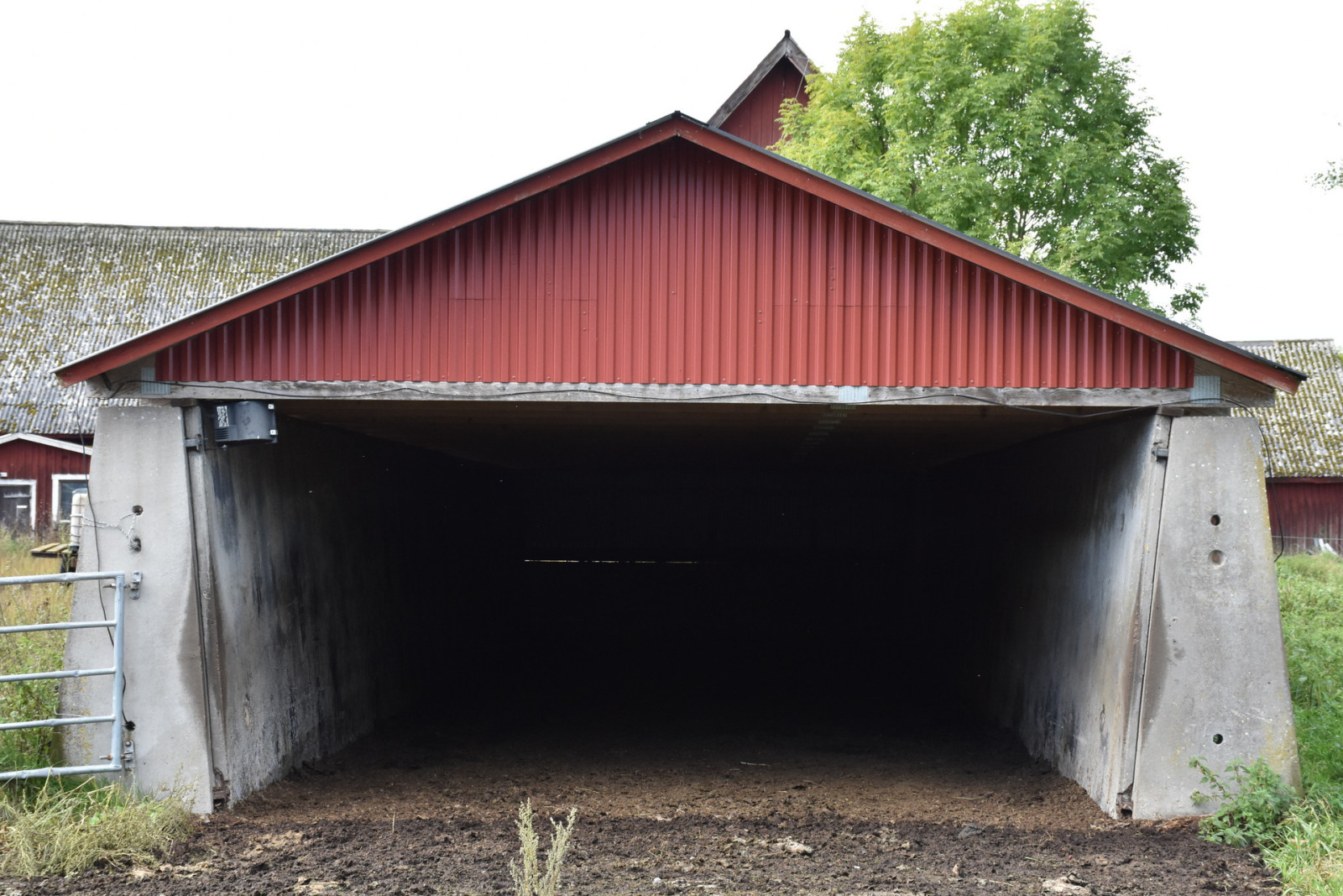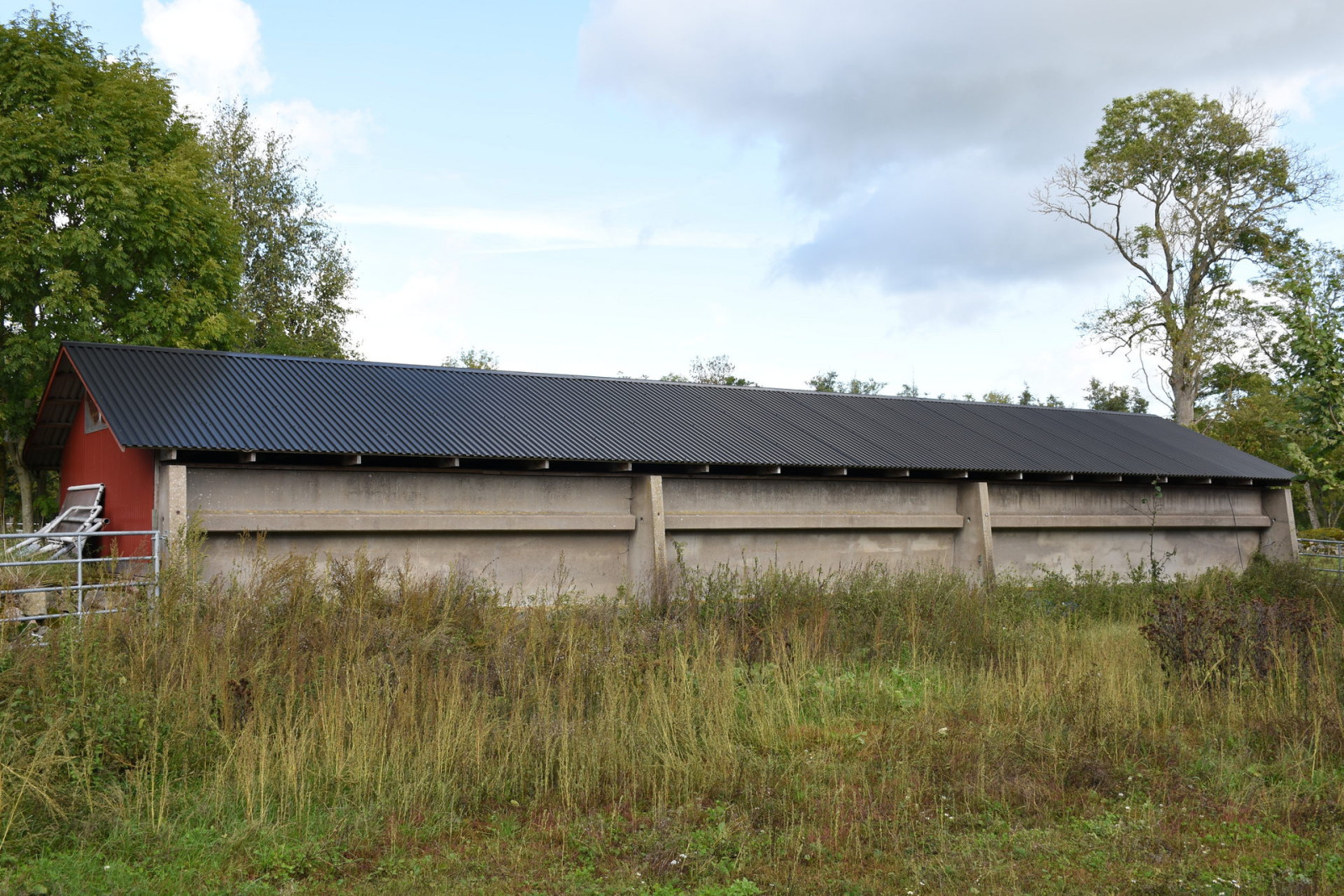 Plansilo med tak av plåt, byggnadsarea ca 130 m2. Låg takhöjd.