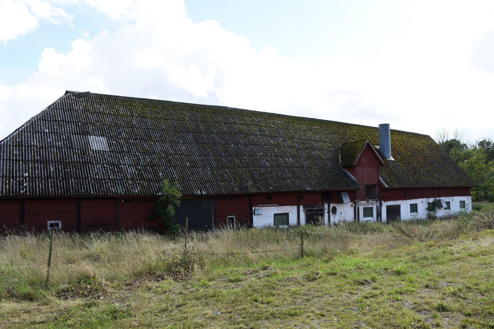 Ladugård i vinkel under tak av eternit. Uppskattad byggnadsarea ca 800 m2.