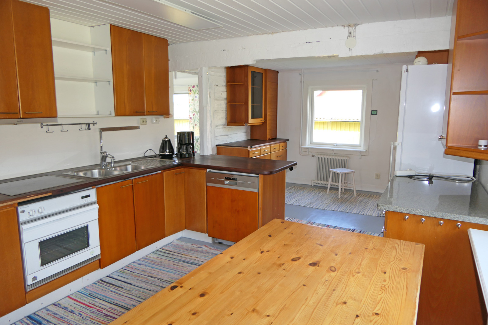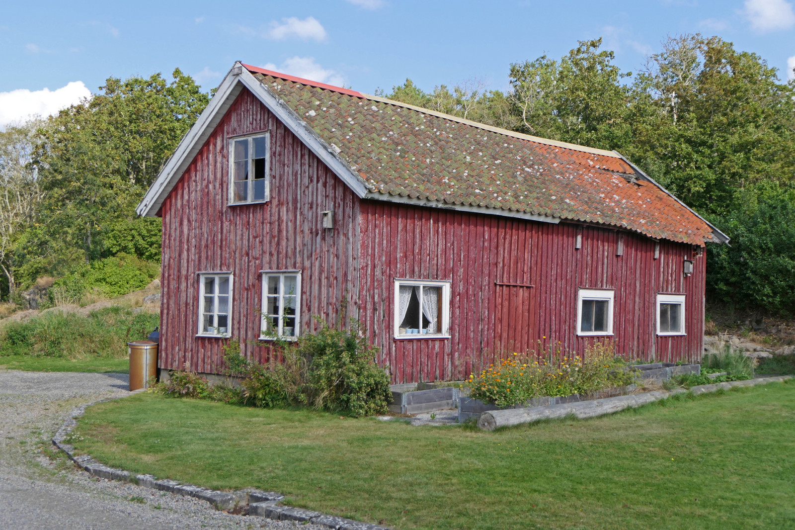 Äldre träbyggnad med eternittak, delvis byggd mot berg.
