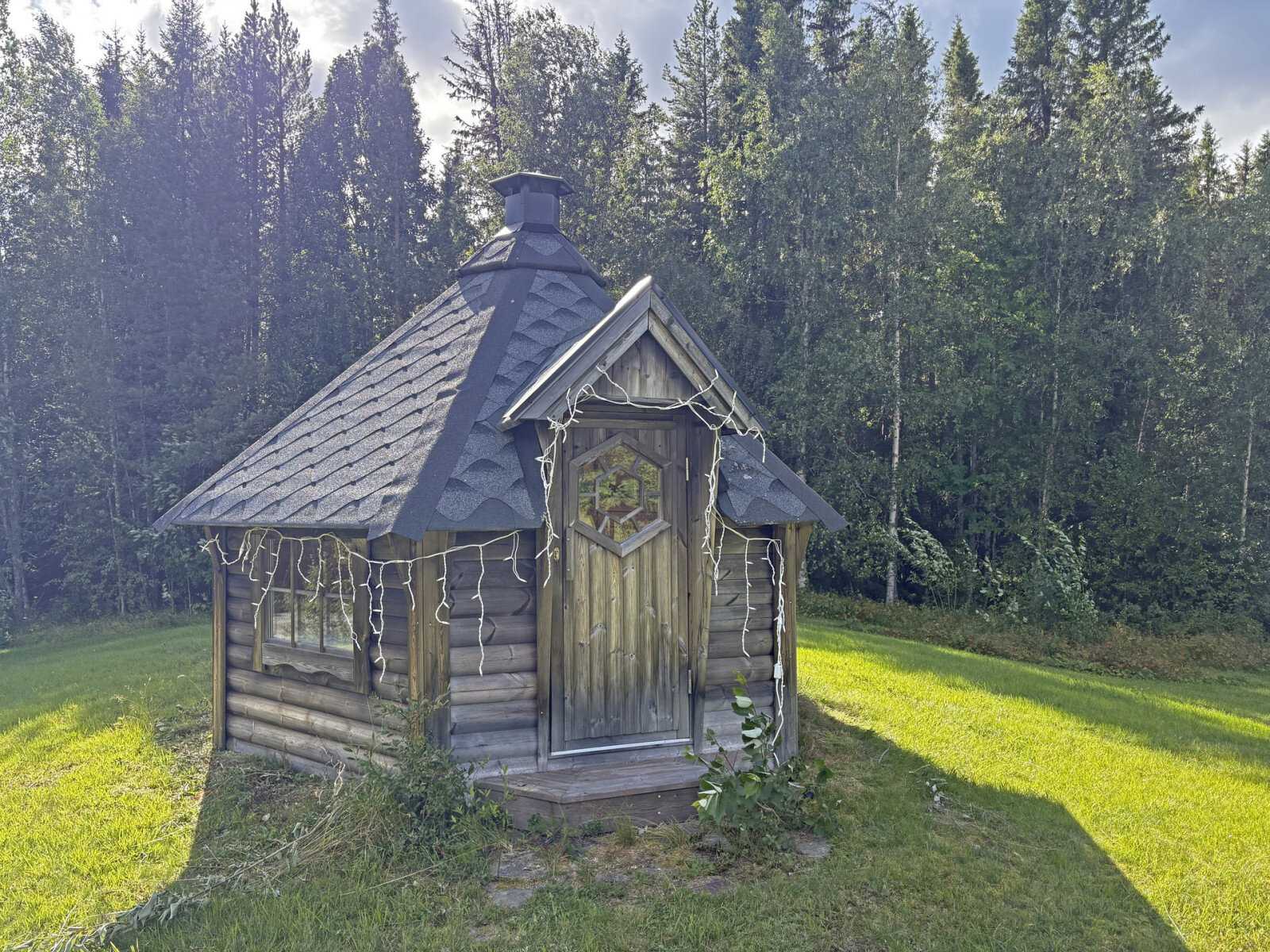 På tomten finns även en mycket trevlig grillkåta med eldstad och flertalet sittplatser. Denna inbjuder till trevligt umgänge intill elden. Byggnaden har papptak och träfasad. Inne i grillkåtan finns en eldstad med tillhörande skorsten.