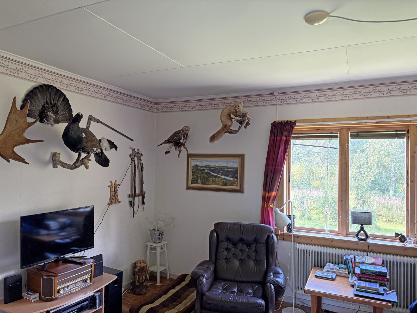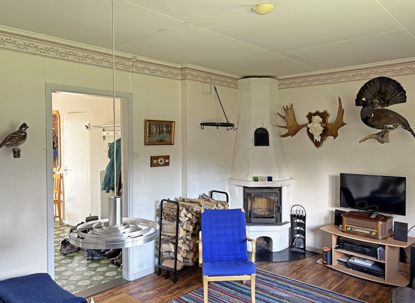 Vardagsrum: Trivsamt vardagsrum med ljusinsläpp från fönster samt en braskamin som bidrar med såväl värme som en förhöjd mysfaktor.