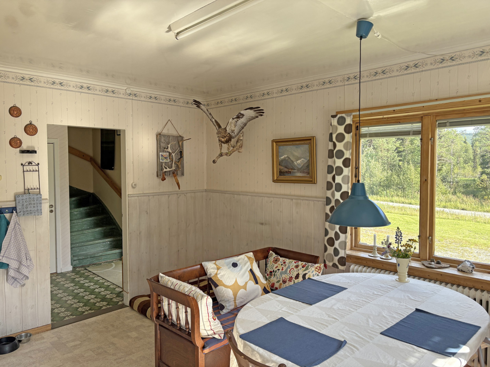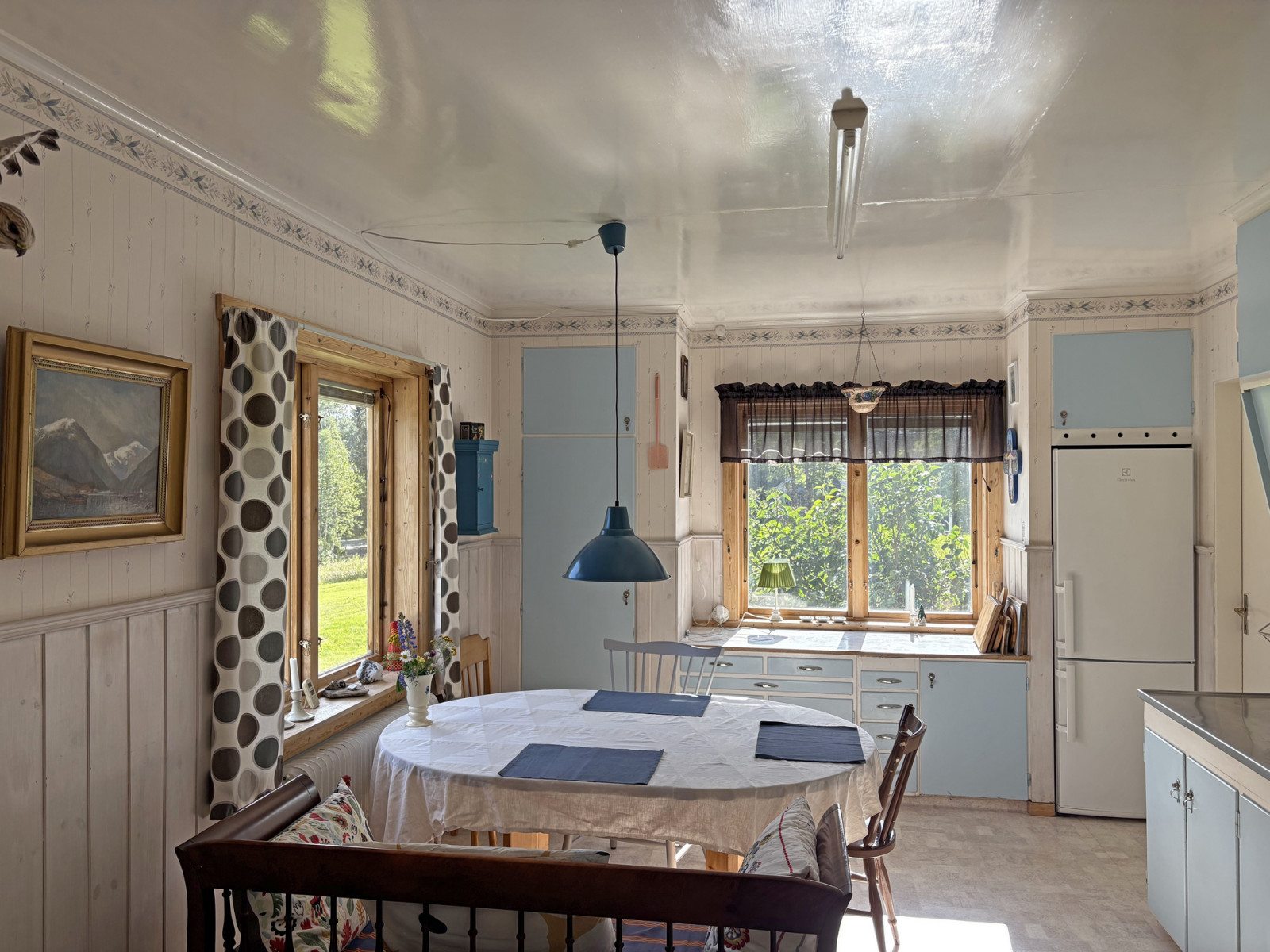 Kök: Stort och trevligt lantkök med bra ljusinsläpp från två väderstreck. Köket har spis, fläkt, kyl/frys(halvhöjd) och skafferi. I köket finns såväl arbets- som förvaringsyta.