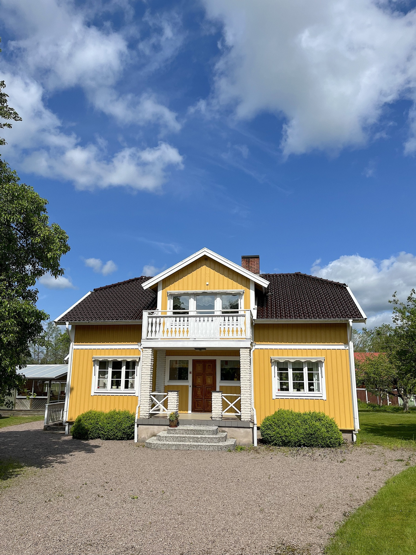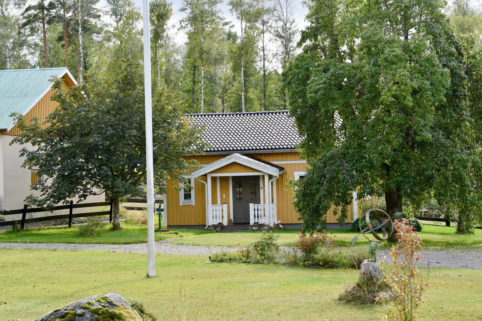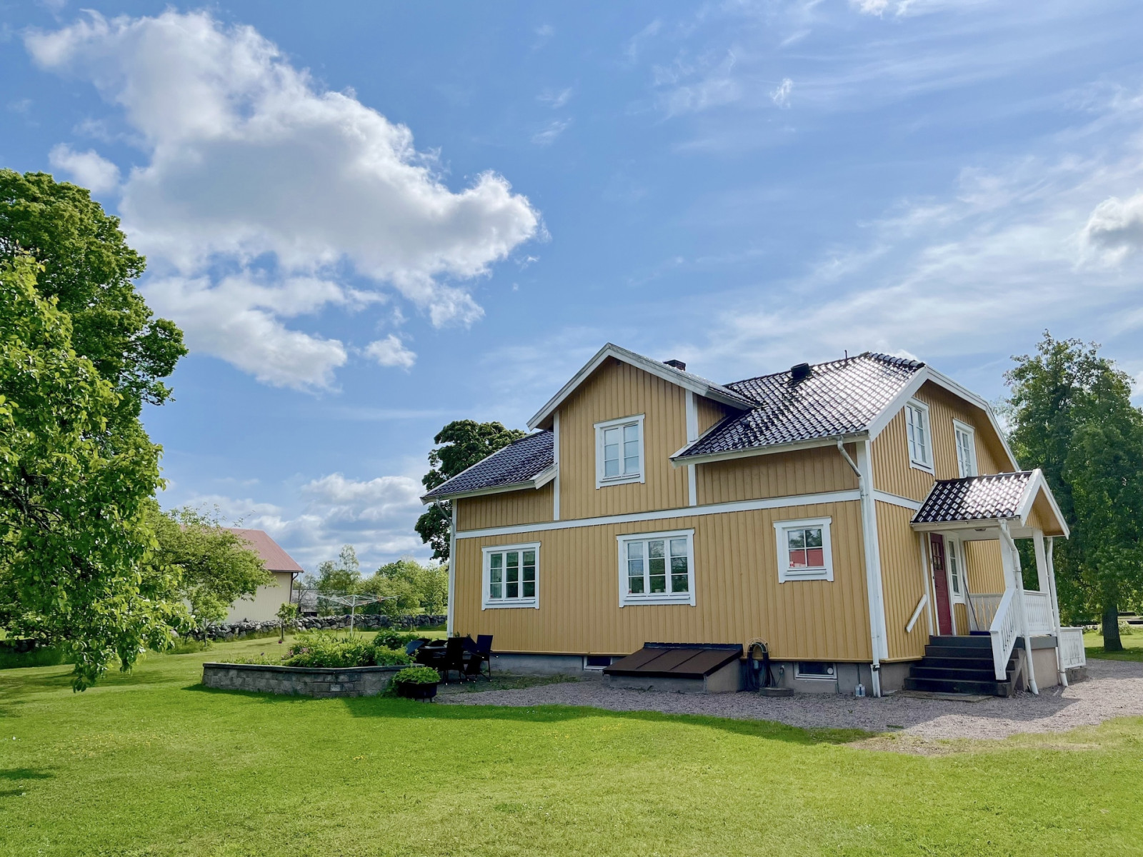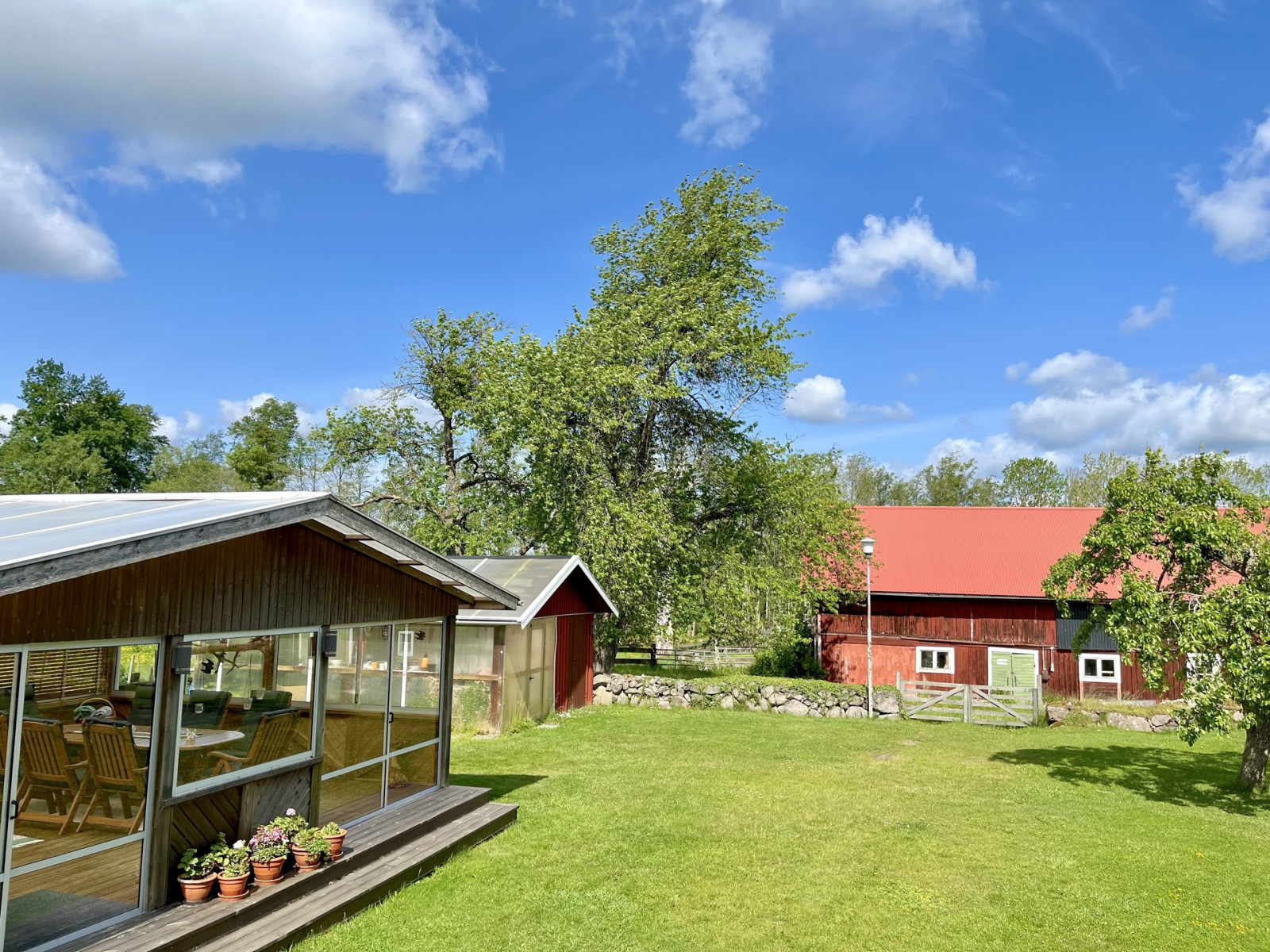 Invid mangårdsbyggnaden ligger ett friliggande, inglasat uterum samt ett växthus.