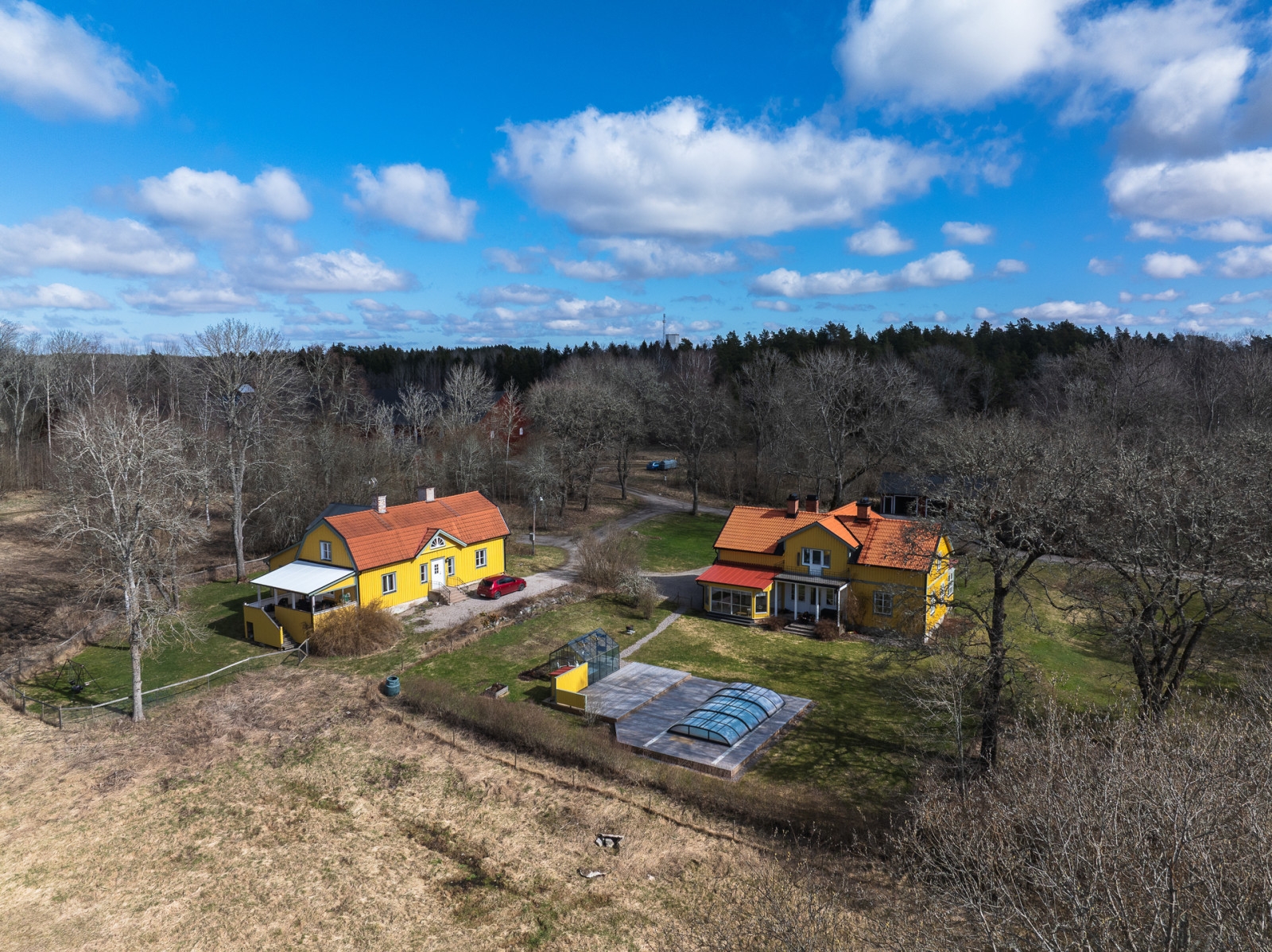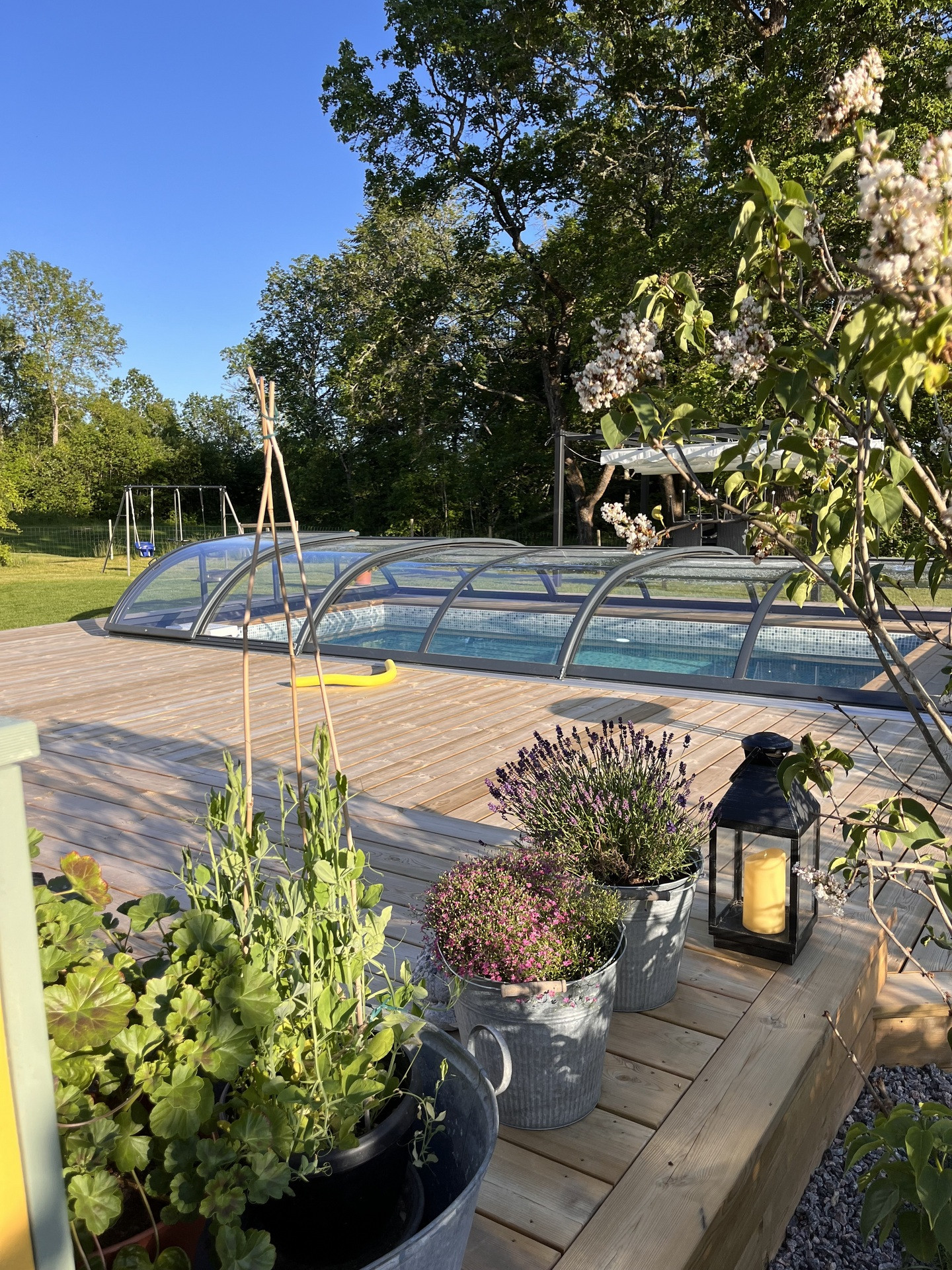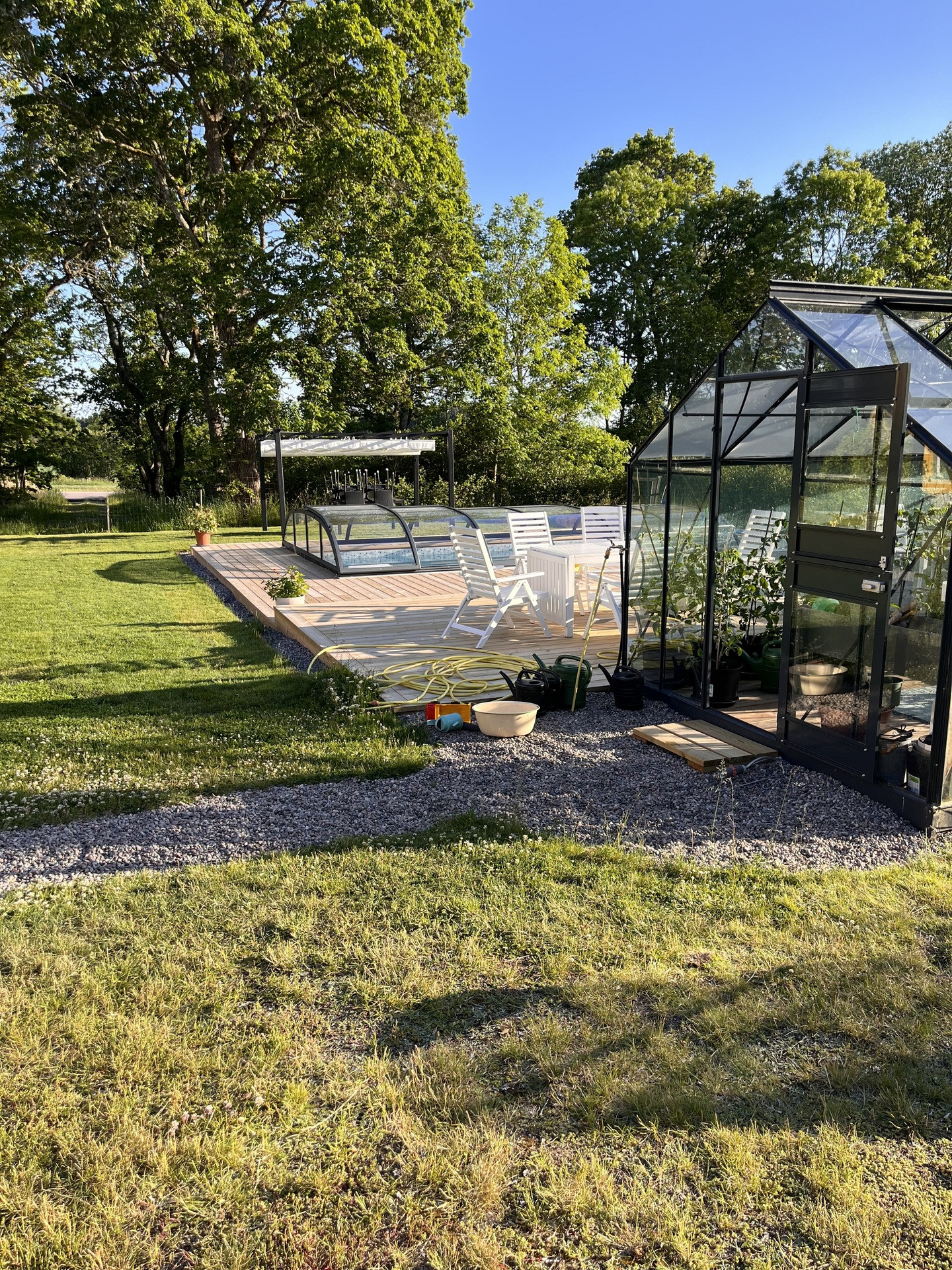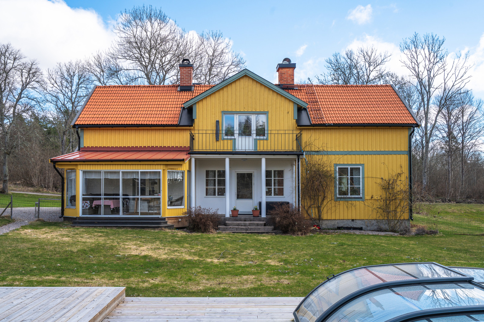 På baksidan av mangårdsbyggnaden finns en pool uppförd 2025 med kringliggande trätrall. Intill trätrallen finns en bod för reningsverk och uppvärmning till poolen. Bredvid poolområdet finns ett växthus på 10 kvm.