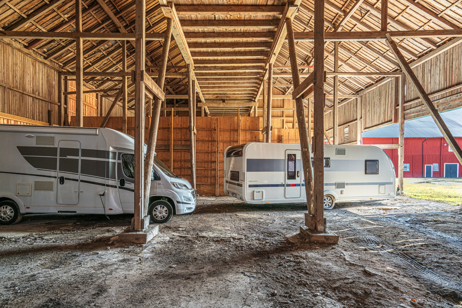 Sydväst om forna ladugården och maskinhallen finns ett traktorgarage. Byggnaden är uppförd i trä på gjutna plintar och taket har belagts med nylagd plåt från år 2021. Underlaget i hela byggnaden är stampat grus. Traktorgaraget har ett mått på cirka 21 x 7 meter och en takhöjd på 3 meter. På långsidan finns det tre öppna fack och ett större fack på gaveln. Byggnaden används som vinterförvaring av husvagnar och husbilar, det finns fyra platser i byggnaden.