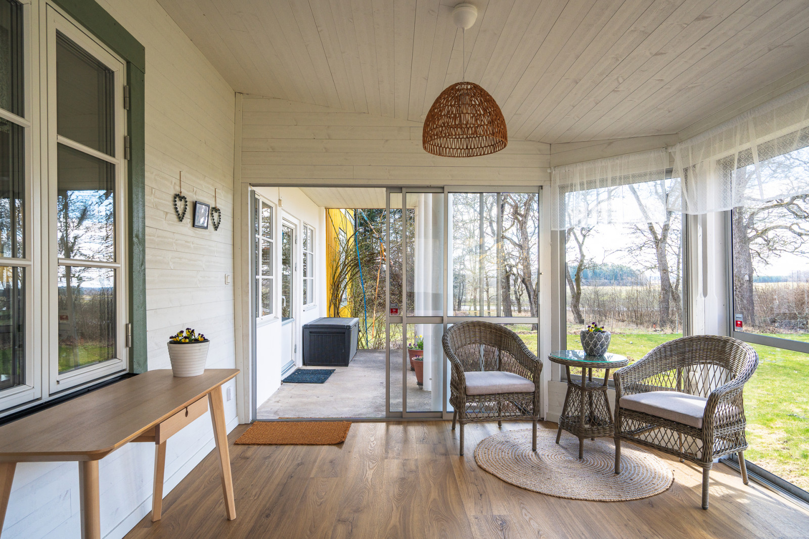 På den västra gaveln finns en uppförd uteplats delvis inglasad. Flygelbyggnaden har en boyta på 149 kvm enligt taxeringsuppgifter. Altanen är 6 x 3,5 meter. Byggnaden har under 2017 genomgått en omfattande renovering på undervåningen. Golven är utbytta med nya bjälklag, isolering och laminatgolv. I köket byttes underskåpen och vitvaror bytta från 2017-2025 samt att ytskikt målades. Det som inte har renoverats är badrummet på nedervåningen. Flygelbyggnaden är uthyrd.