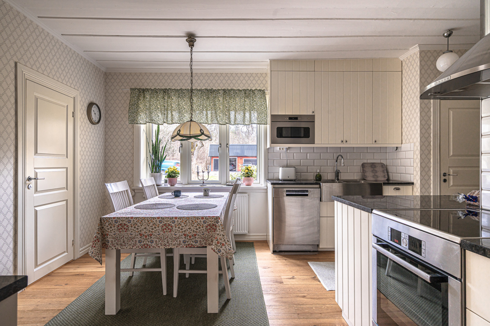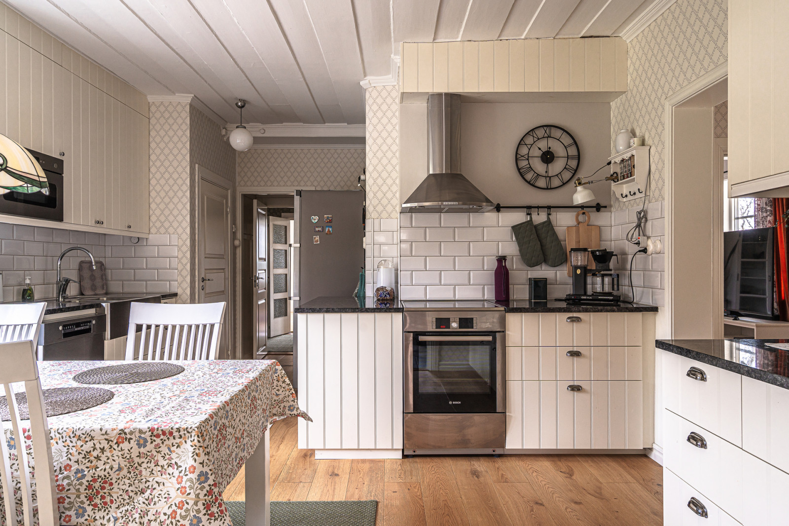 Köket renoverades 2019 med luckor och stommar från Ikea, nya bänkskivor med granitsten och nya vitvaror. Köket har även nytt golv. I hörnet finns ett stort skafferi, där även elcentralen med jordfelsbrytare är installerat. I den andra delen mot hallen finns en dörr till källaren.