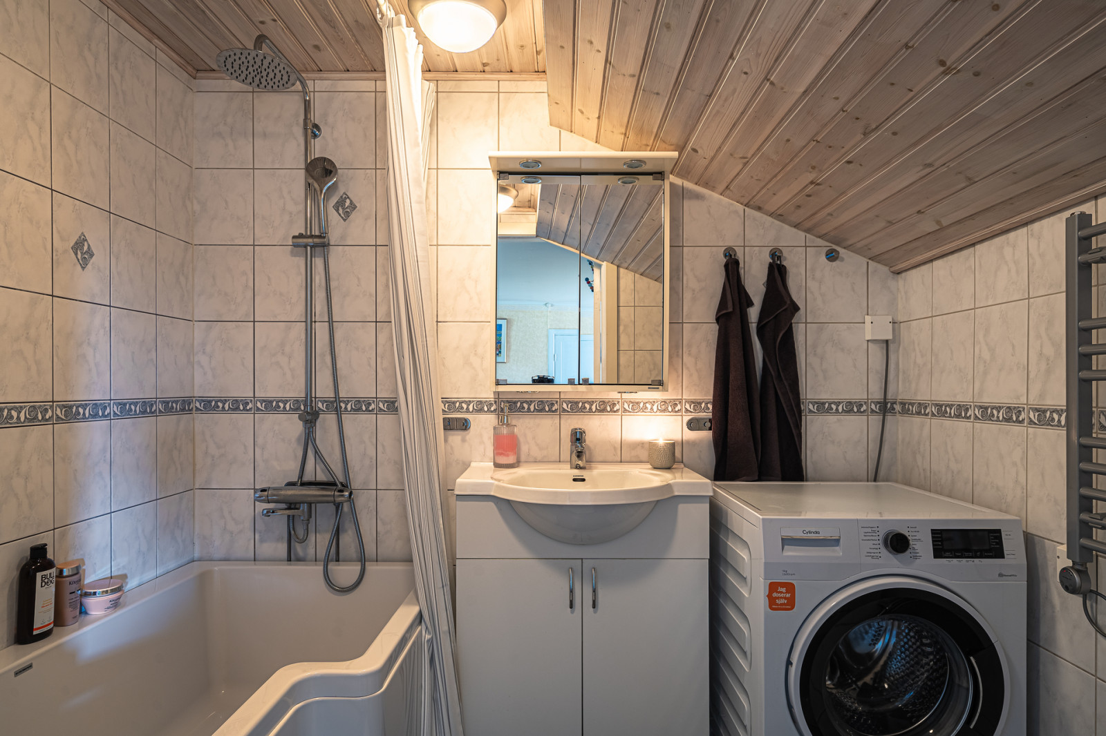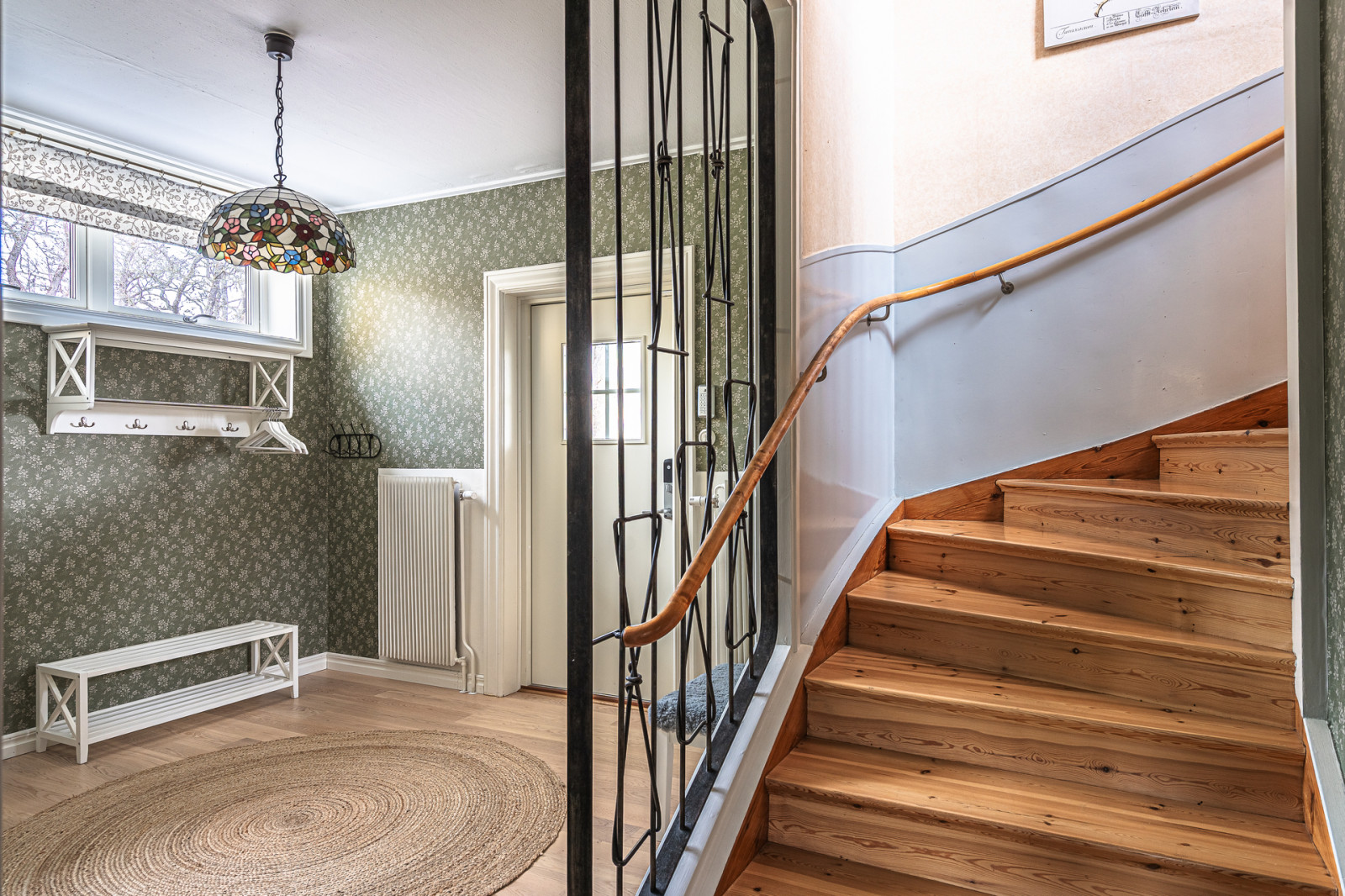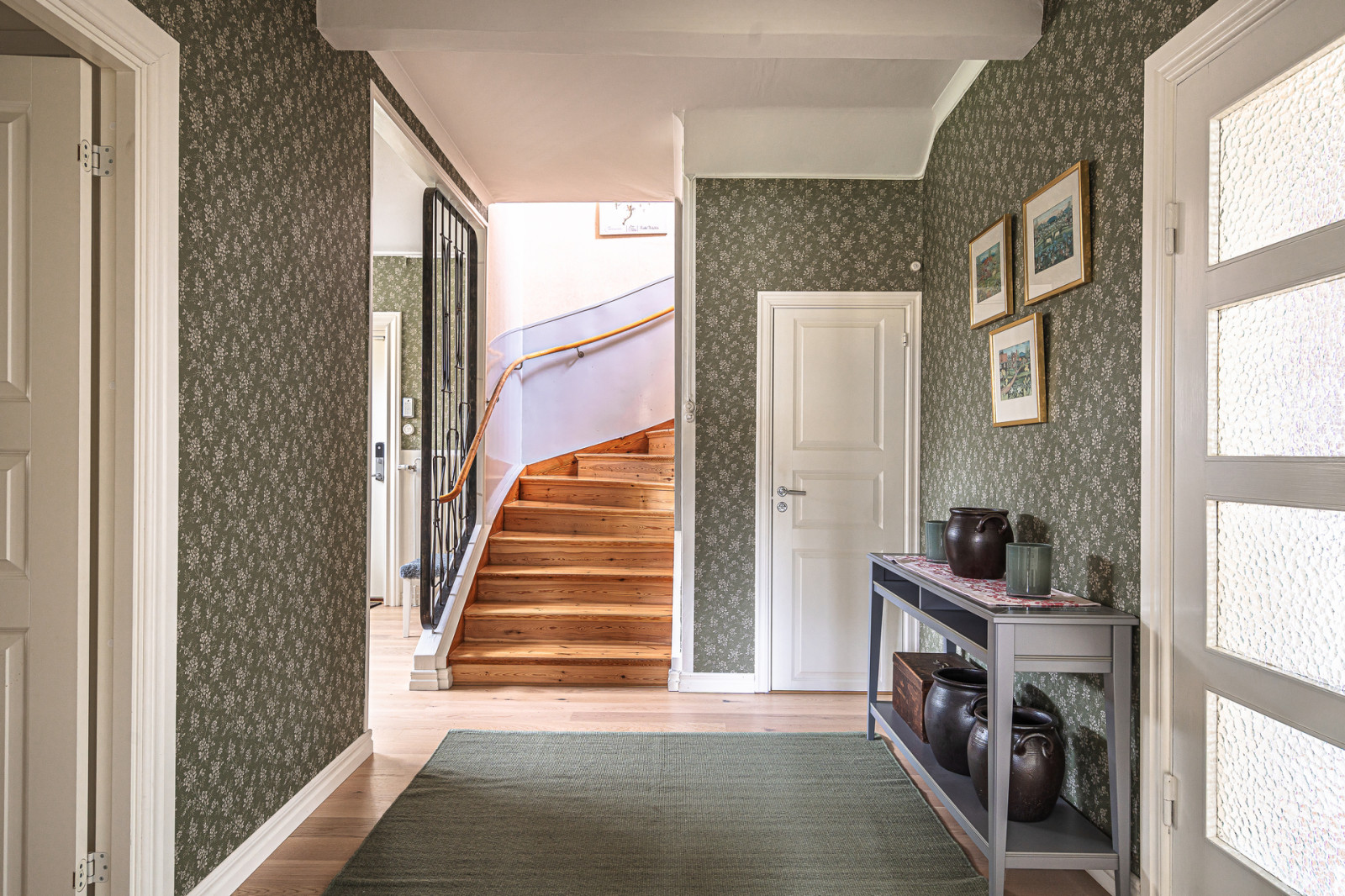 Övre plan fördelas på en stor hall med golv av fiskbensparkett och öppen spis, från hallen finns utgången till balkongen på baksidan av huset. I högra hörnet av hallen finns en tvättbänk med en torktumlare installerat. Till höger om hallen ligger även ett badrum med badkar, dusch, handfat och WC samt ett mindre sovrum. Intill badrummet ligger ett större sovrum med ekgolv och två stora kattvindar. Till vänster om hallen finns en större kattvind följt av ett kontorsrum med 3 kattvindar och platsbyggda garderober.