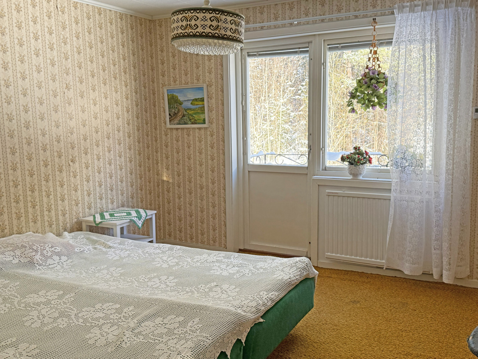 Övre plan med möblerbar hall, två sovrum samt 3 mindre sovrum/förråd med snedtak. Klädkammare/genomgångsrum.