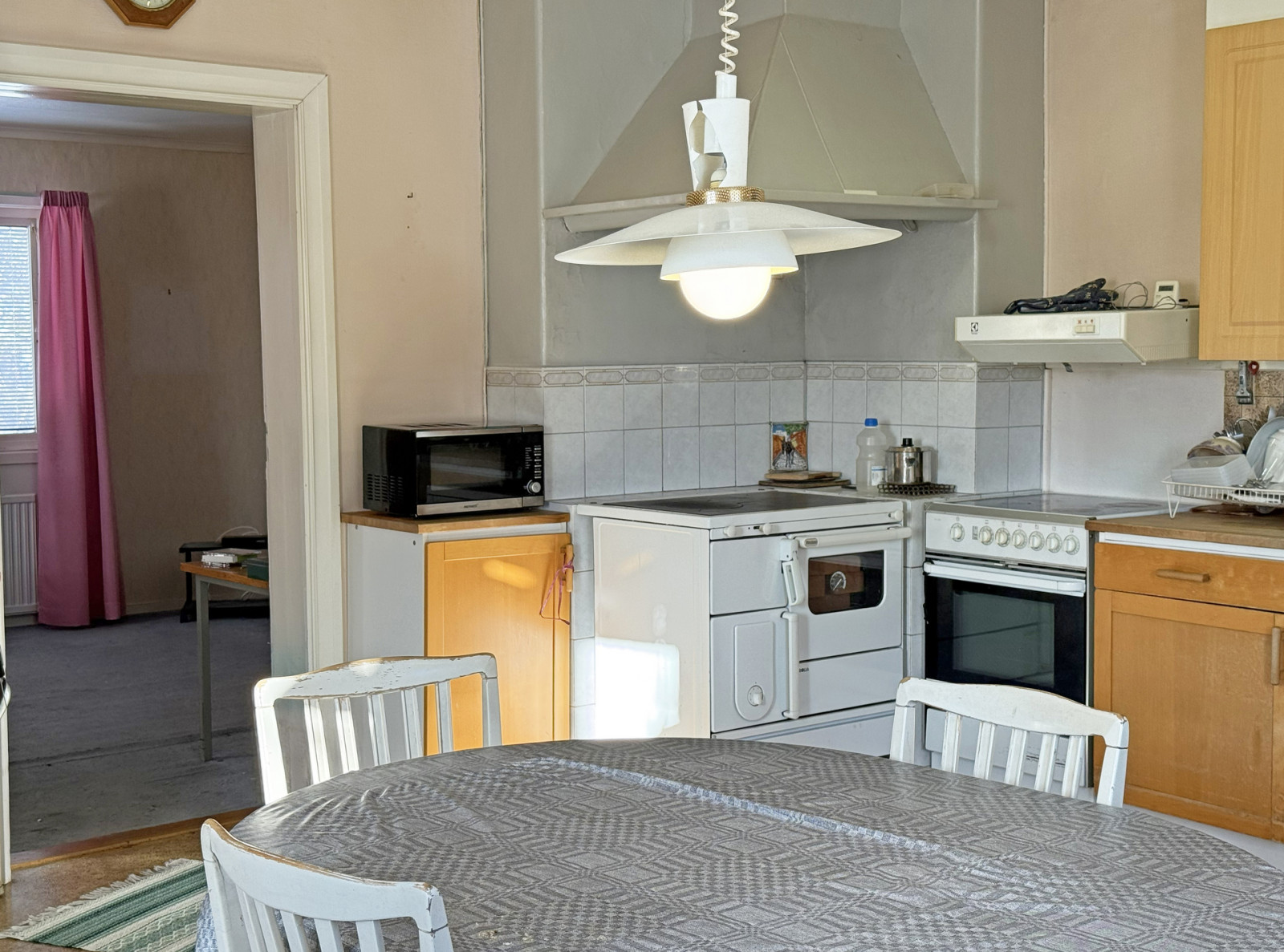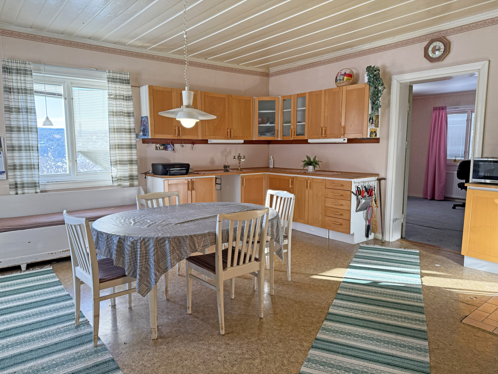 Köket är inrett med diskbänk i plåt, vedspis, elspis, fläkt, micro samt kyl och frys.